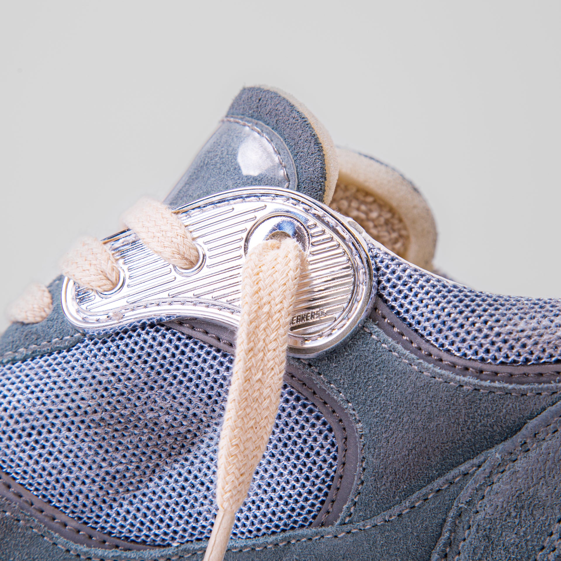 Tomaia in pelle scamosciata colore blu con inserti di rete.