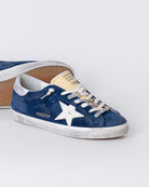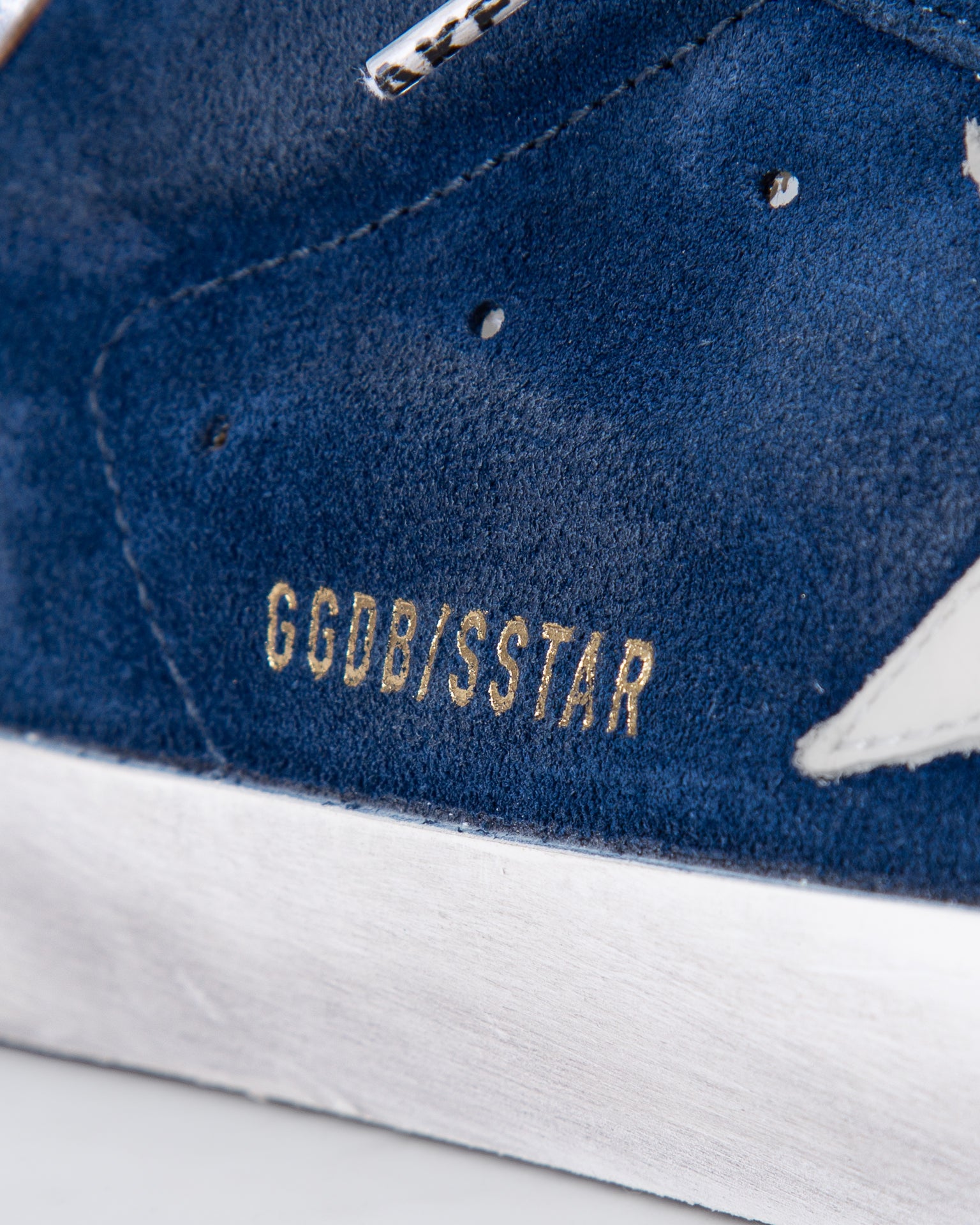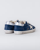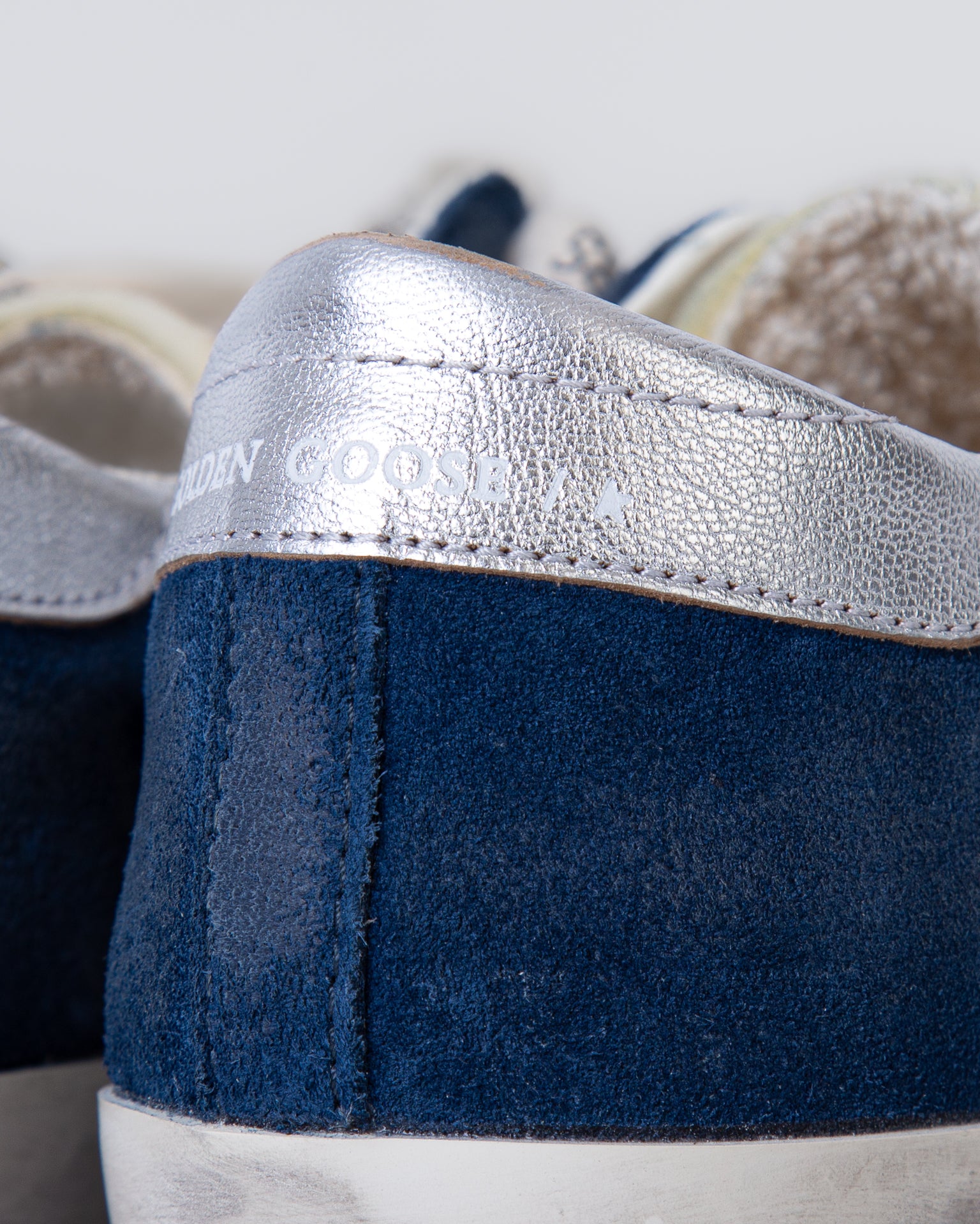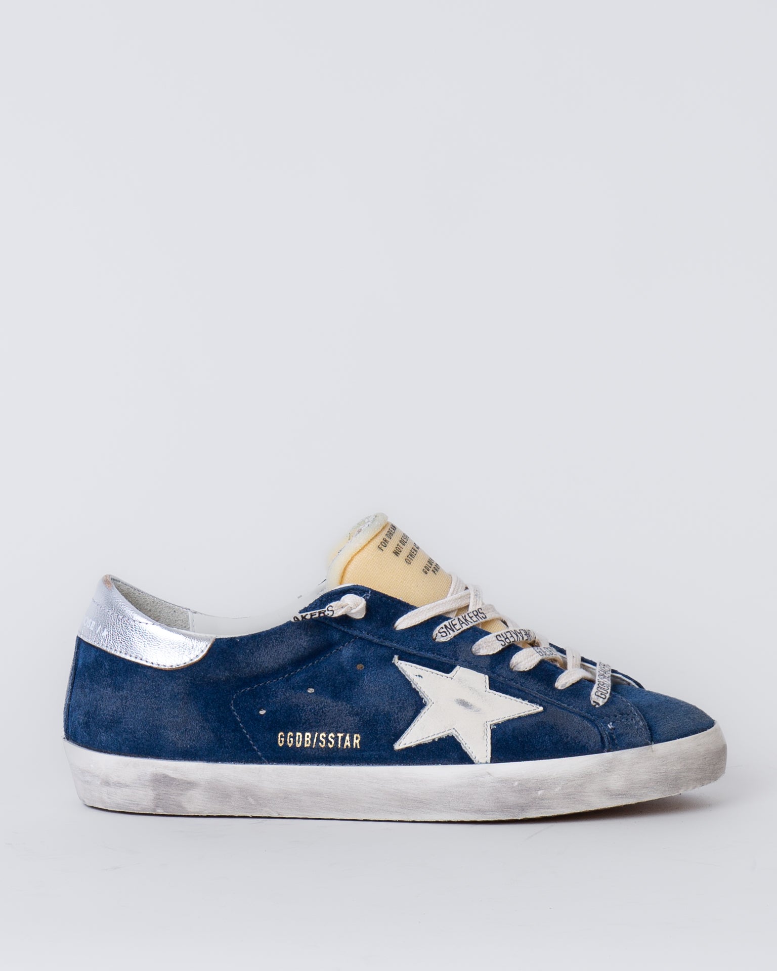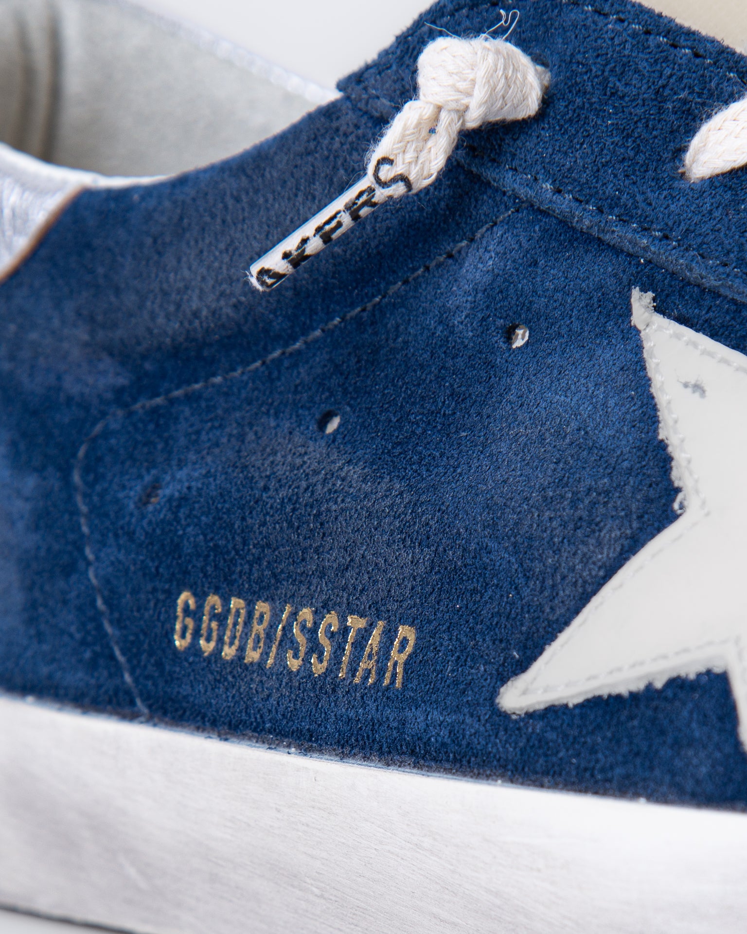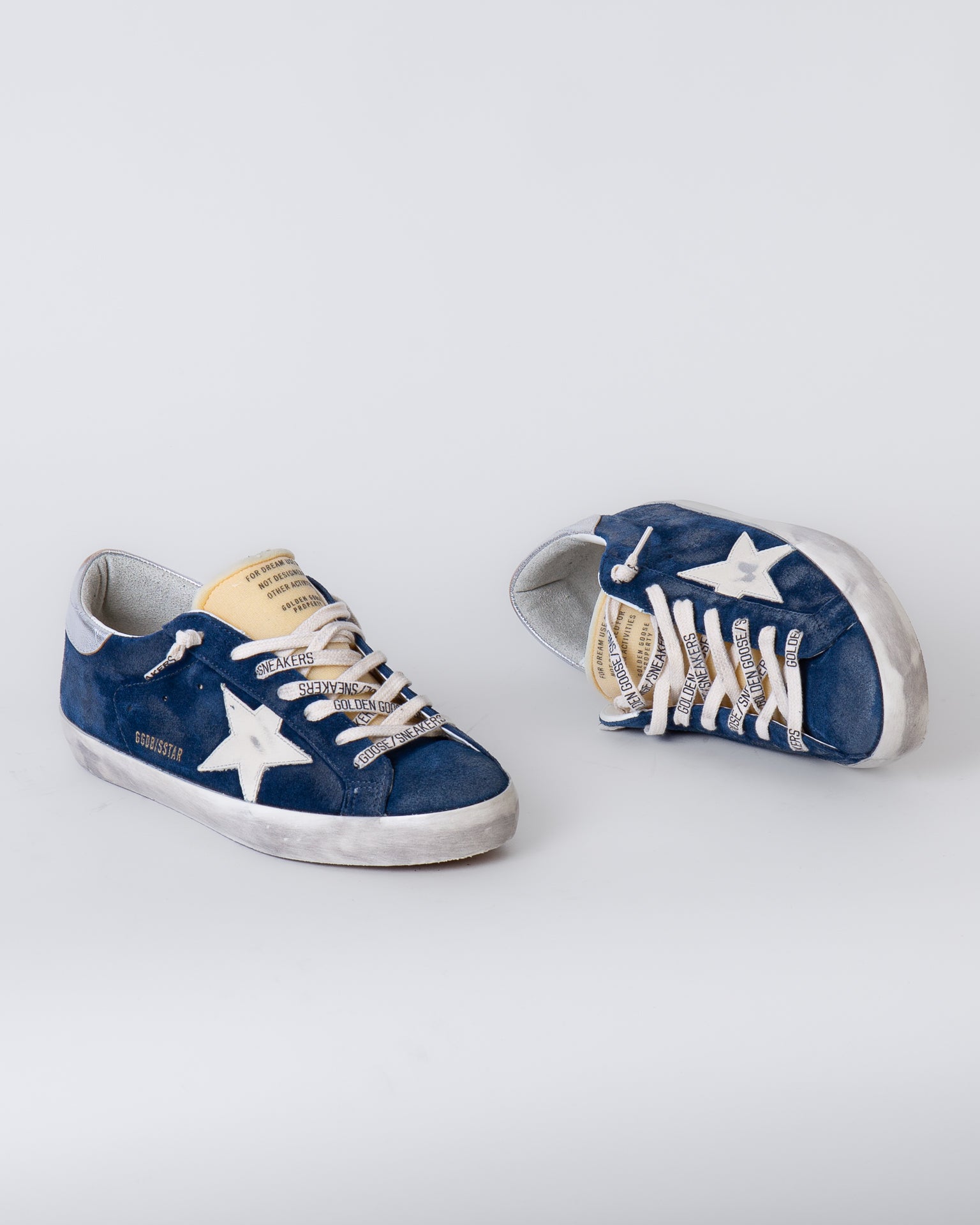 Golden Goose, sneakers uomo GMF00101.F007531 50937 blu, superstar camoscio blu con talloncino argento. La scarpa scattata è una taglia 42