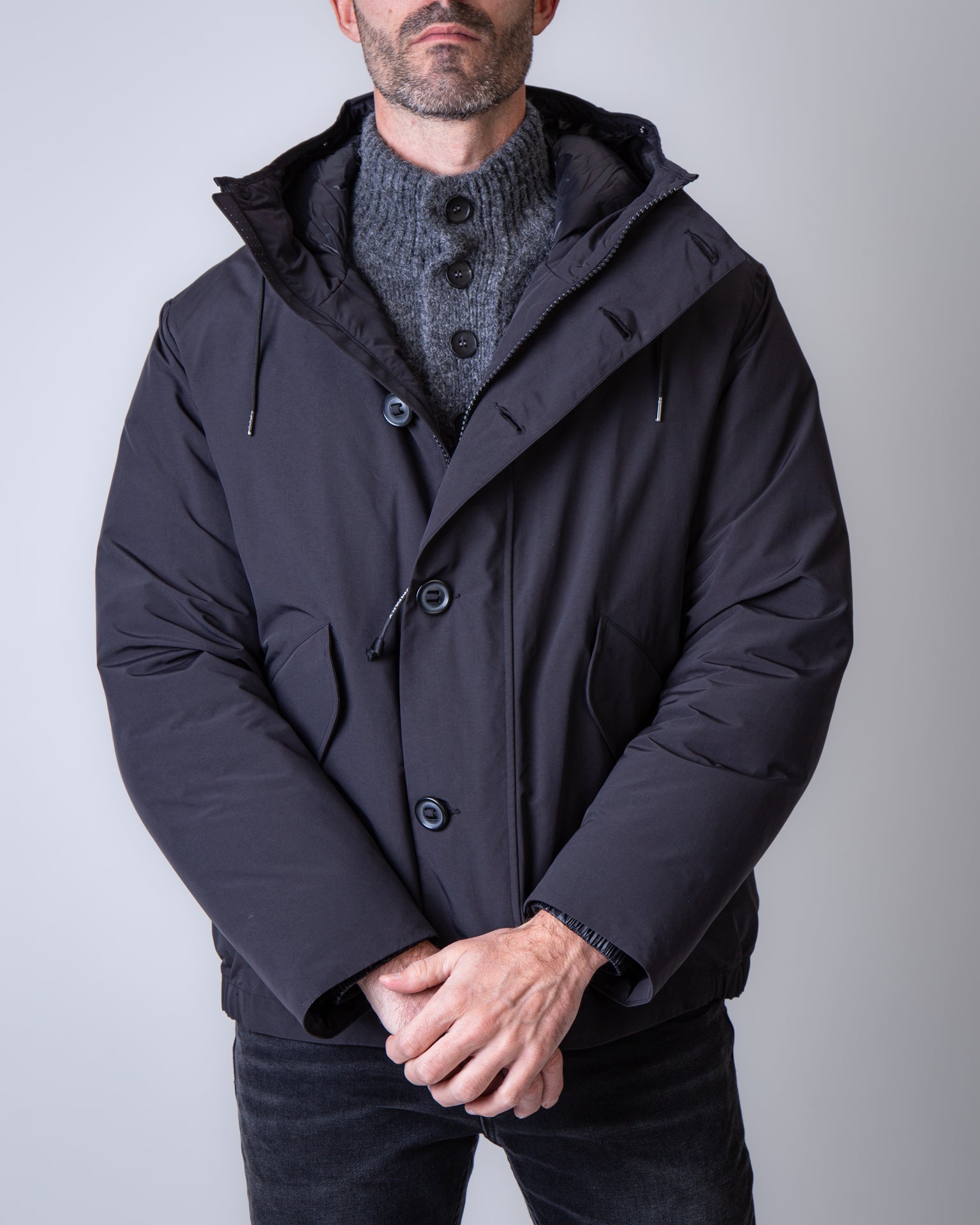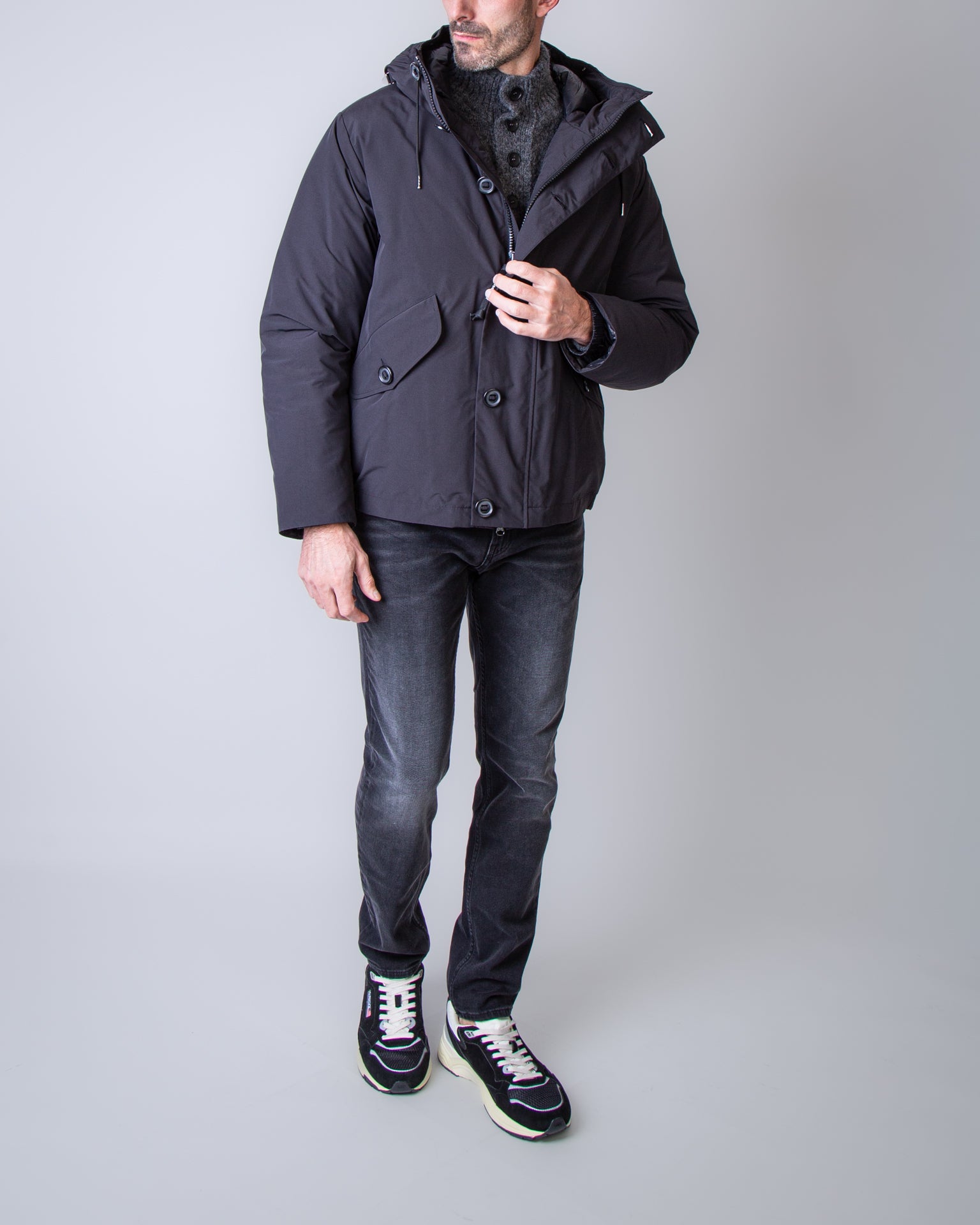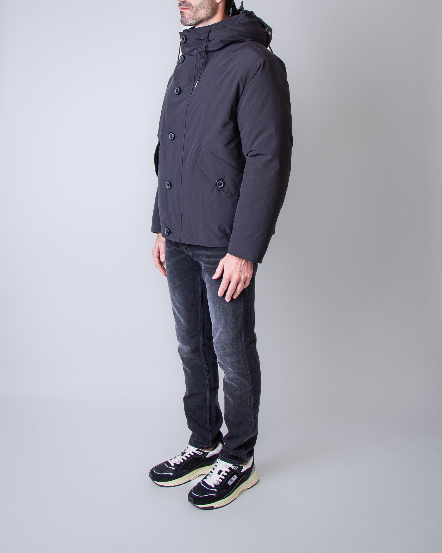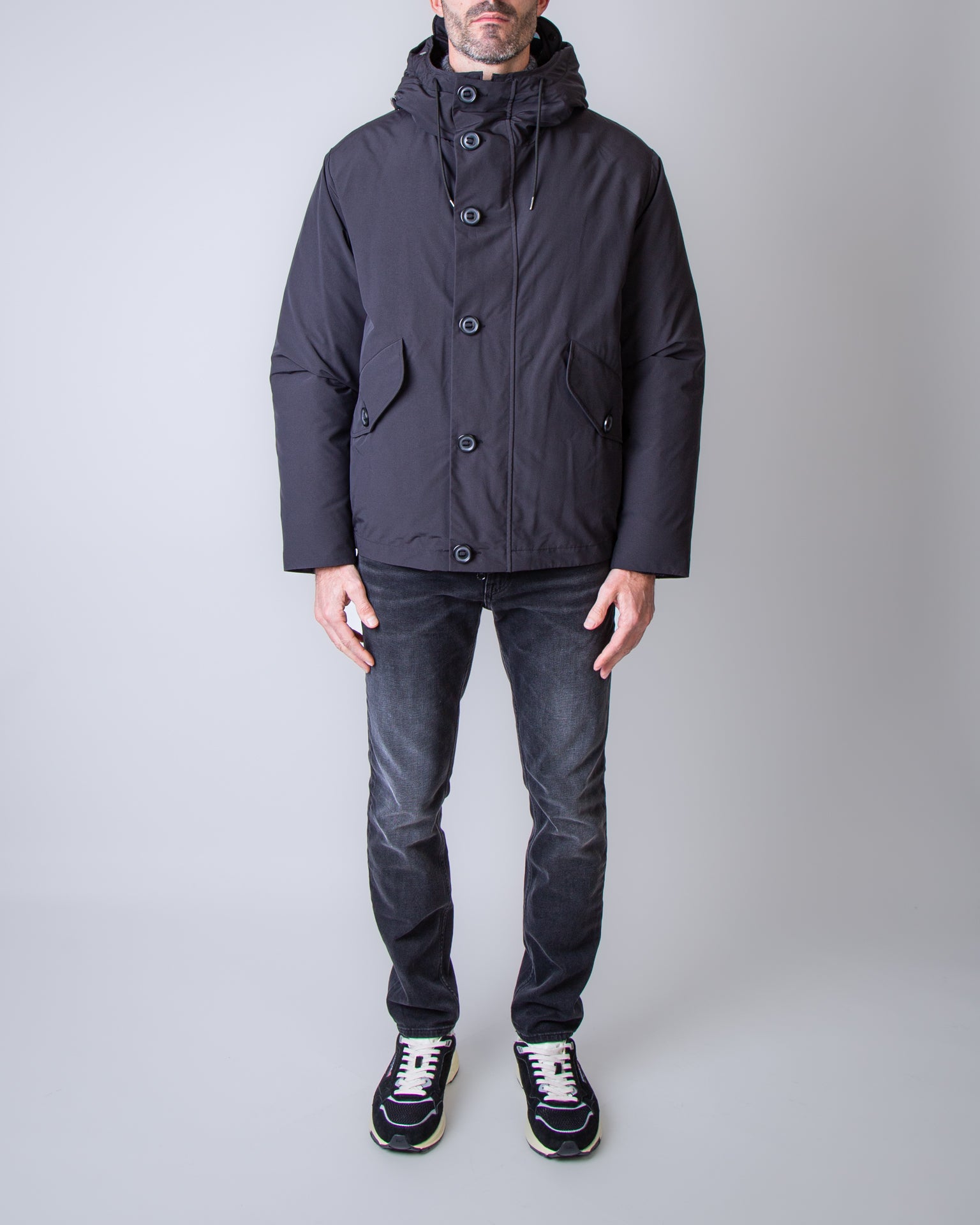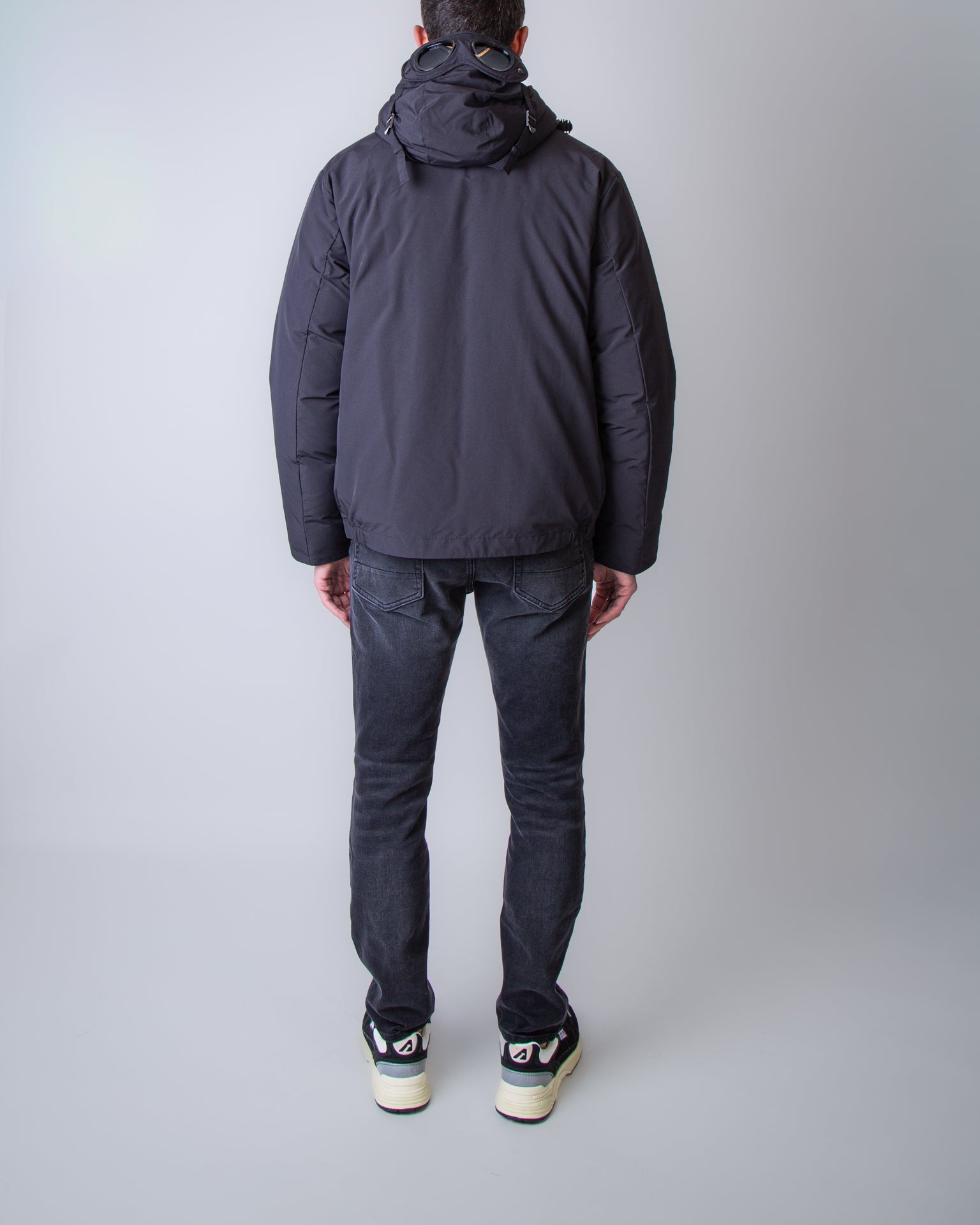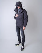 C.p. company, giubbotto uomo 19CMOW197A-110419A 999 nero, cappuccio con lenti. Il modello è alto 186 cm e indossa la taglia L