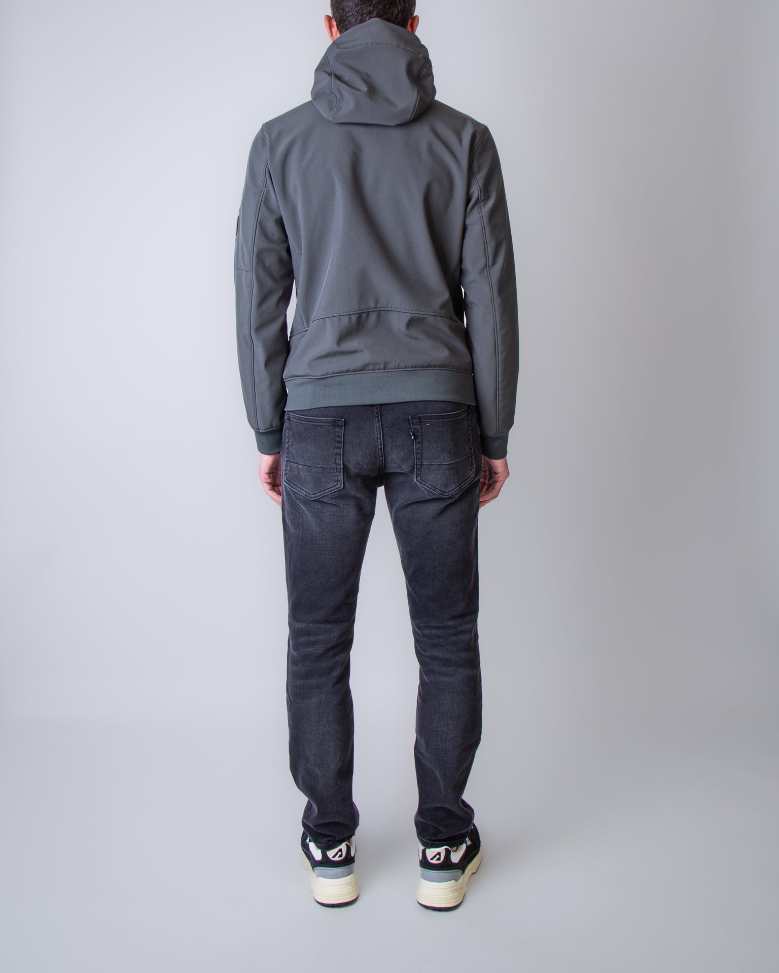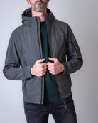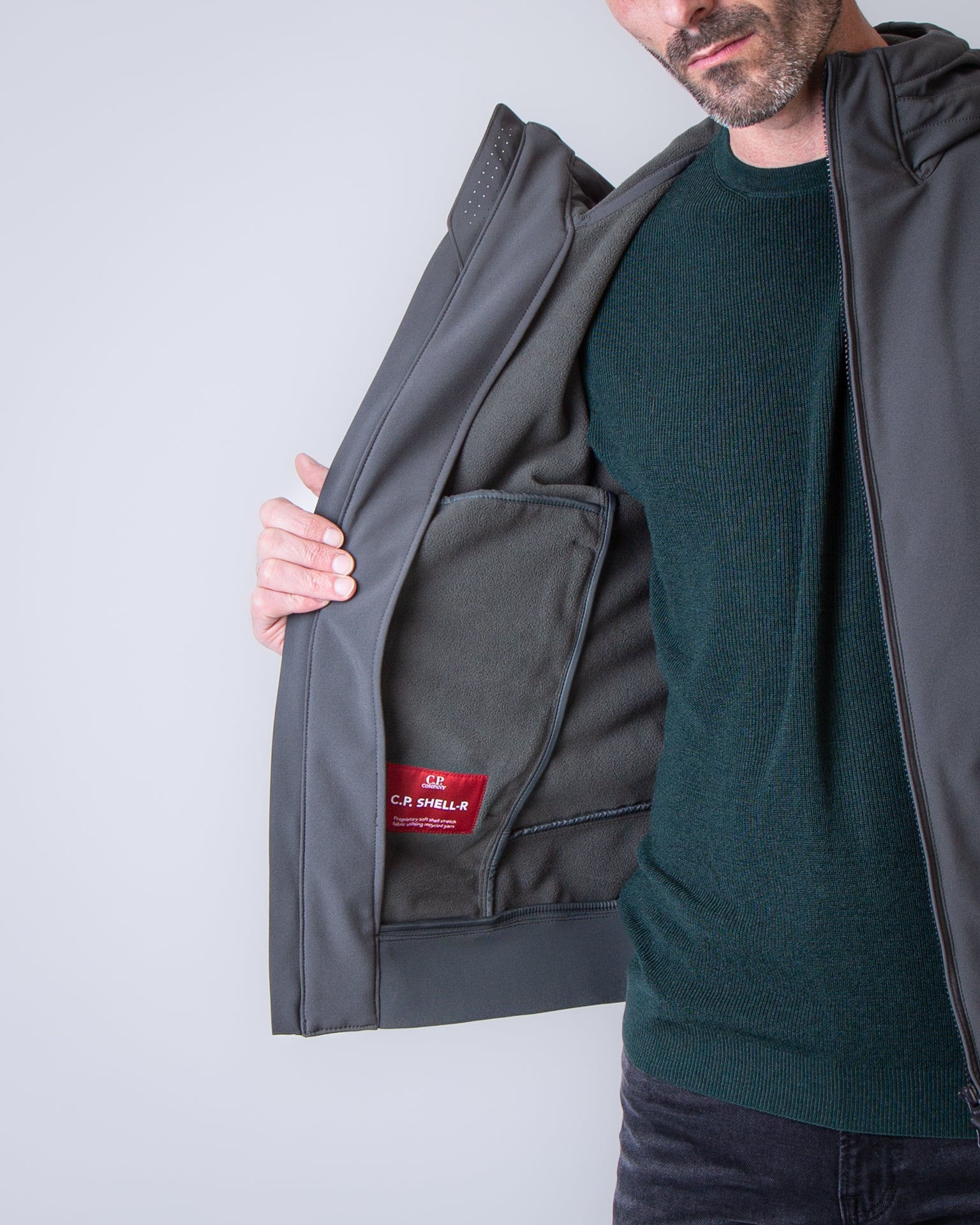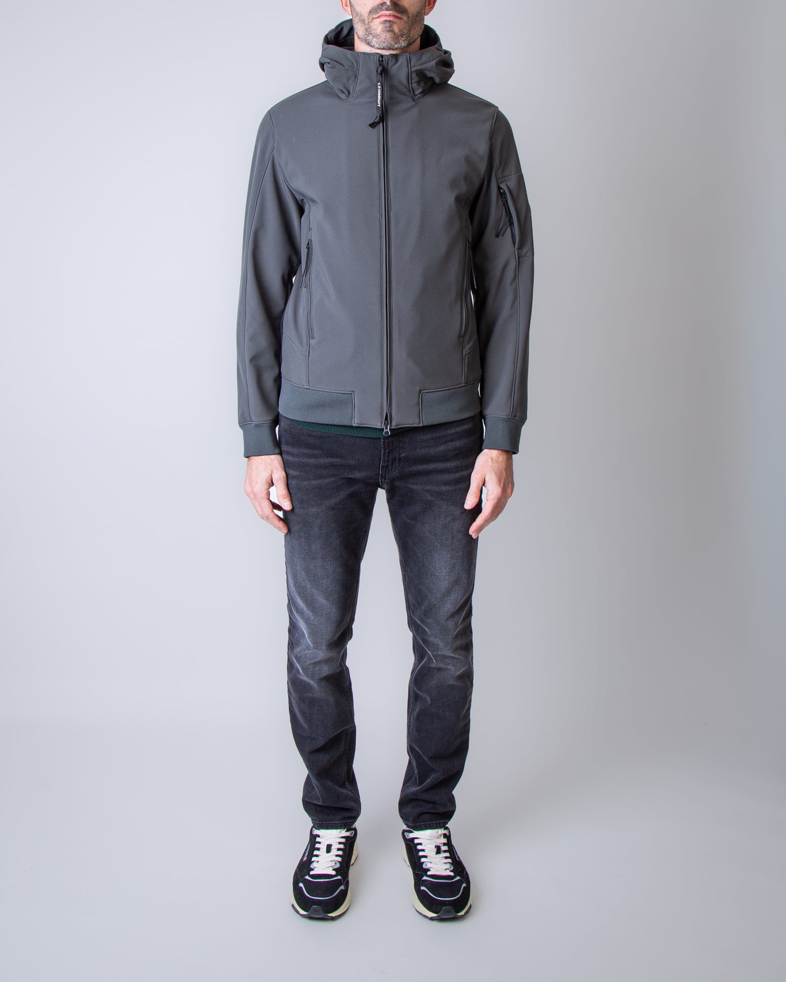 C.p. company, giubbotto uomo 19CMOW701A-006097A 978 verde, giubbotto soft shell. Il modello è alto 186 cm e indossa la taglia L