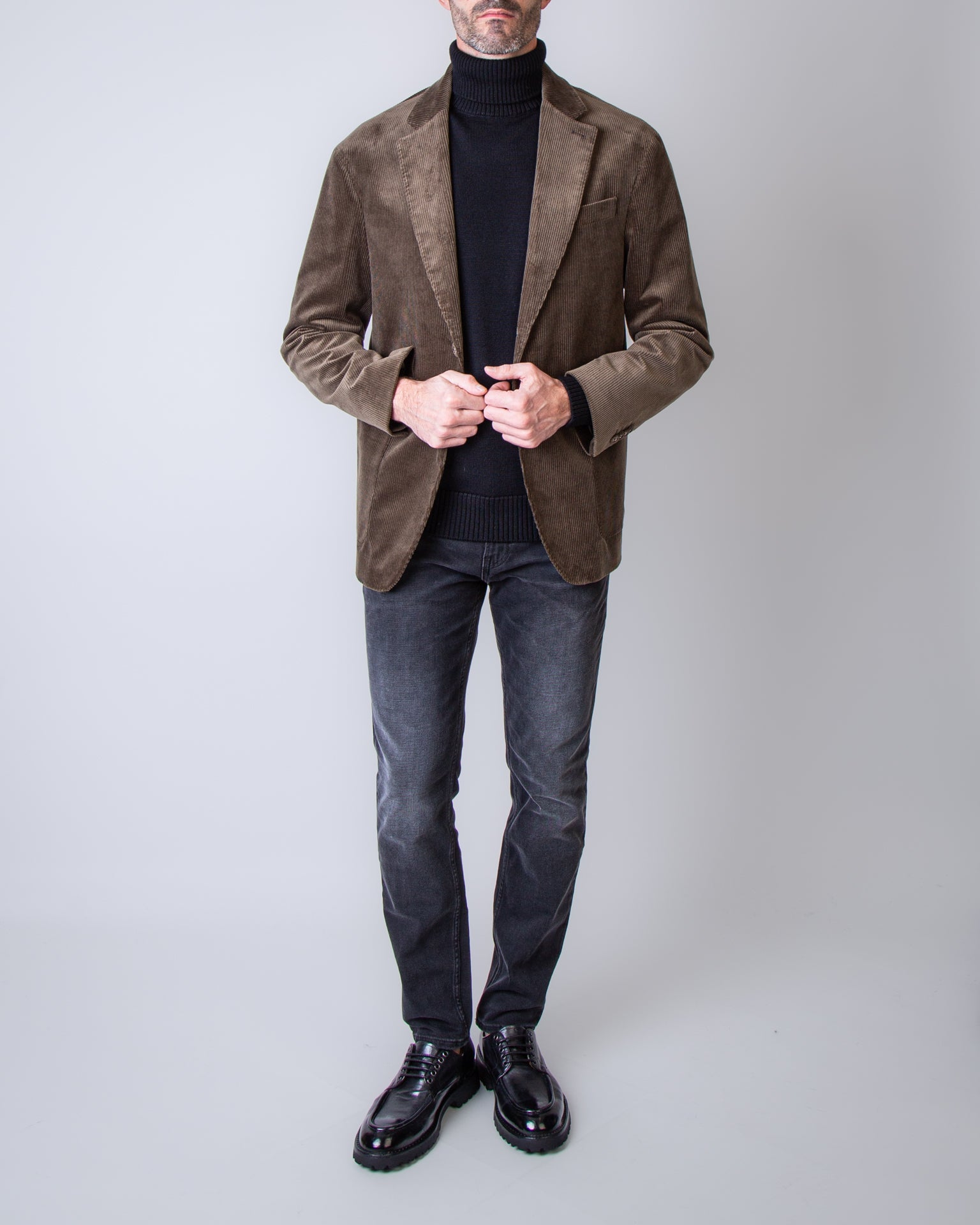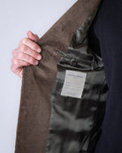 Officine Generale, giacca uomo MTLG406 OLIVE verde, giacca velluto, 99%cotone 1%elastan. Il modello è alto 186 cm e indossa la taglia 52