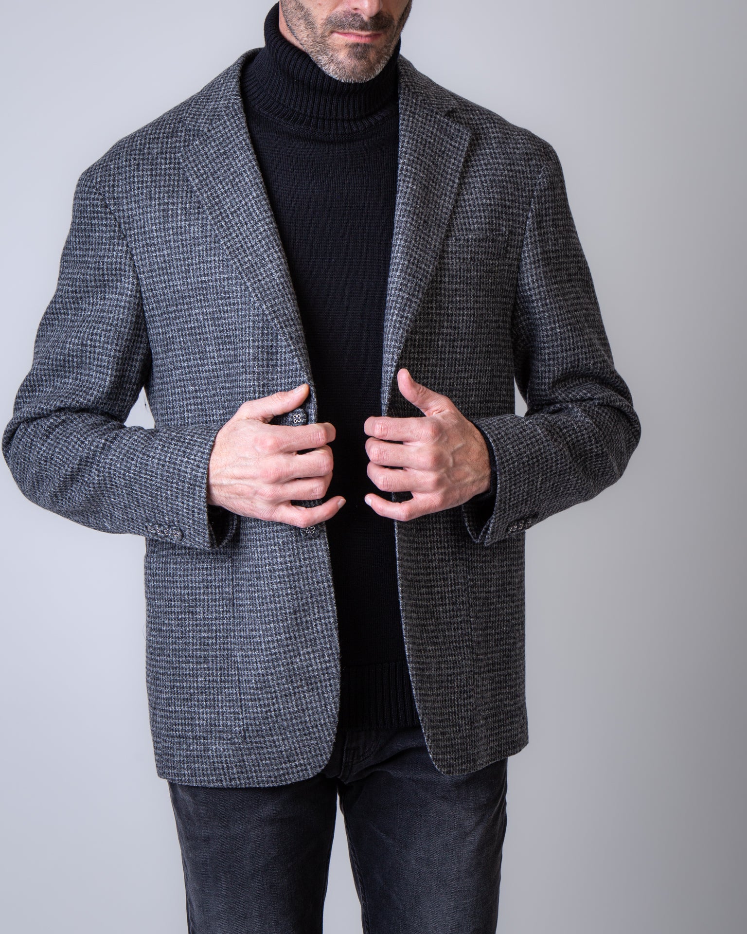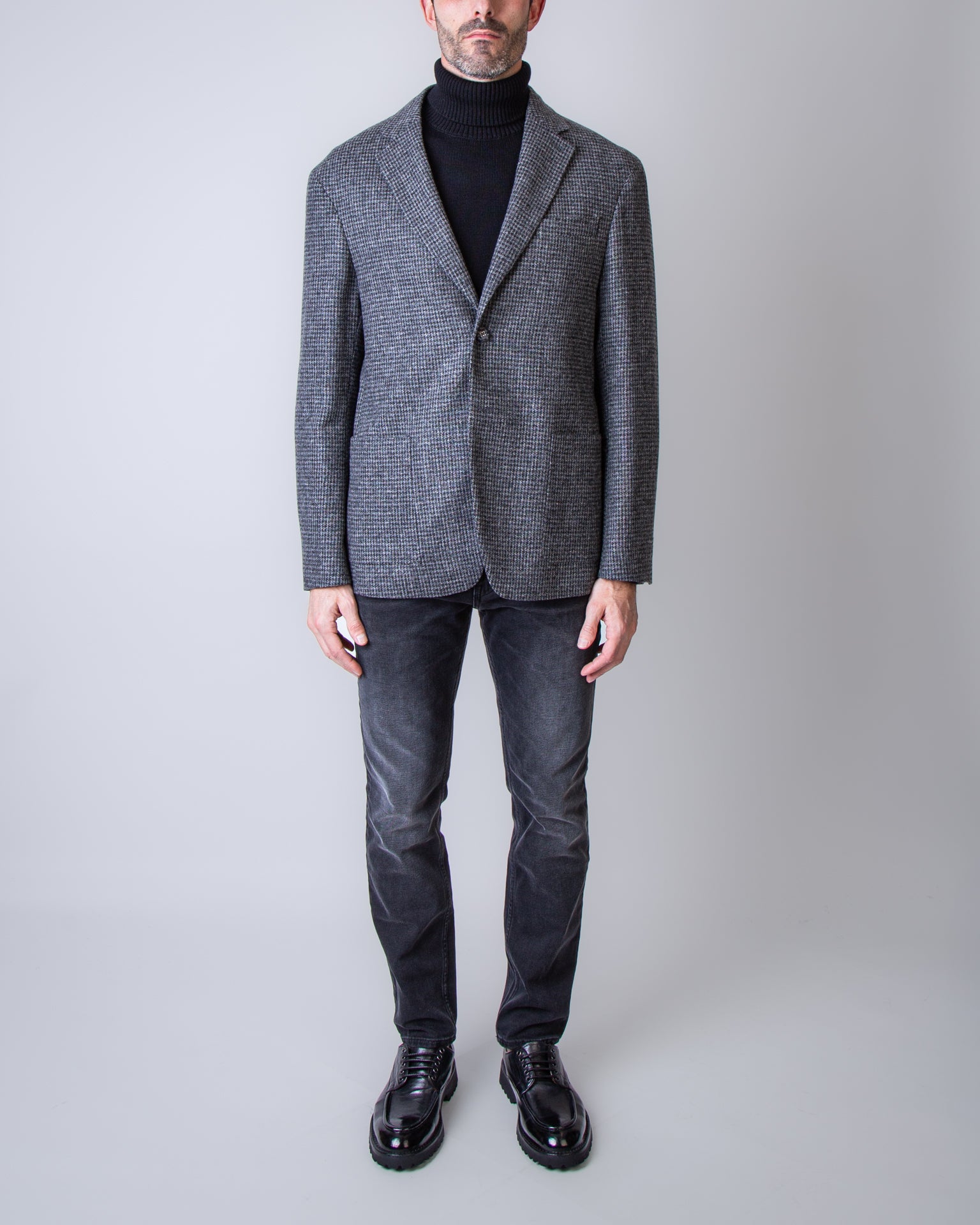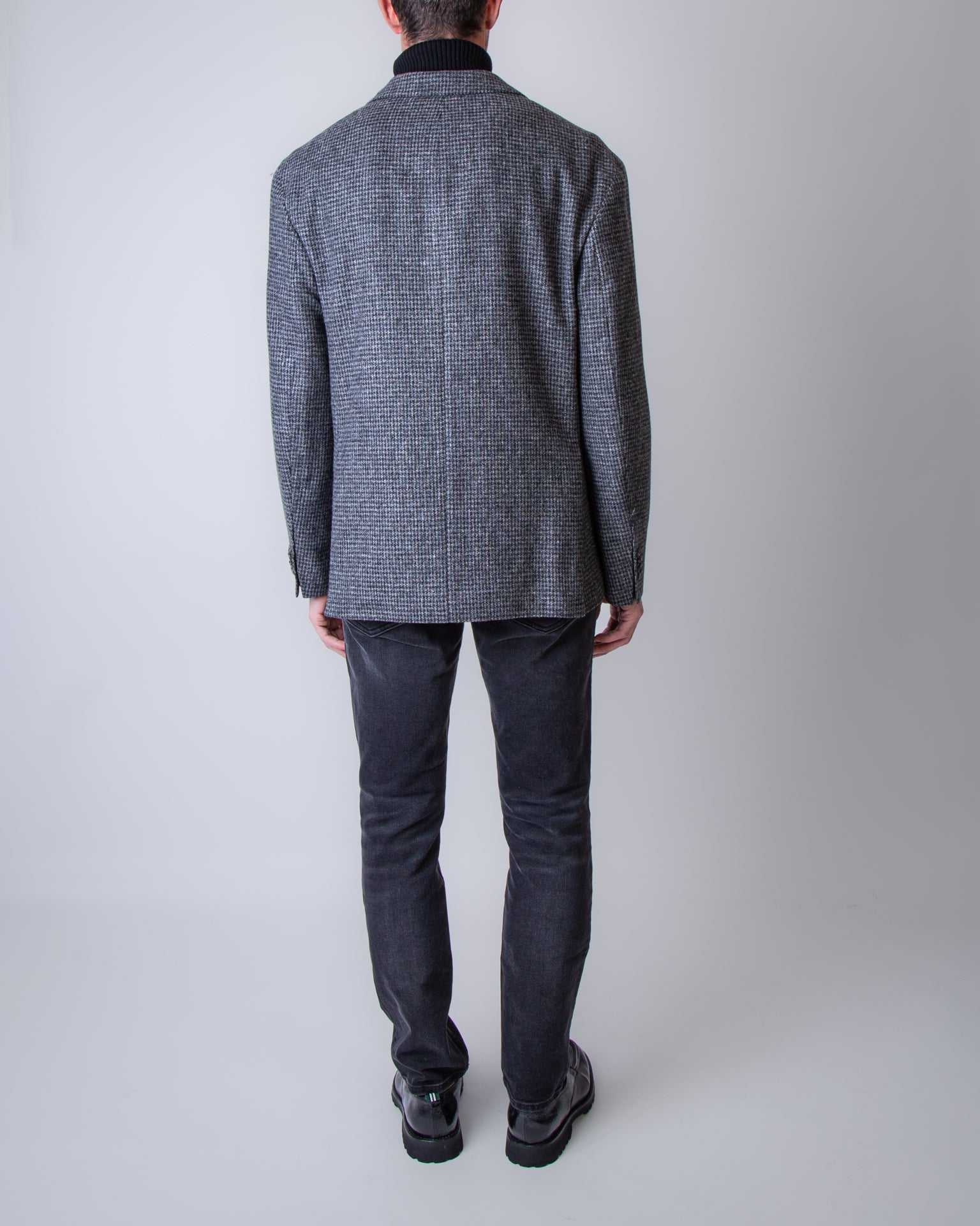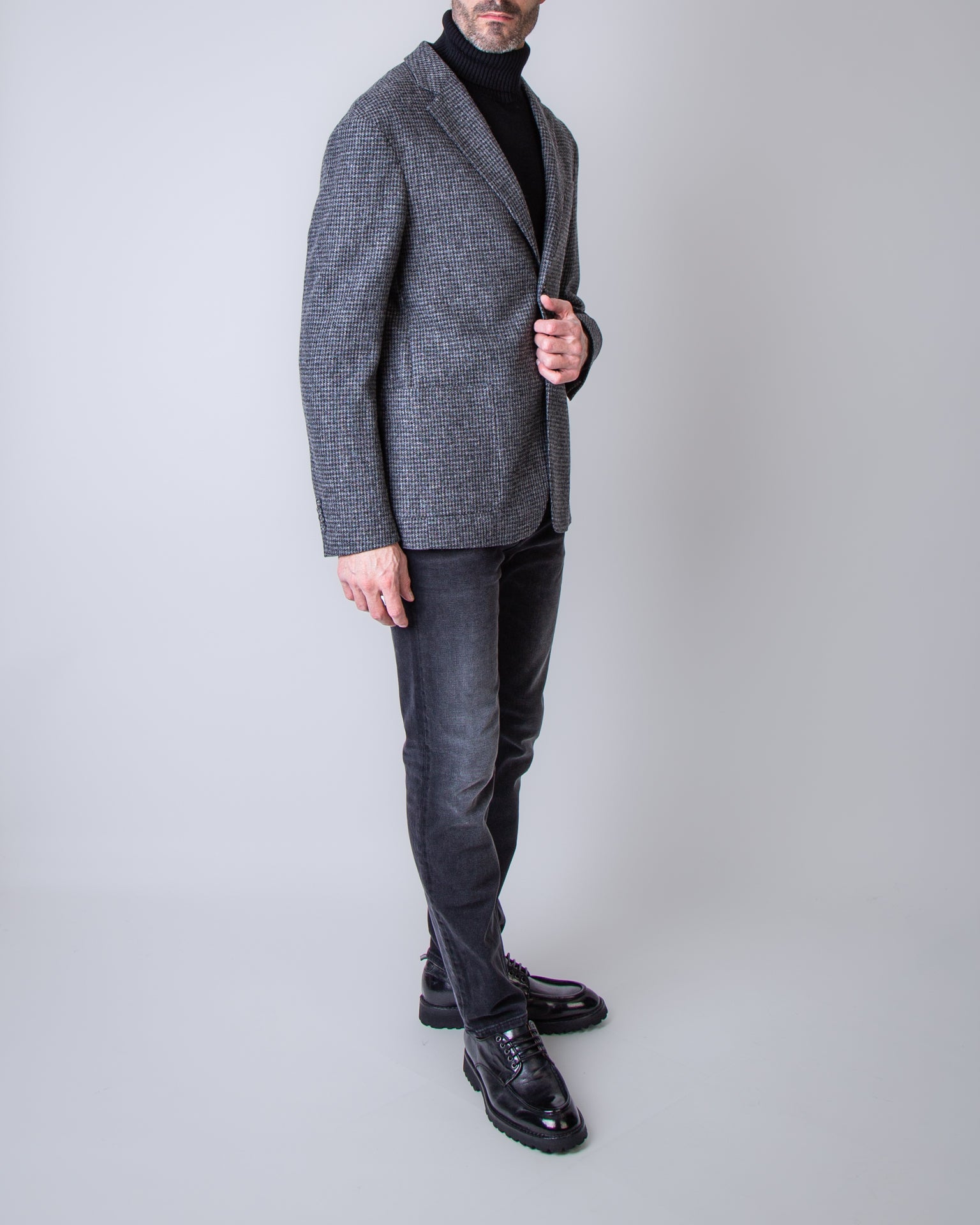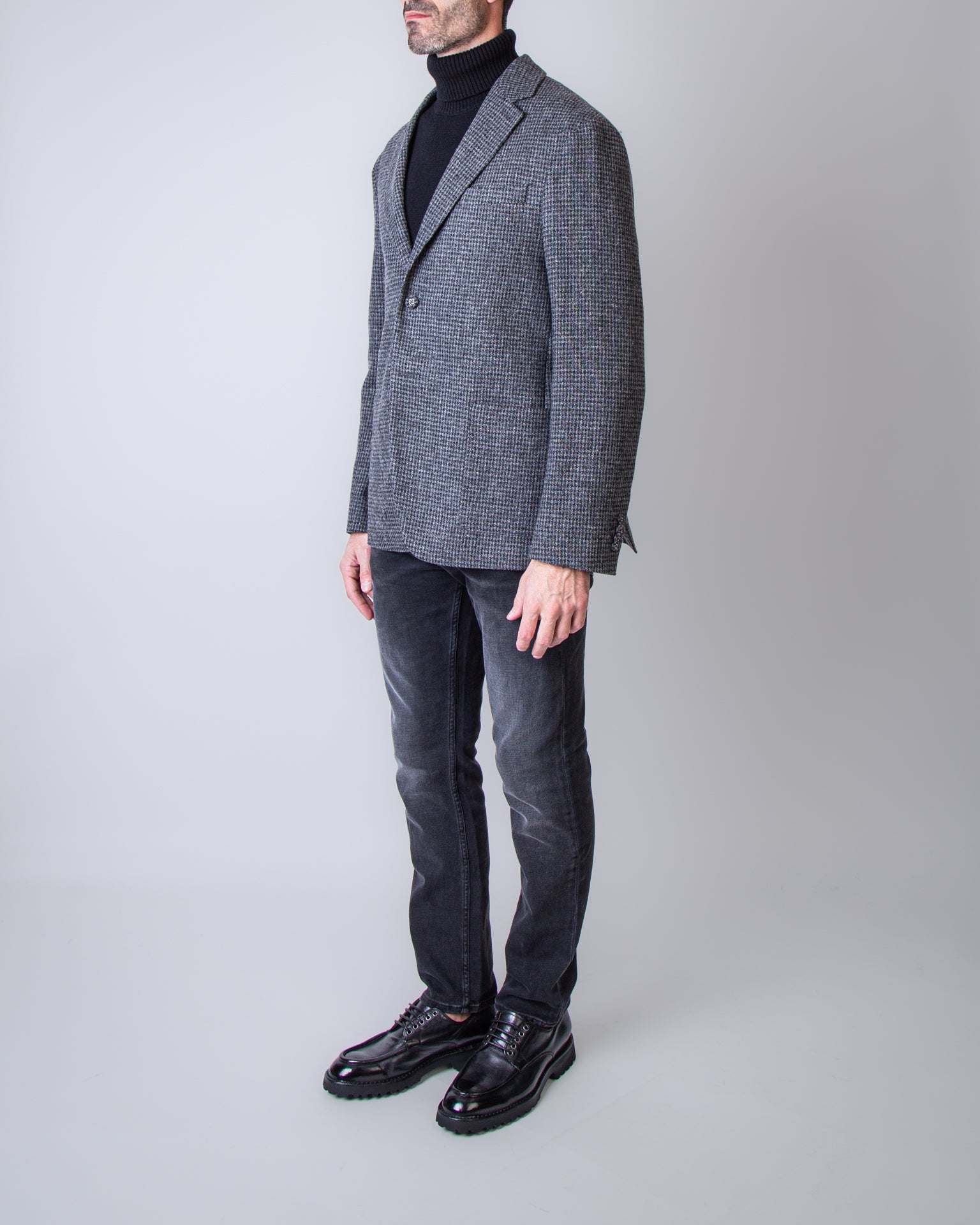 Officine Generale, giacca uomo MTLG407 GREY grigio, giacca pied poulle, 100%lana. Il modello è alto 186 cm e indossa la taglia 52