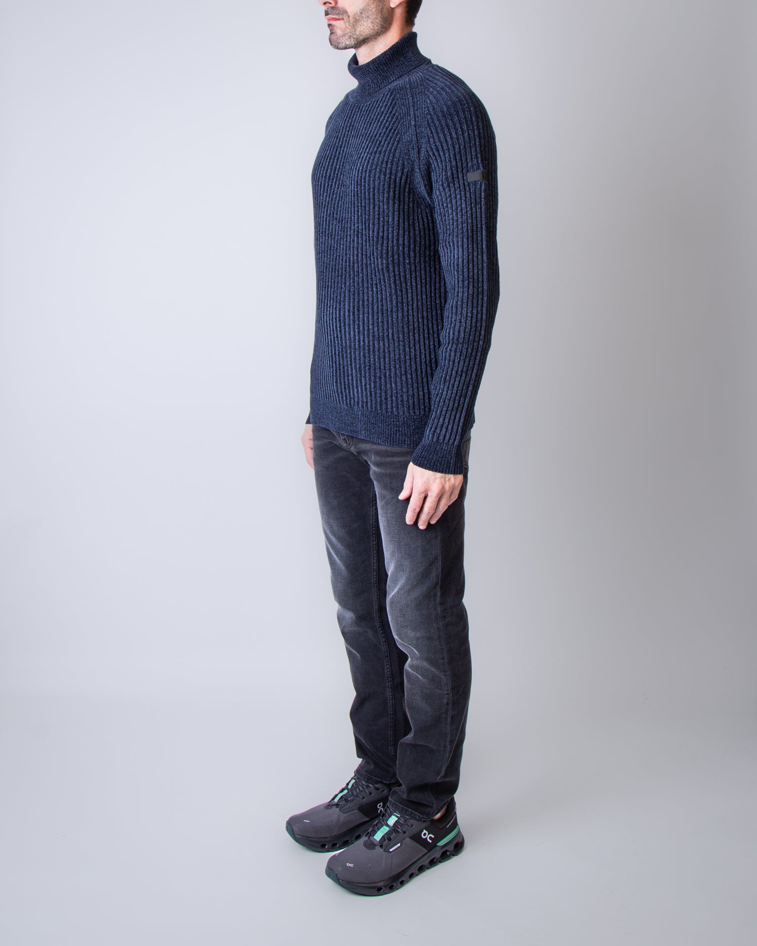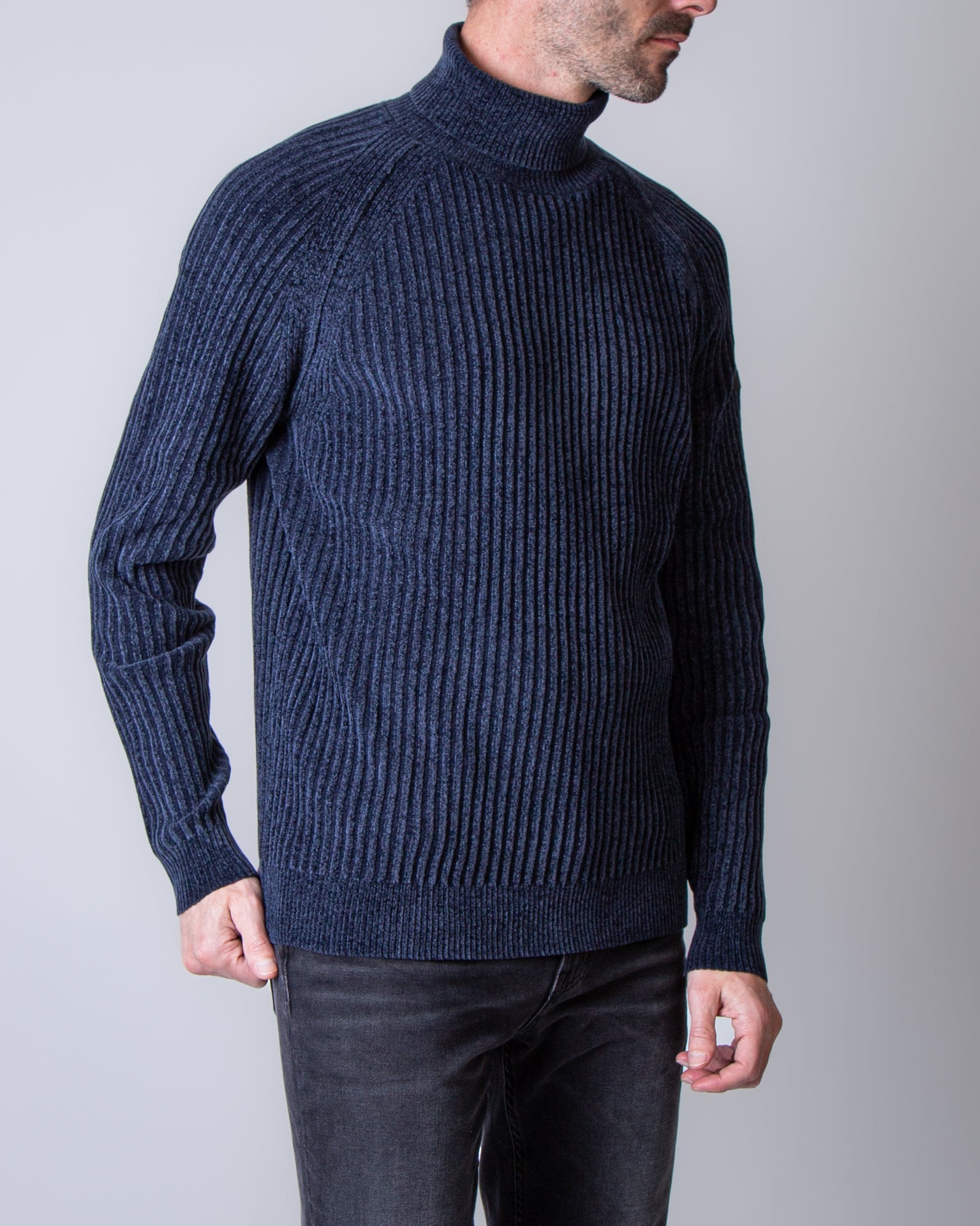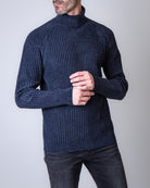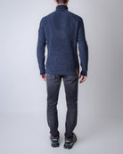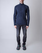 RRD, maglia uomo W25138 60 blu, girocollo in ciniglia rasata. Il modello è alto 186 cm e indossa la taglia 52