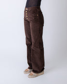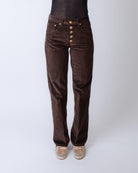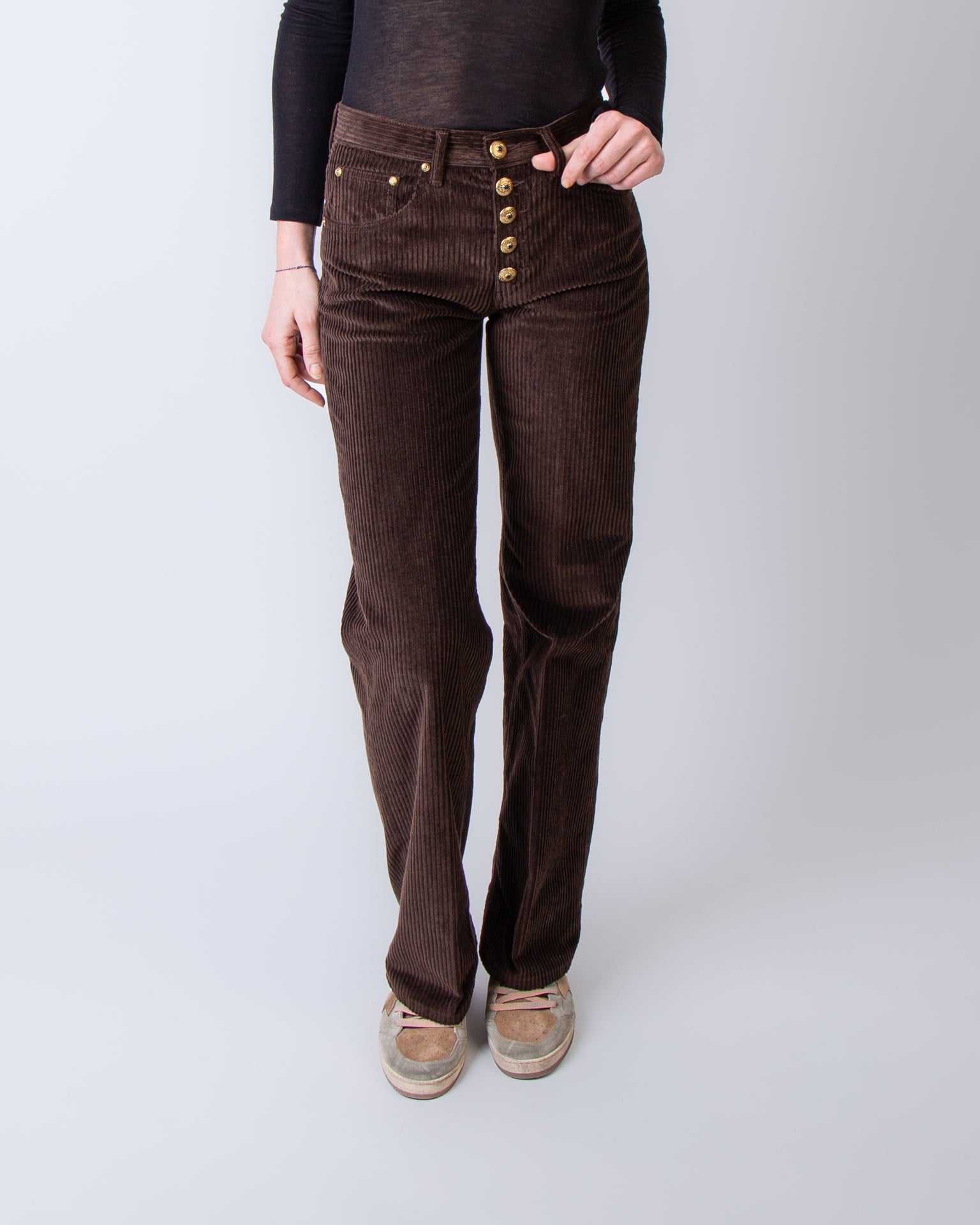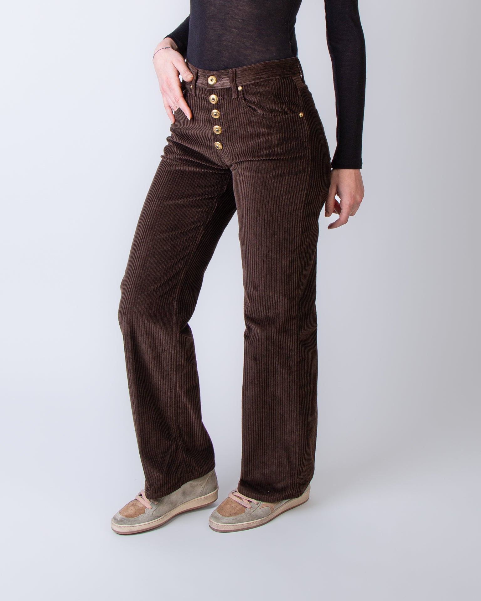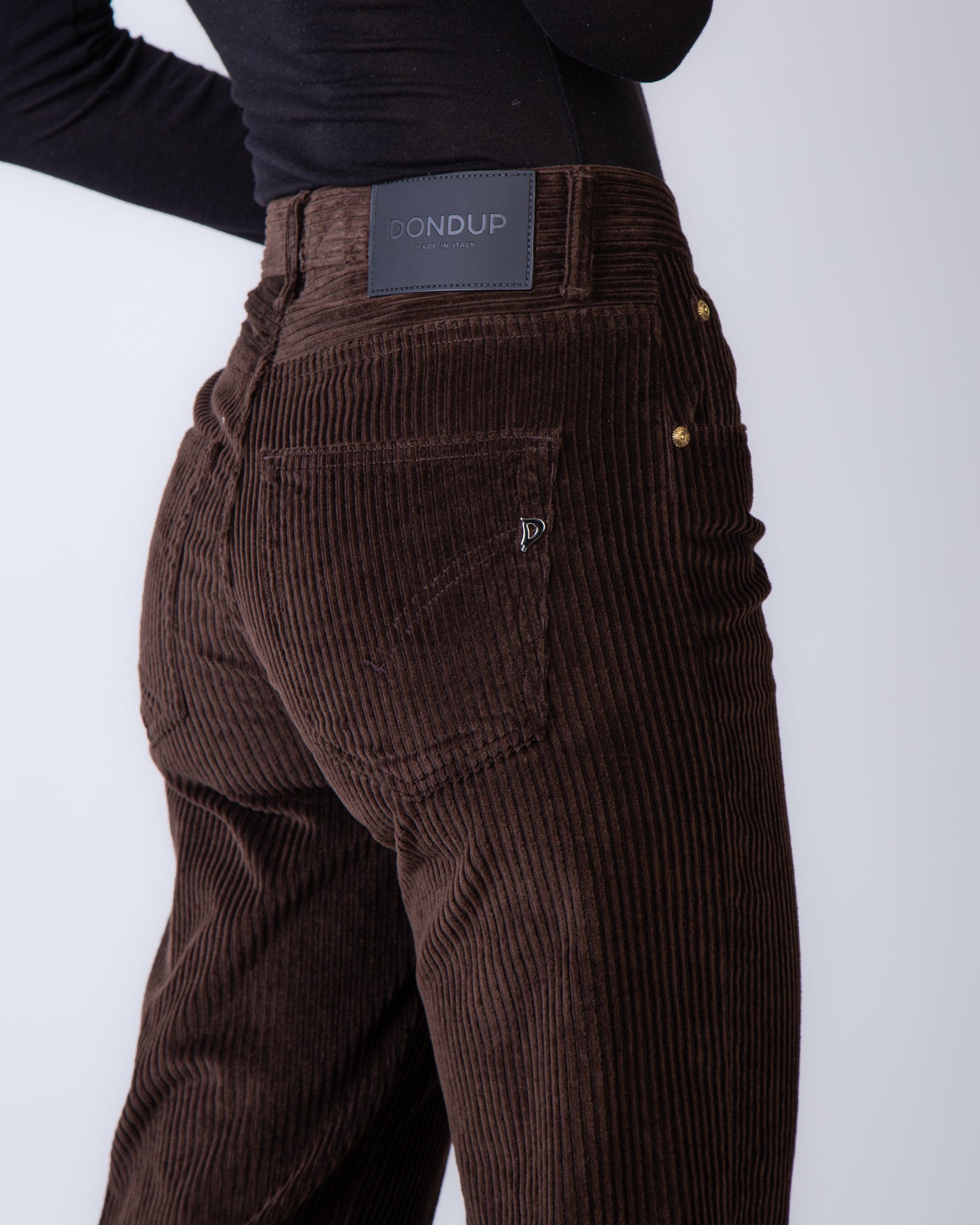 Dondup, jeans donna DP427B VS0031D XXX 730 marrone, jacklyn corduroy stretch 98% co 2%ea. La modella è alta 175 cm e indossa una taglia 26