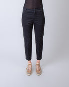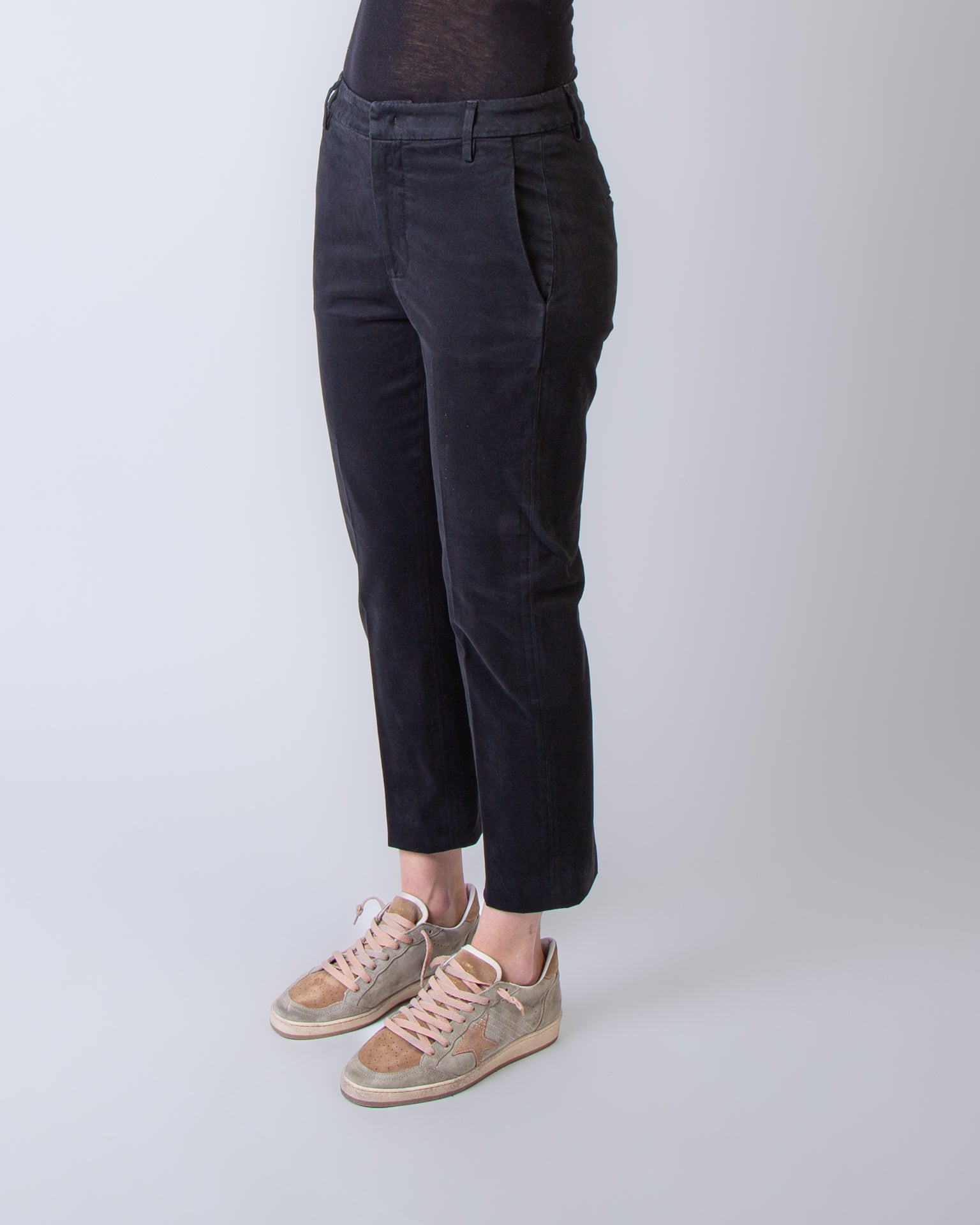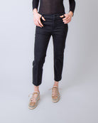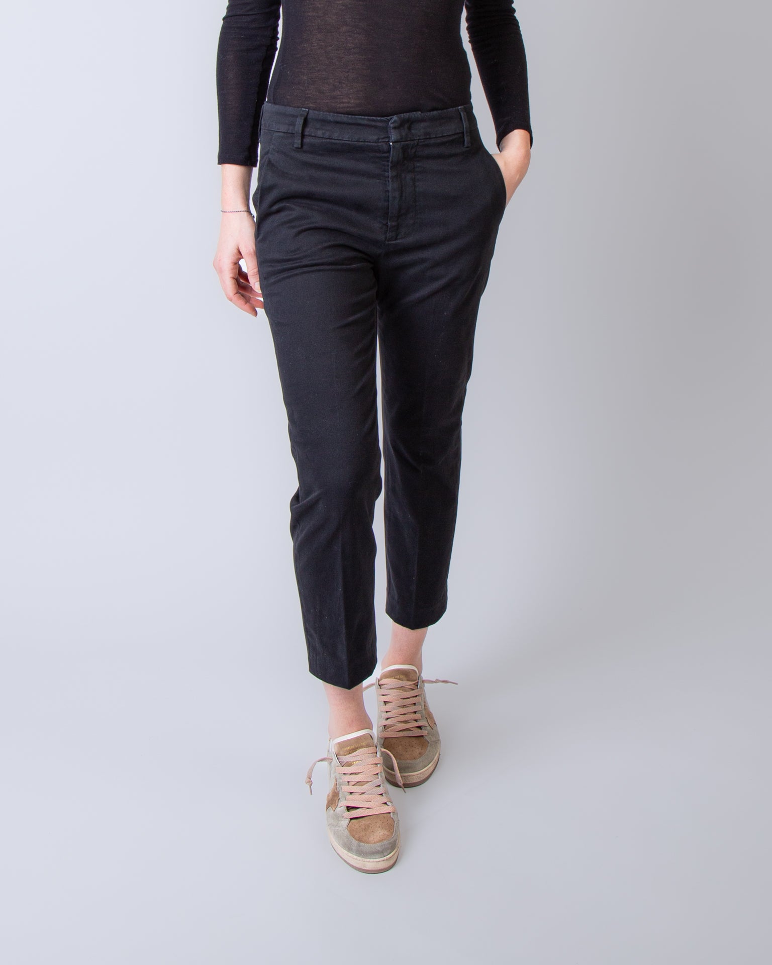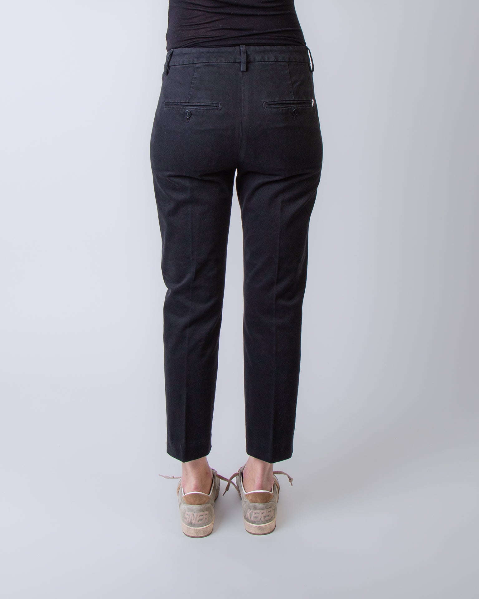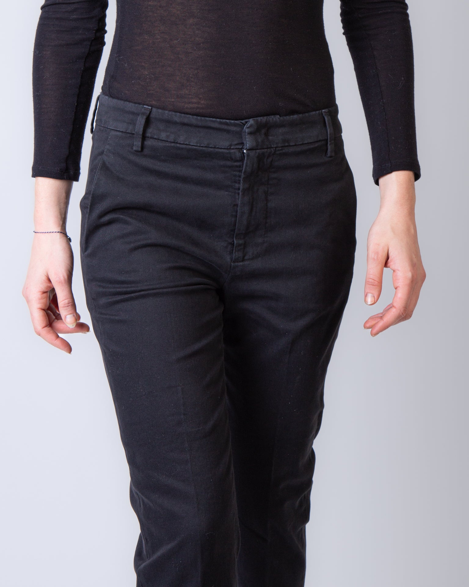 Dondup, pantalone donna DP576Z GSE043D PTD 999 nero, nima zip. La modella è alta 175 cm e indossa una taglia 26