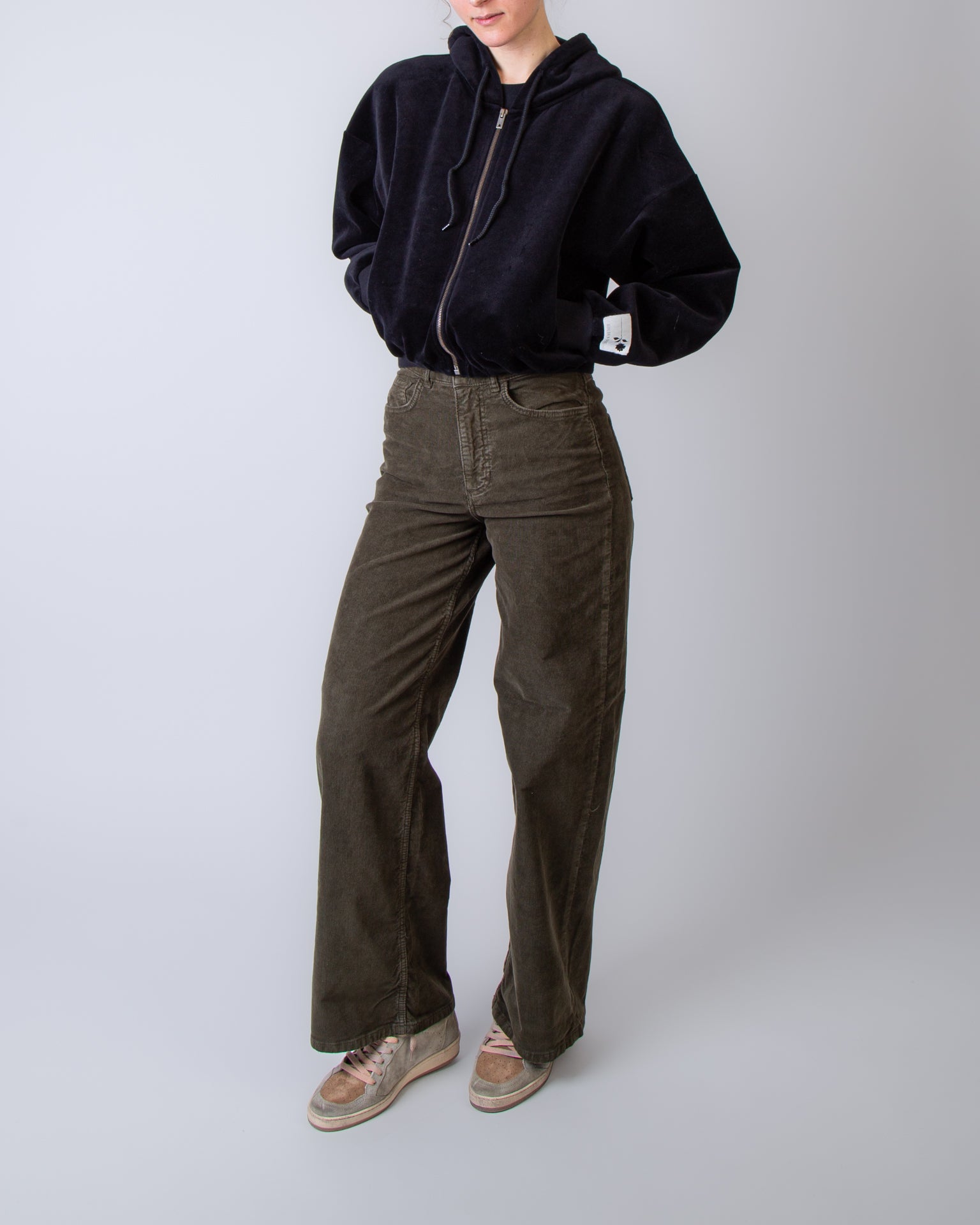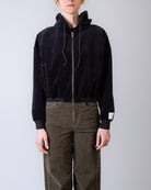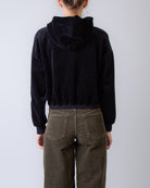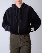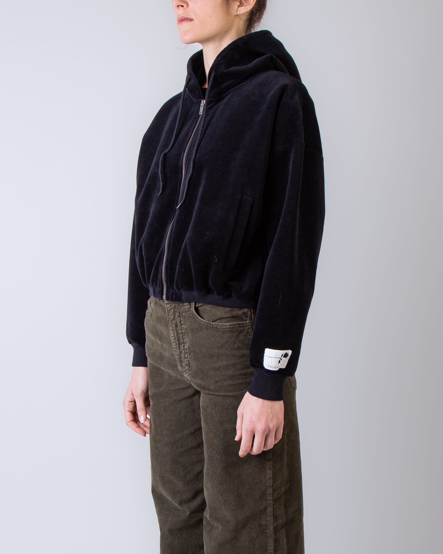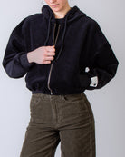 Golden Goose, felpa donna GWP02327.P002130 90100 nero, zip con cappuccio, 100% cotone. La modella è alta 175 cm e indossa una taglia XS