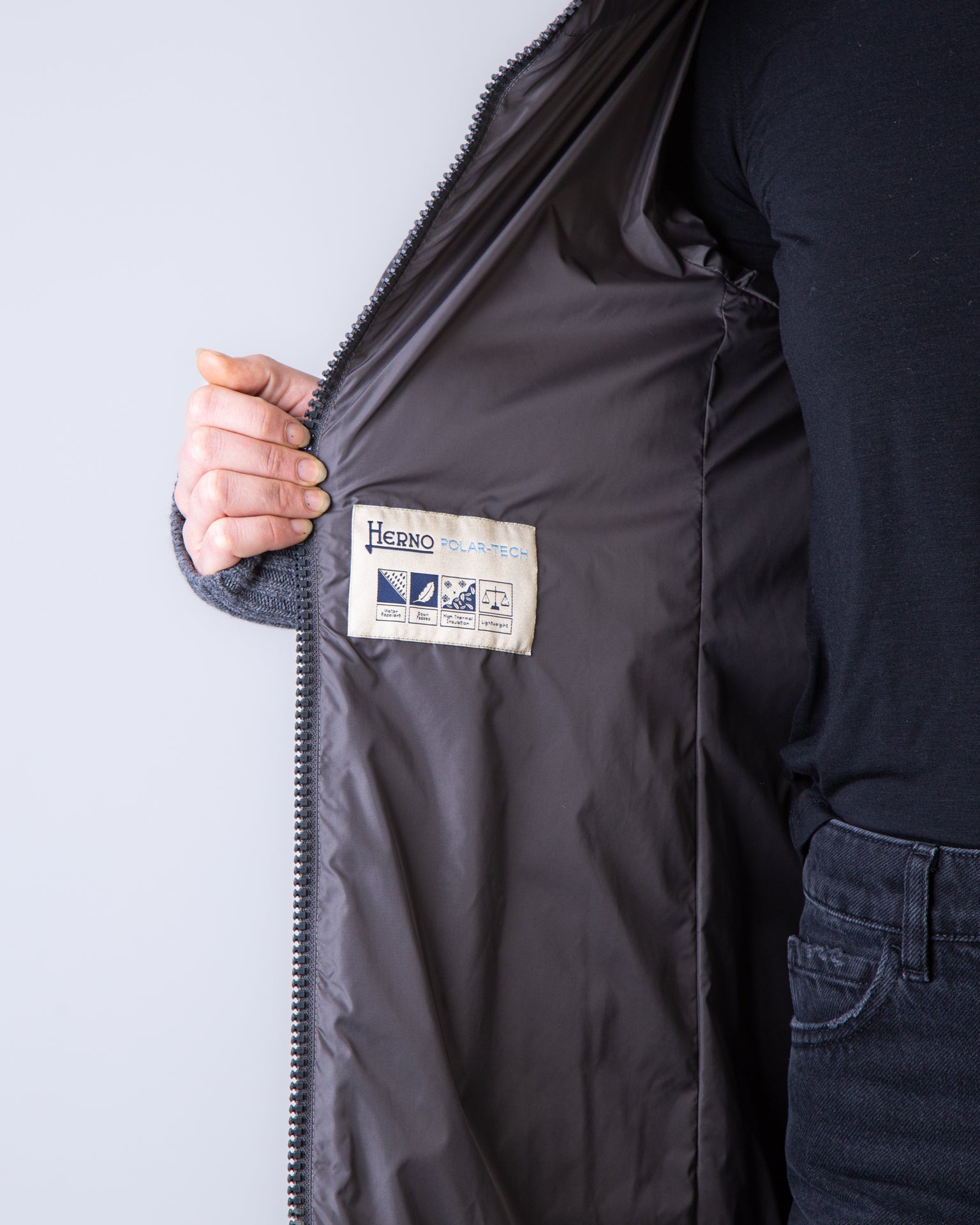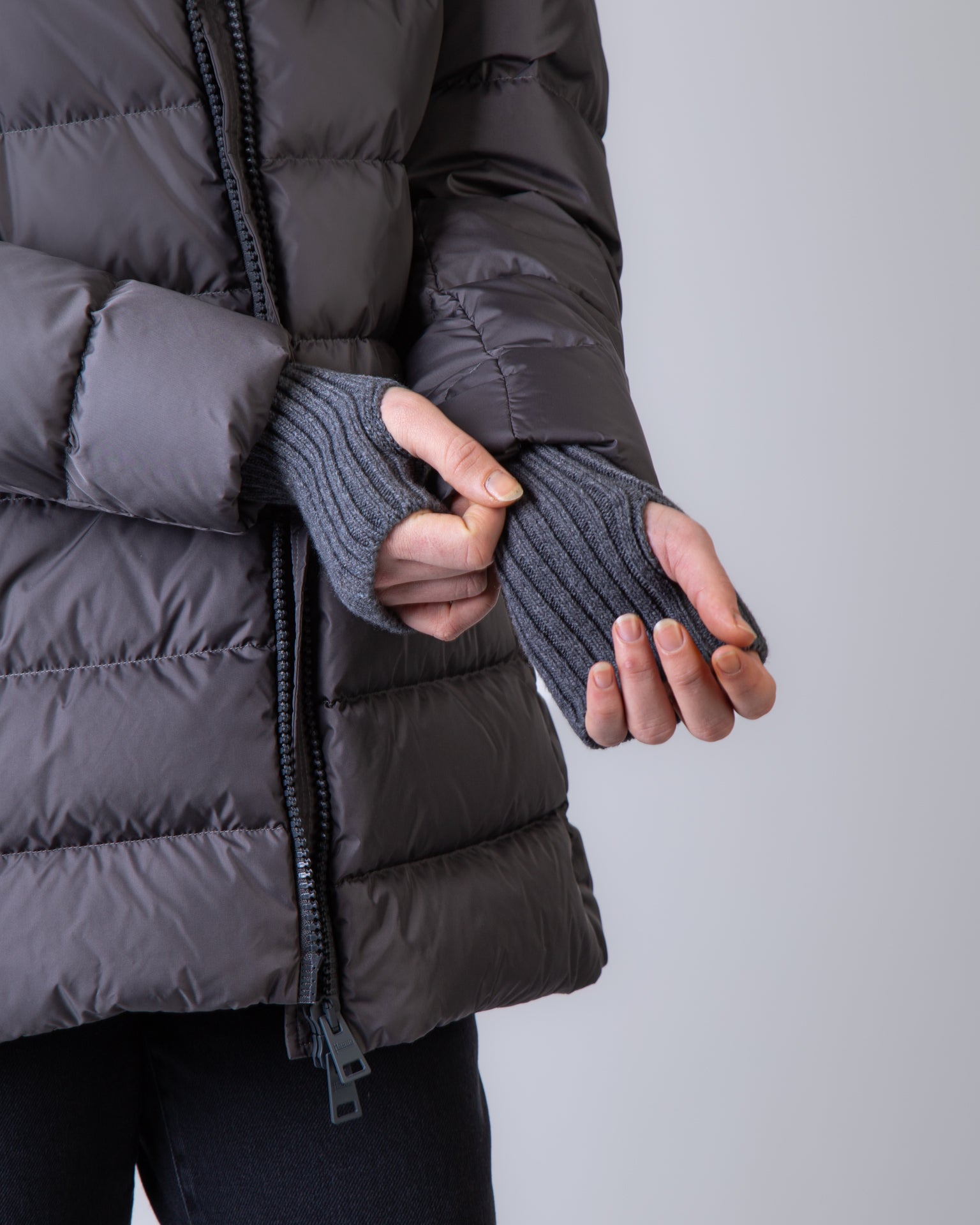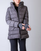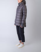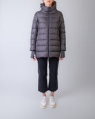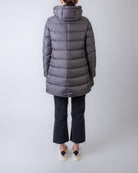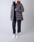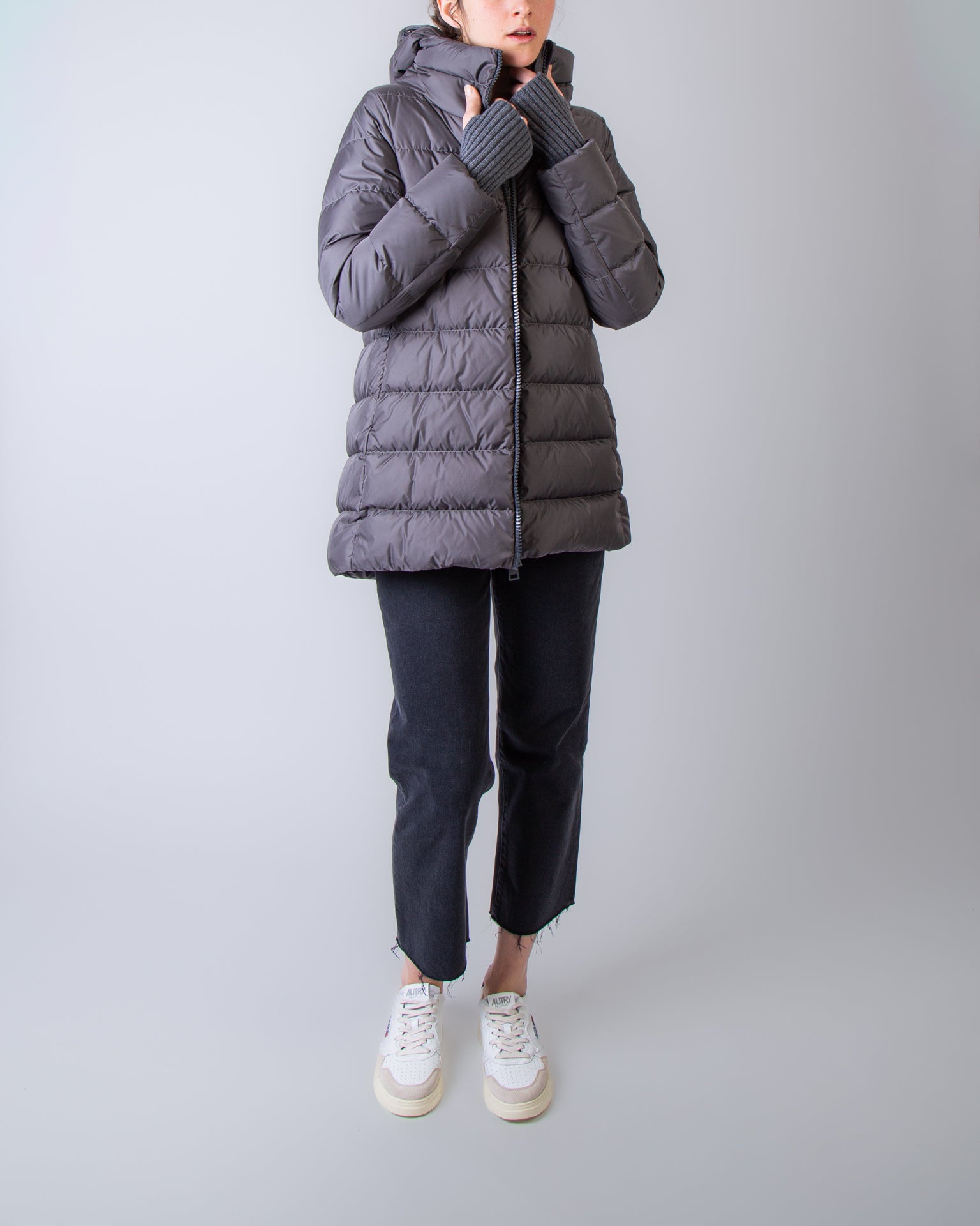 Herno, piumino donna PI0660D 12004Z 9460 grigio, chamonix a-shape 100%pa. La modella è alta 175 cm e indossa una taglia 42