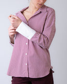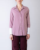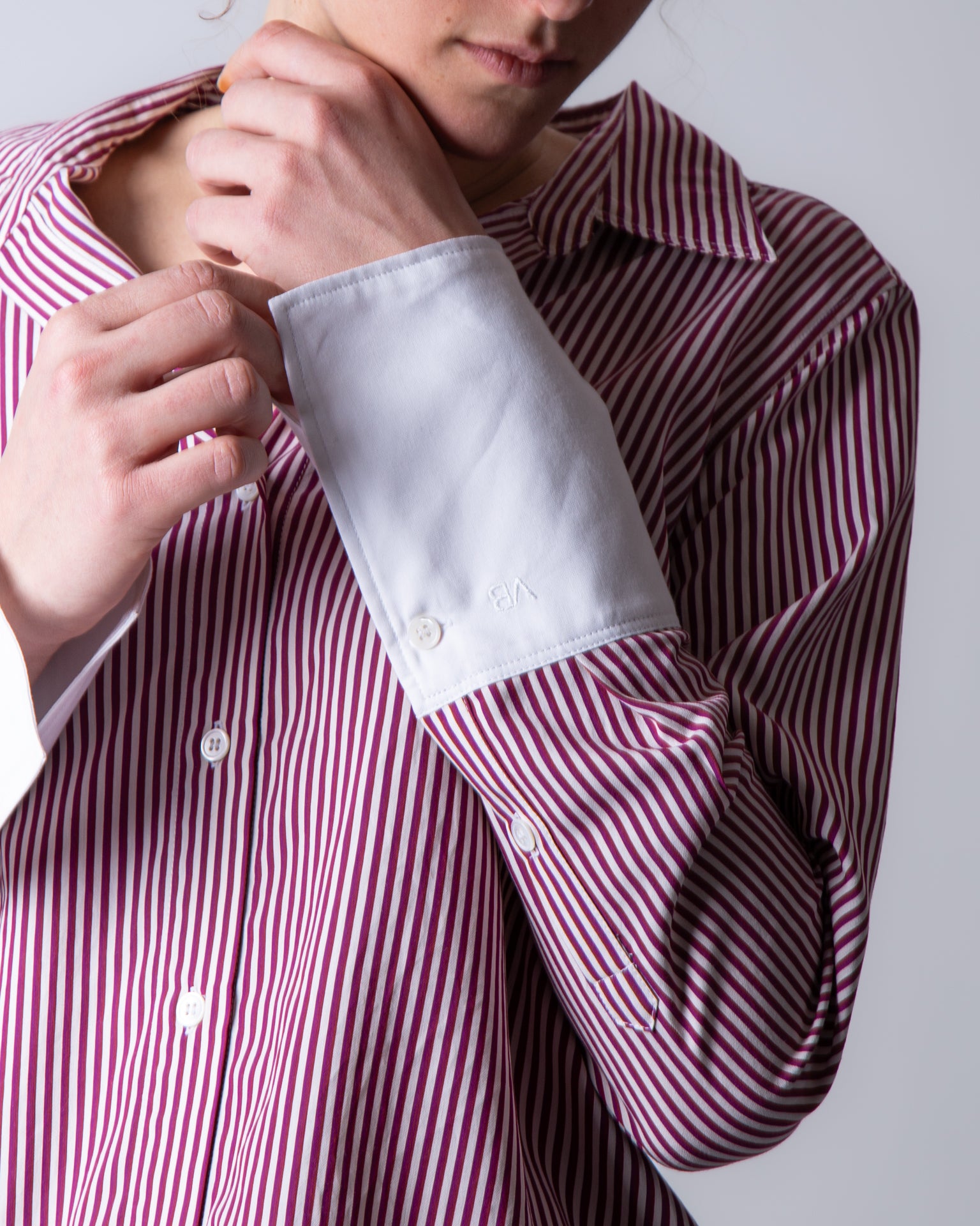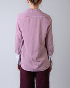 Vanessabruno, camicia donna 4HVA88 V09827 436 rosso, modello esti vestibilità over. La modella è alta 175 cm e indossa una taglia S