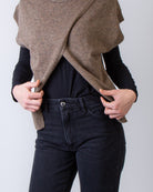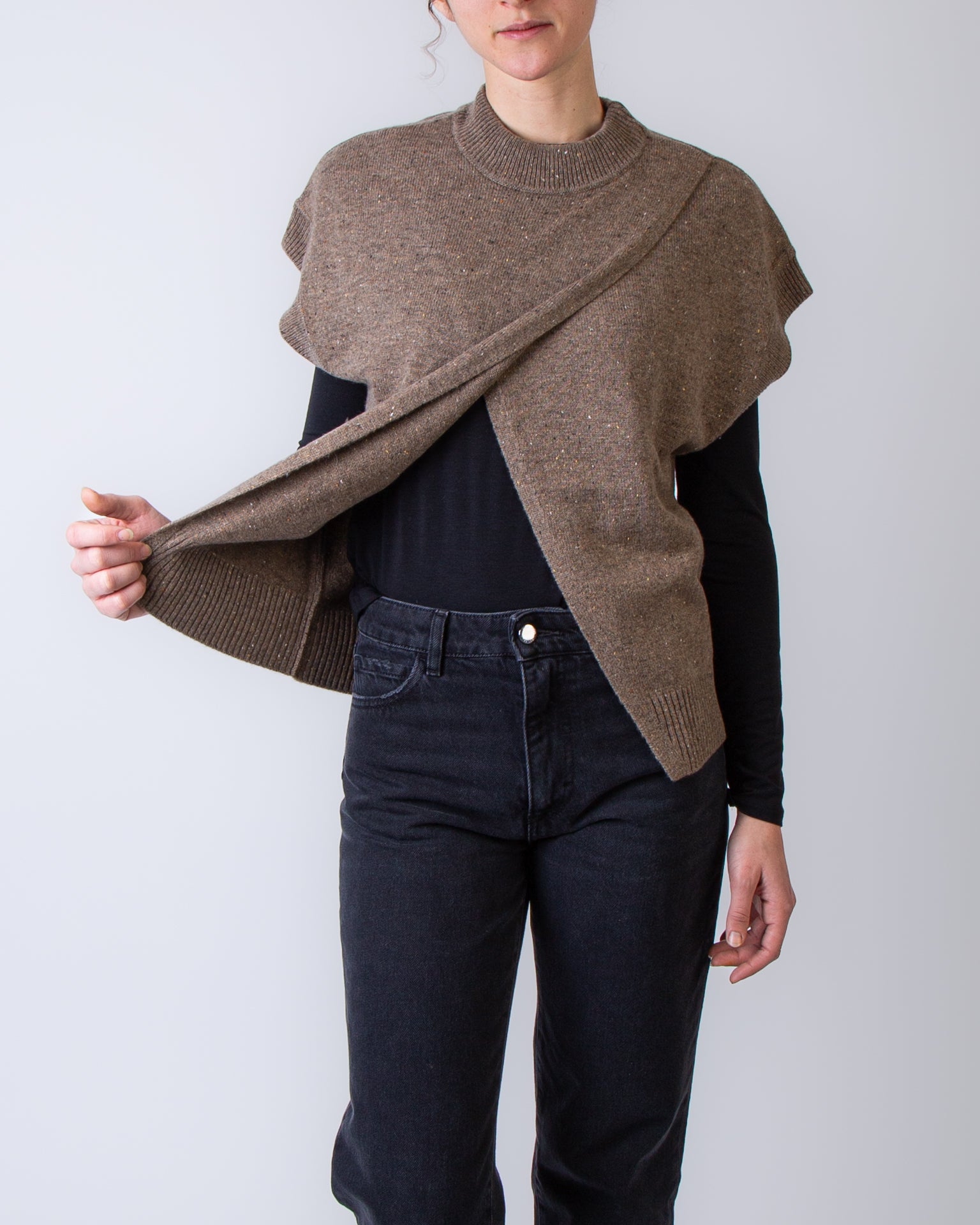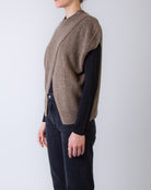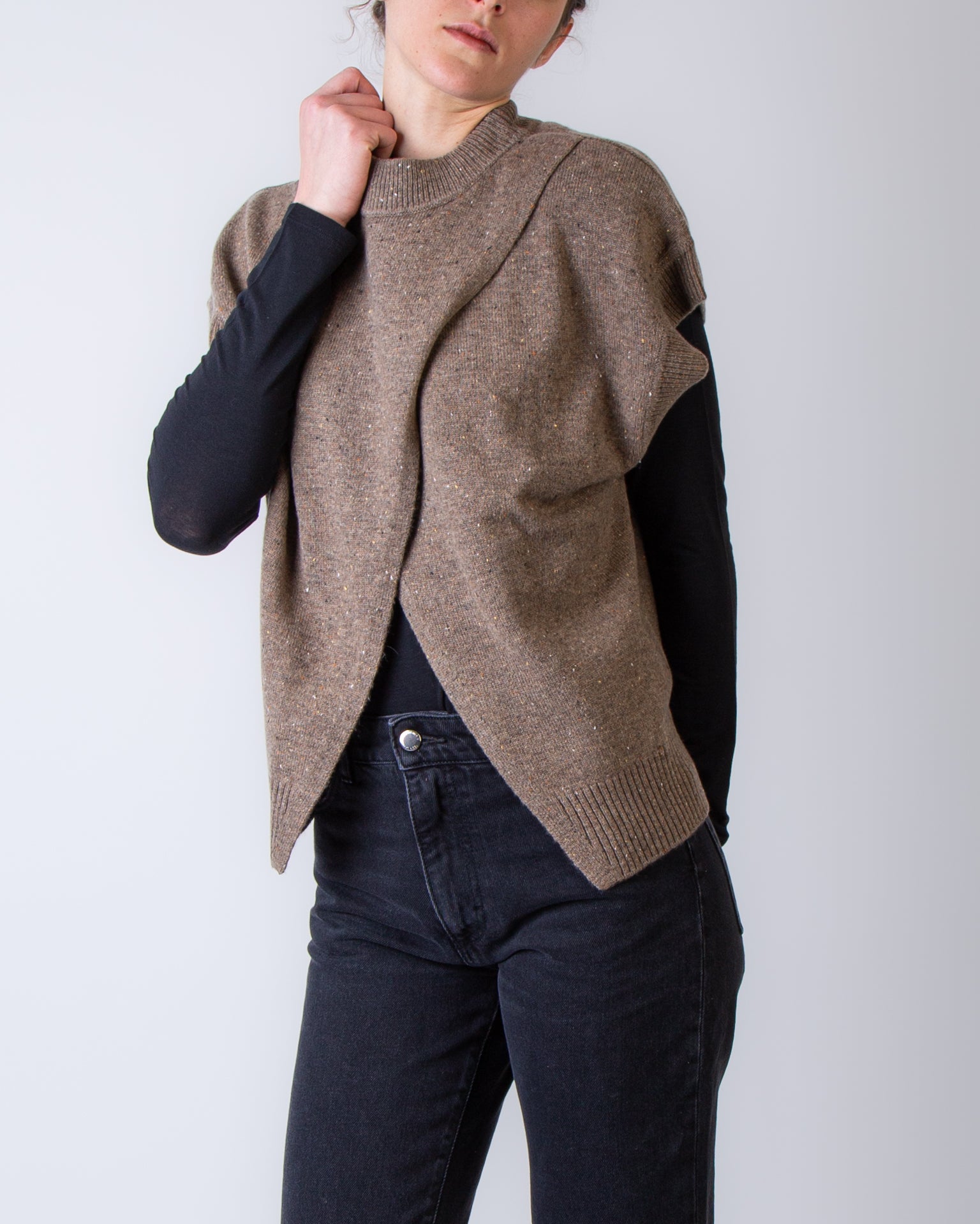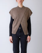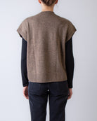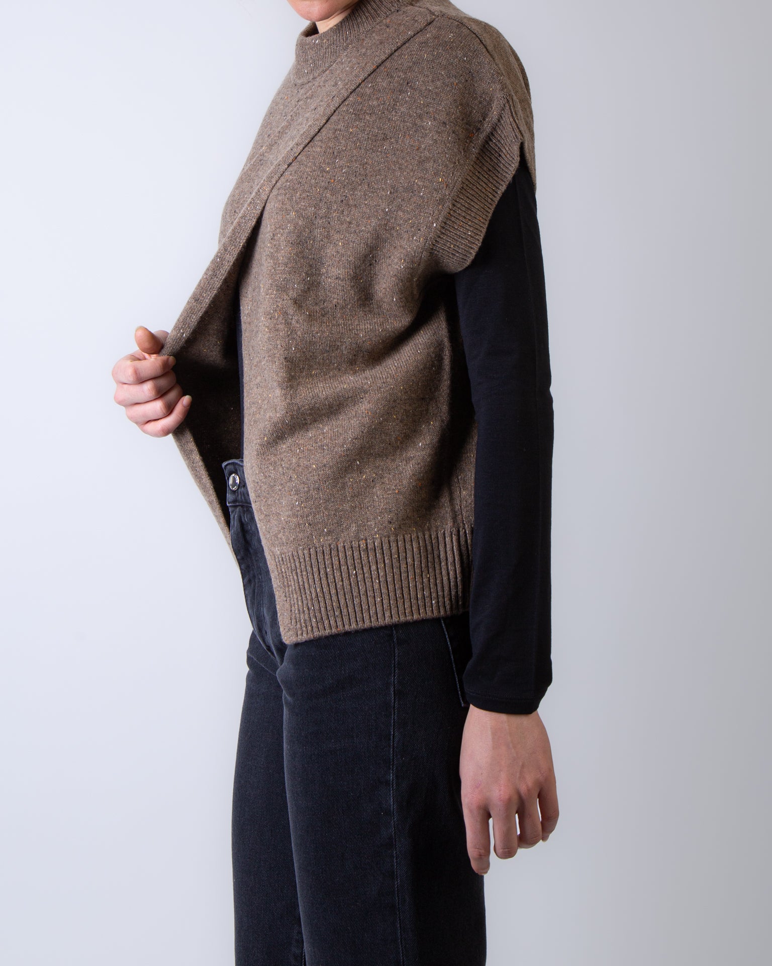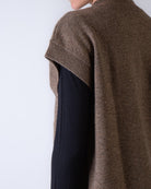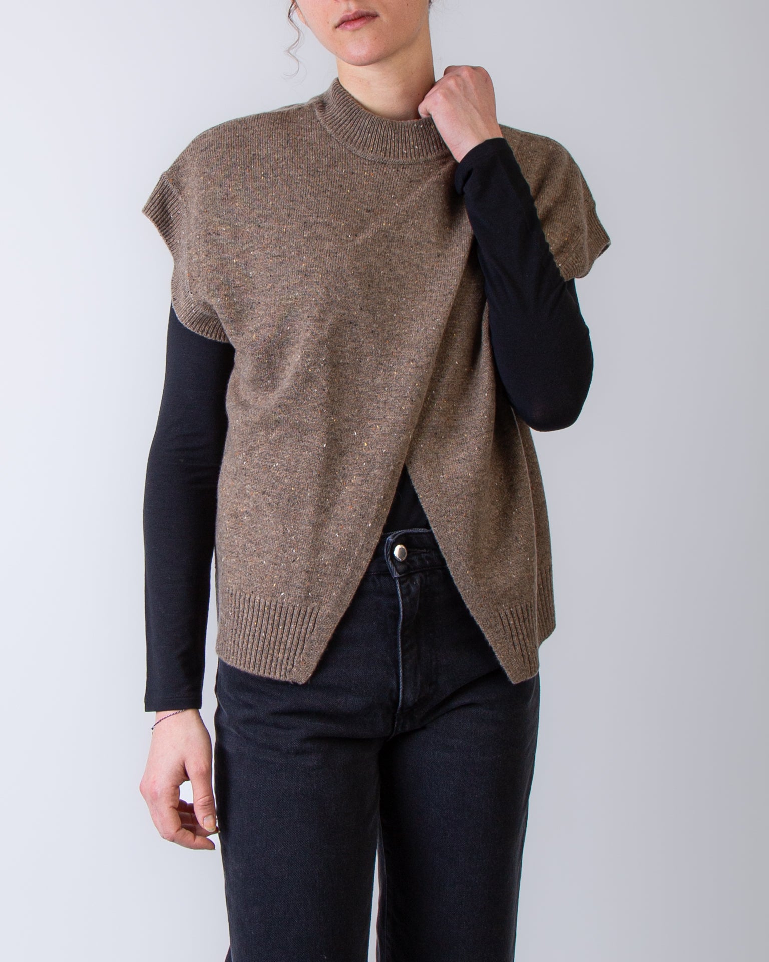Vanessabruno, maglia donna 3HVC07 V15008 122 marrone, belina senza maniche con spacco davanti. La modella è alta 175 cm e indossa una taglia S/M