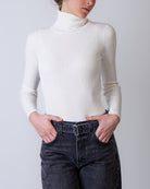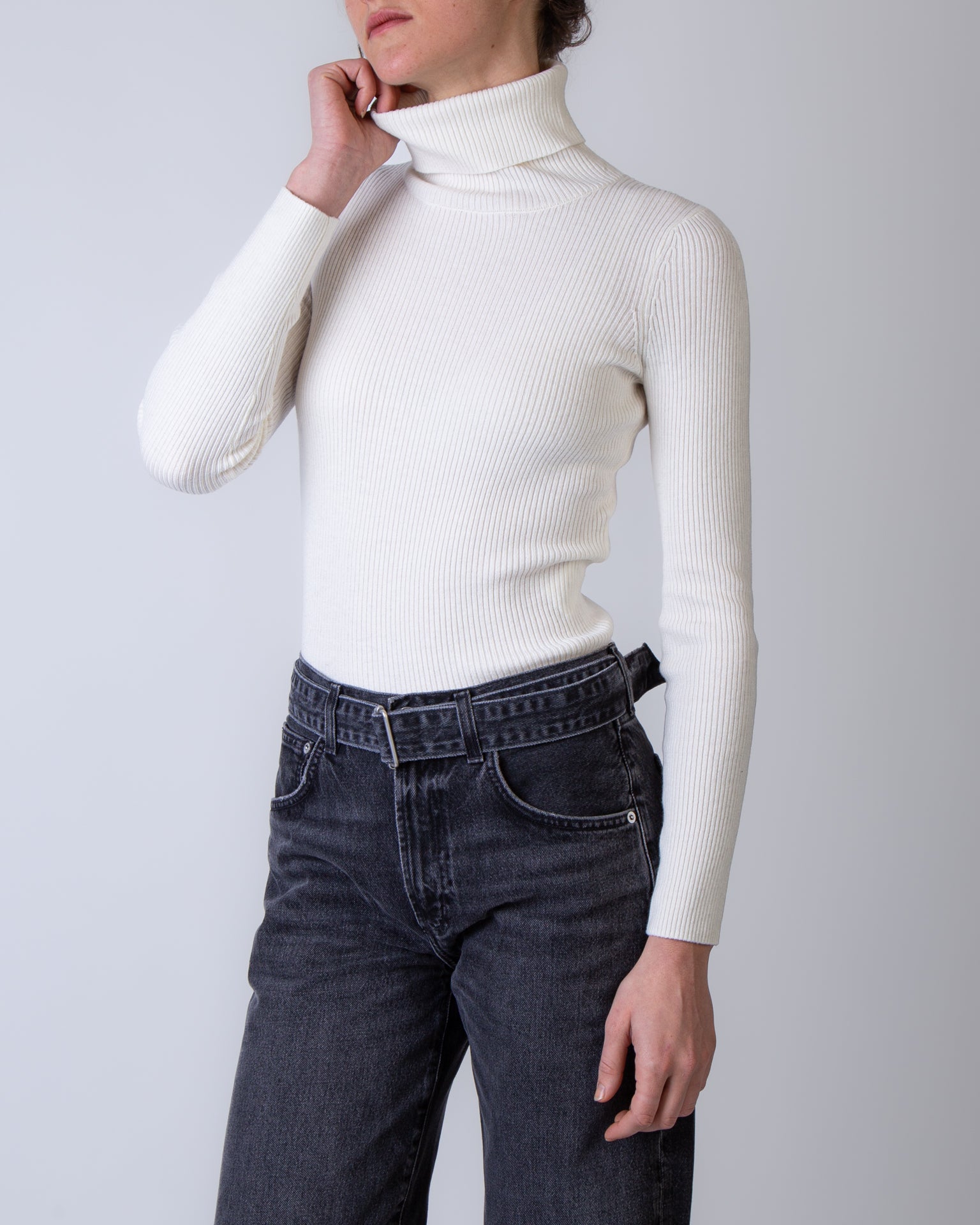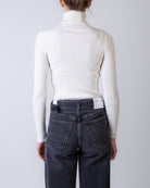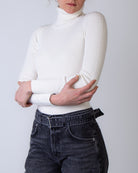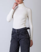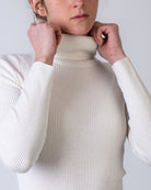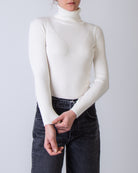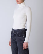 Vanessabruno, maglia donna 3HVC10 V15793 003 avorio, frontenille dolcevita manica lunga. La modella è alta 175 cm e indossa una taglia 1