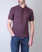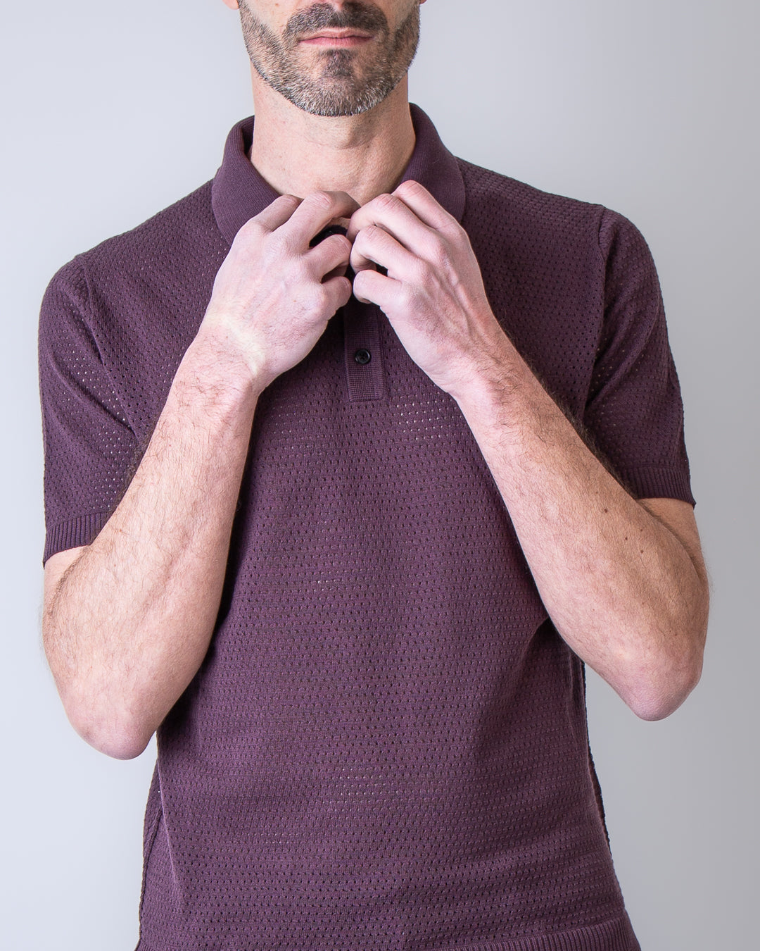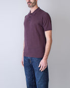 Roberto Collina, polo uomo M13224 37 bordeaux, con bottoni, manica corta, lavorazione a rete, 100% cotone finezza 14. Il modello è alto 186 cm e indossa la taglia 50