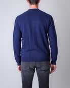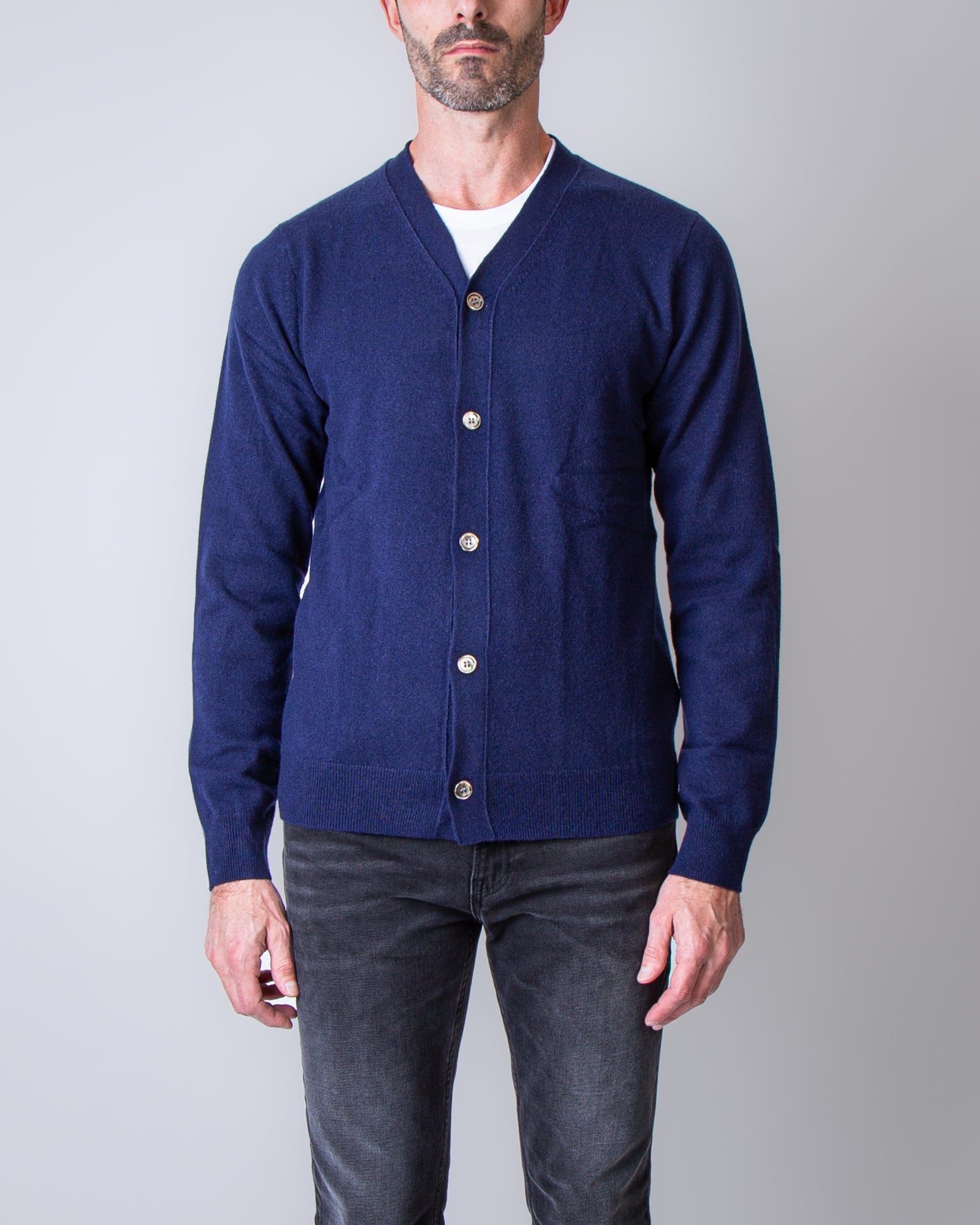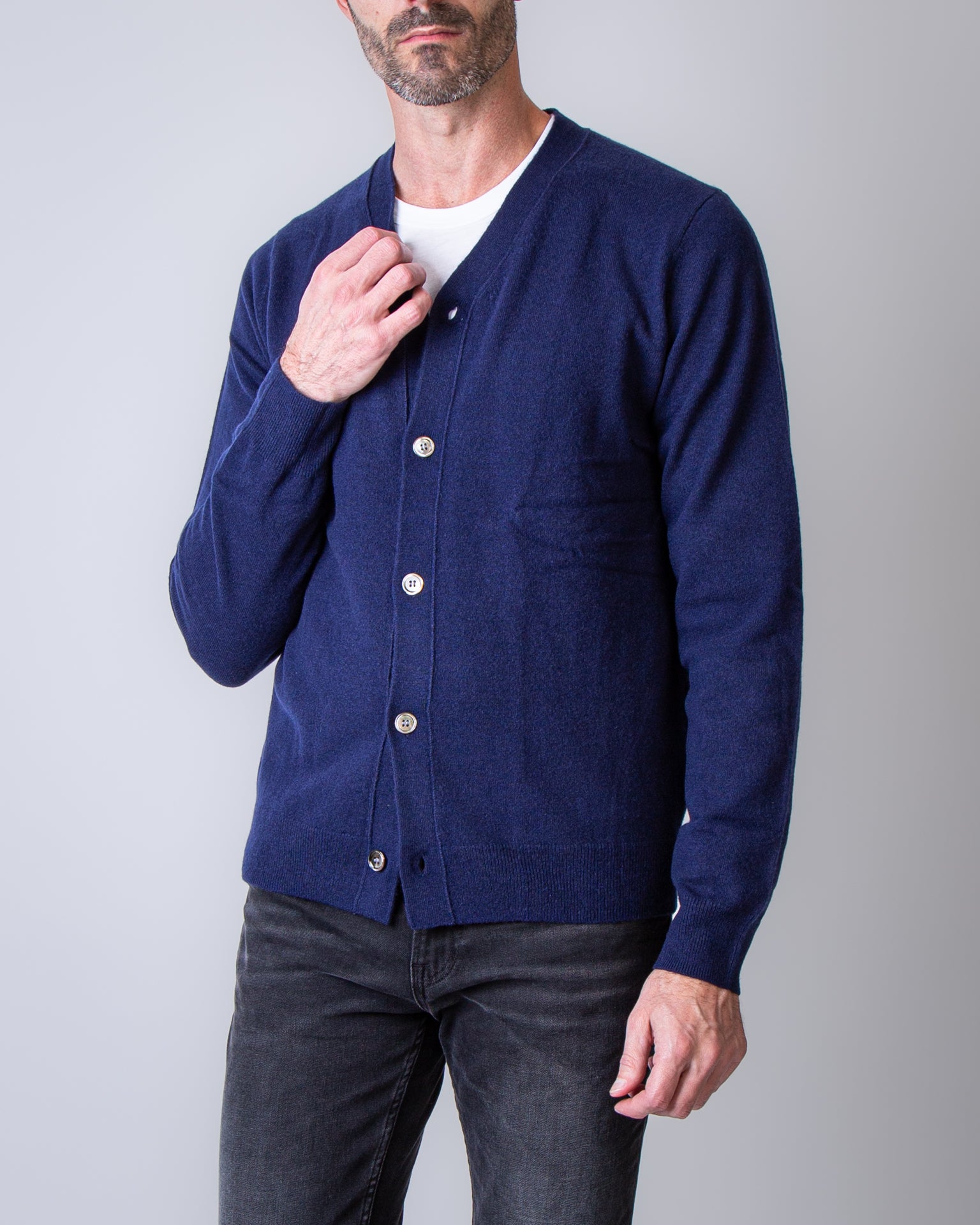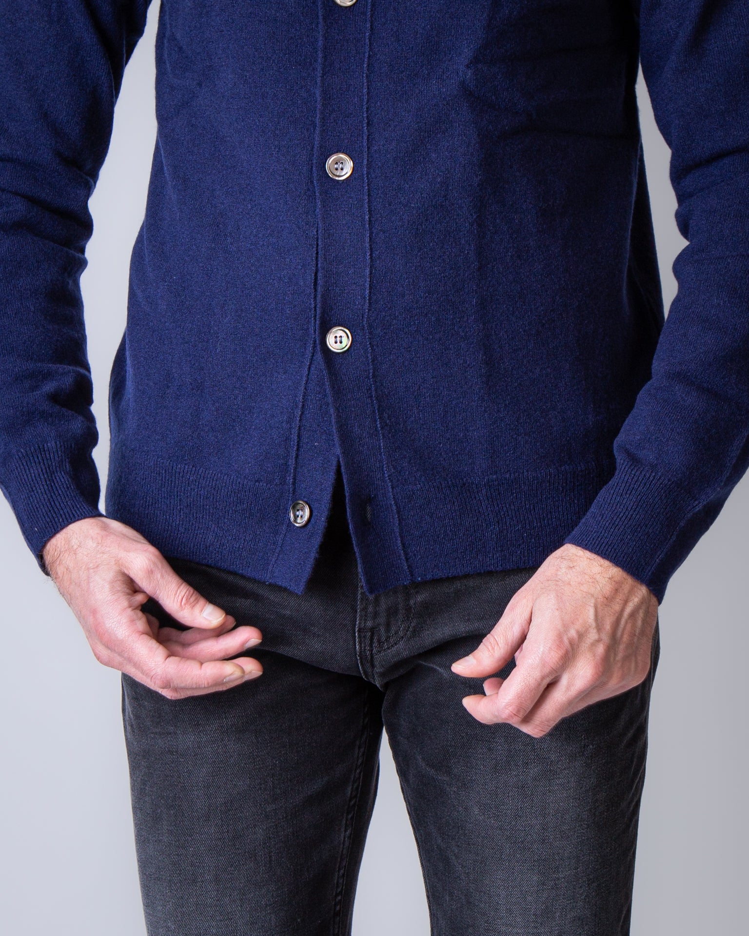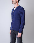 Comme Des Garçons Shirt, men's sweater FZ-N105 NAVY blue, 100% wool cardigan. The model is 186 cm tall and wears size M.