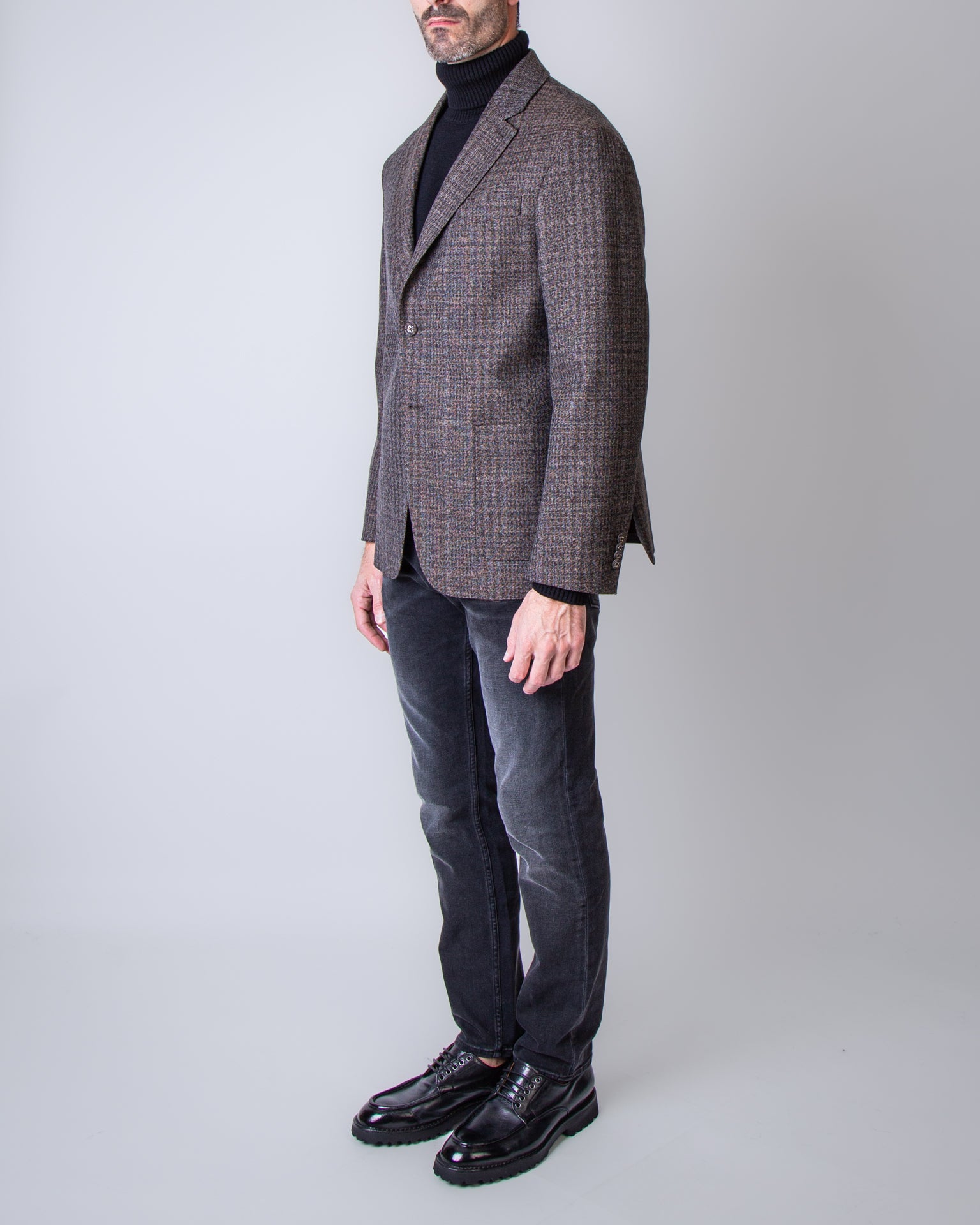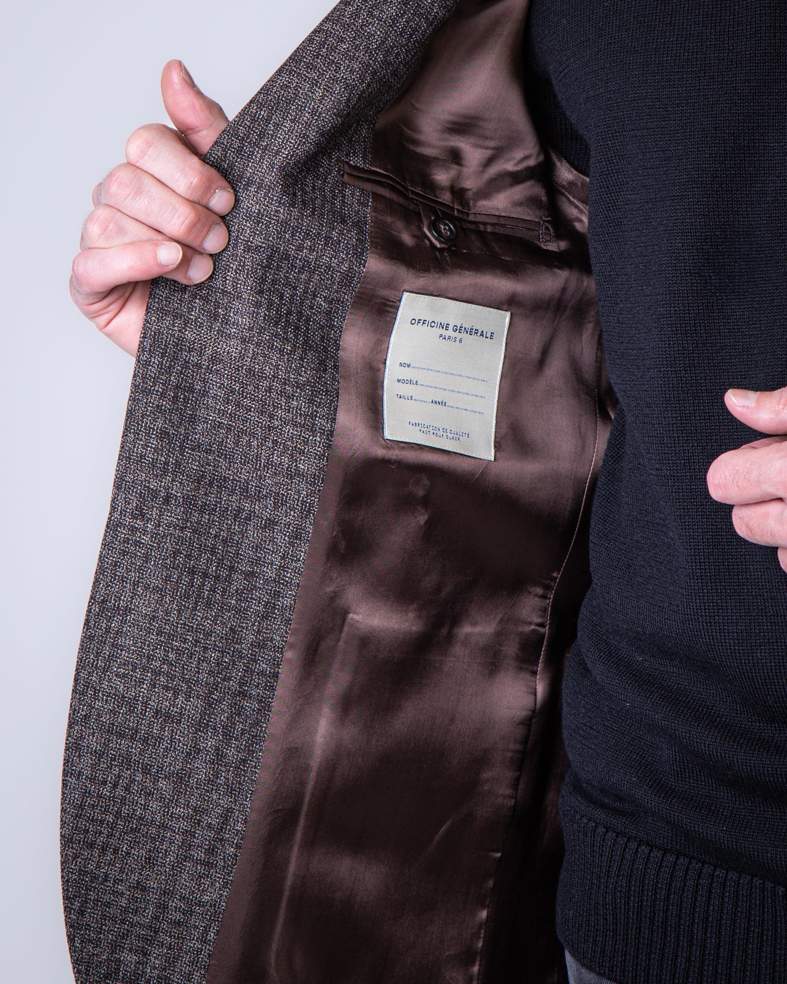 Officine Generale, MTLG405 COFFEE men's jacket, brown, textured, 100% wool. The model is 186 cm tall and wears a size 52.