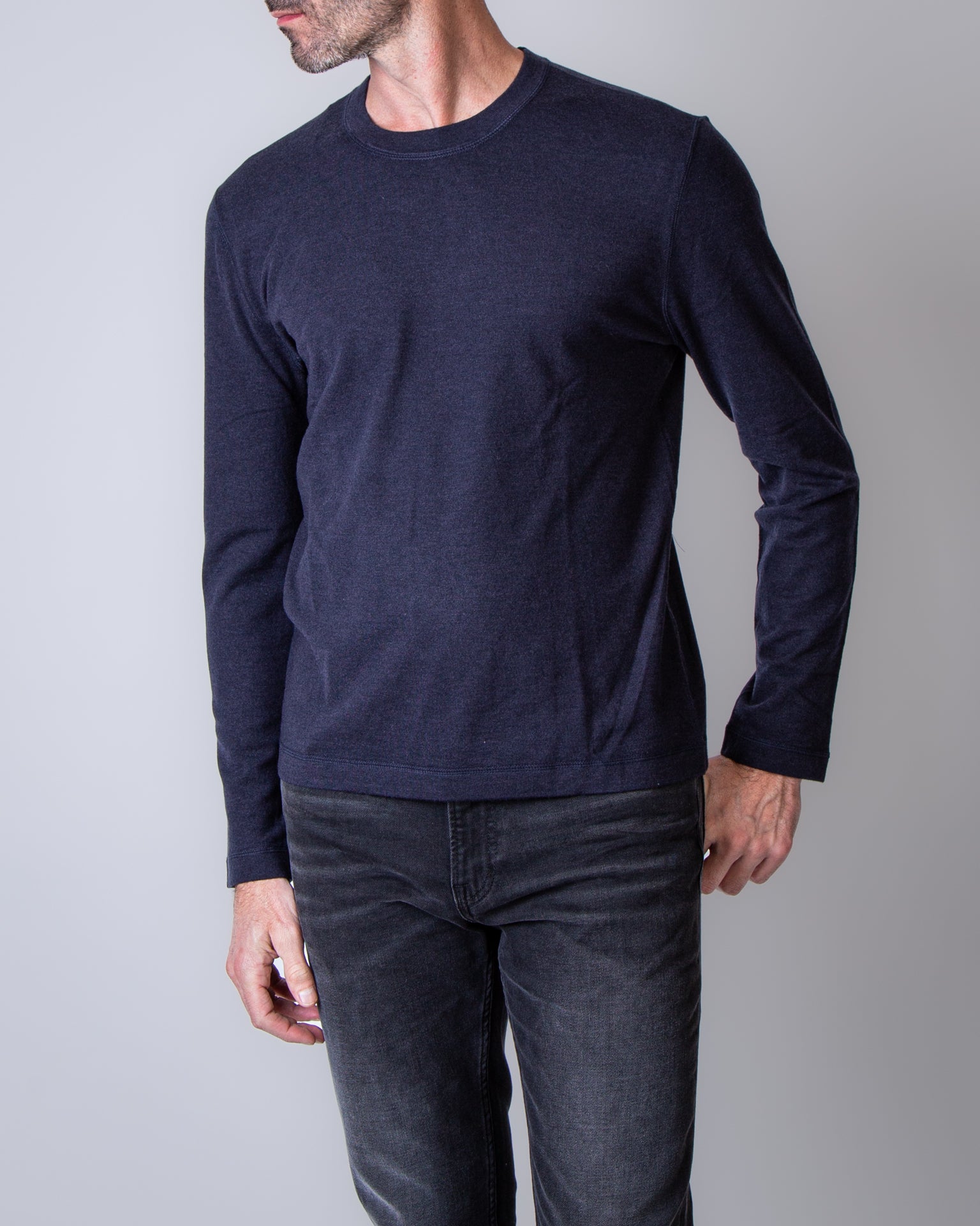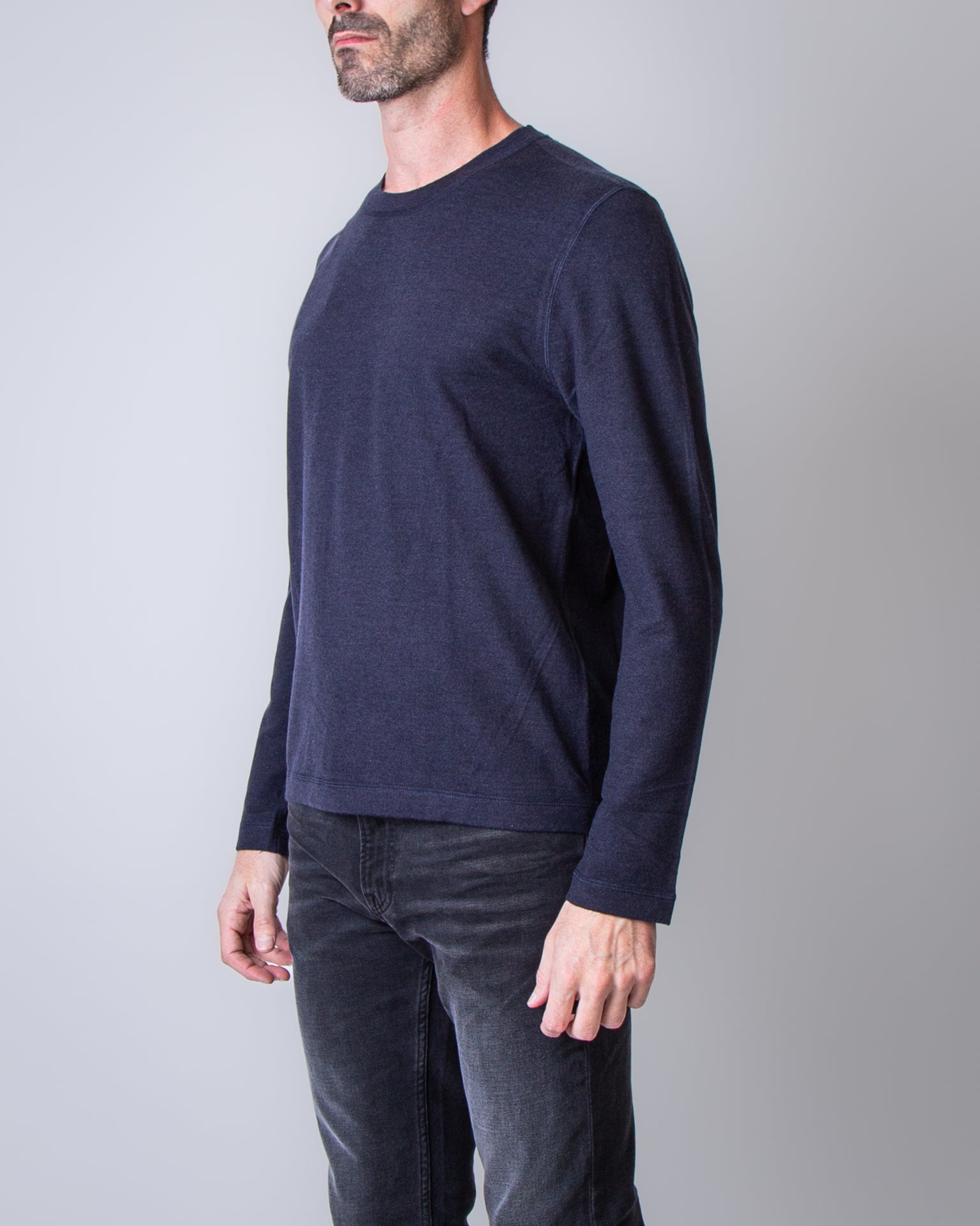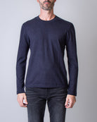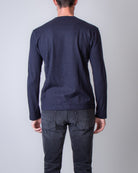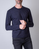 Officine Generale, men's MTEE206 navy blue heavyweight long-sleeved T-shirt, 85% lyoncell, 15% wool. The model is 186 cm tall and wears size L.
