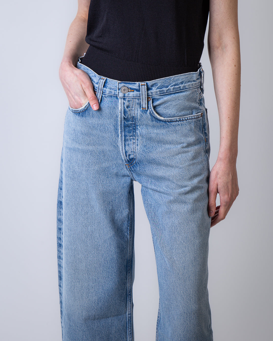 Agolde, women's jeans A257-1371 OTN blue, model orten arc j. The model is 175cm tall and wears size 26.