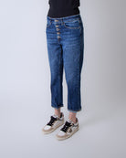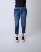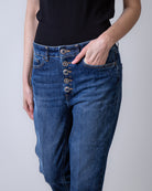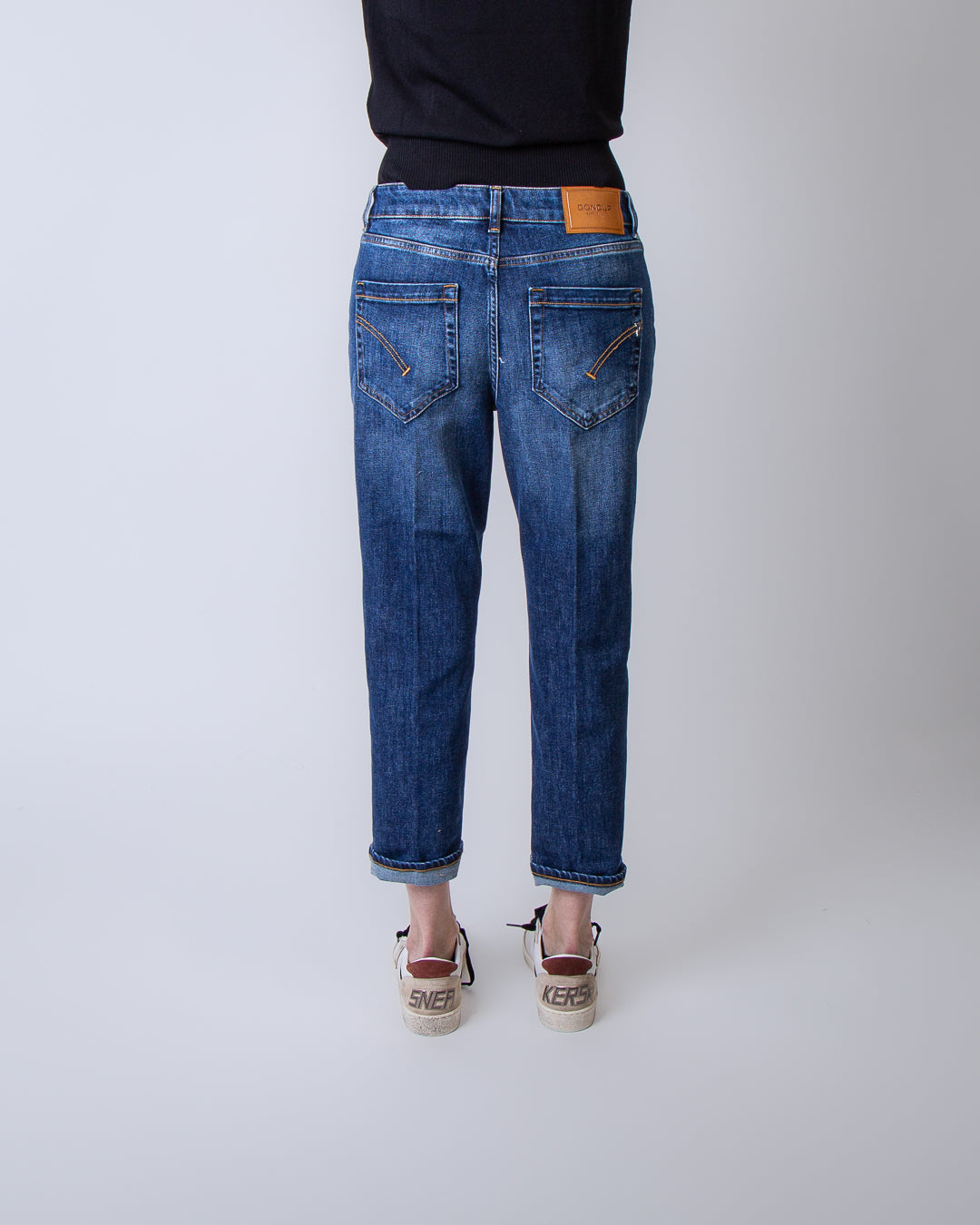 Dondup, women's jeans DP268B DSE340D K07 800 blue, Koons style with jewel button. The model is 175 cm tall and wears a size 26.