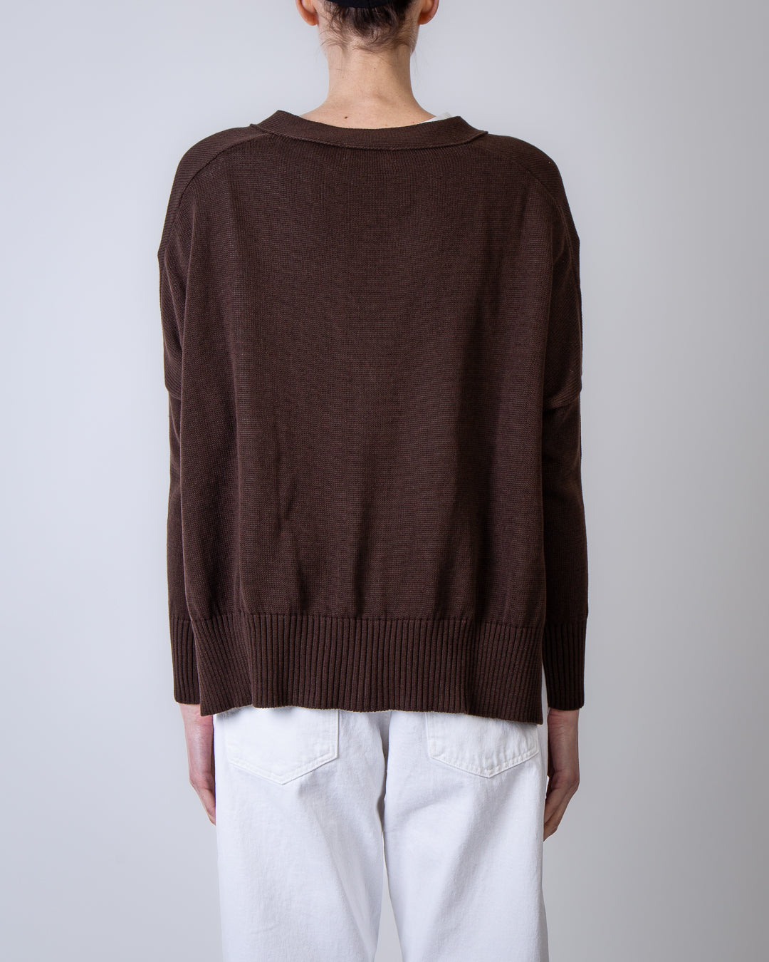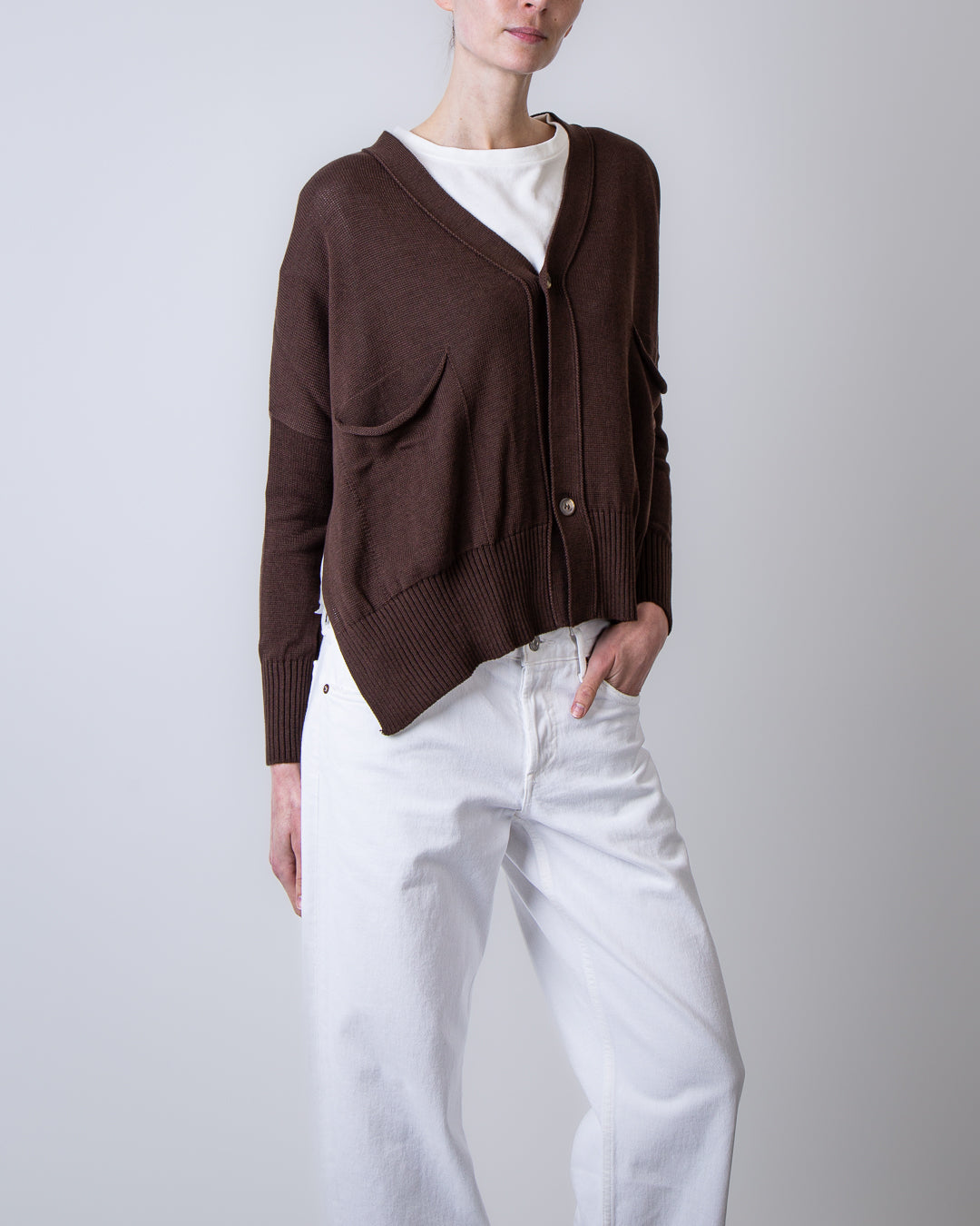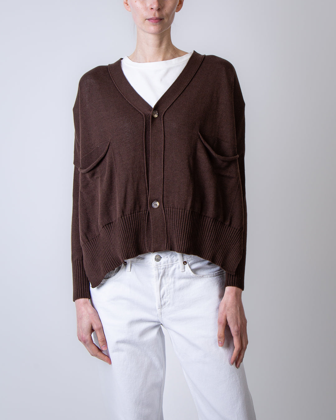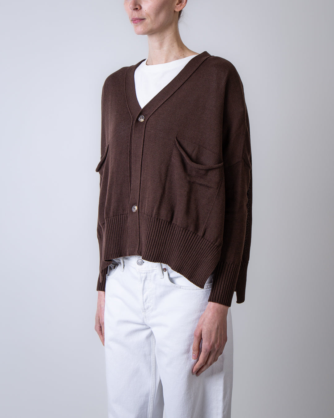 Ma'ry'ya, women's sweater YSK033 B10 brown, V-neck cardigan with buttons and pockets, 100% cotton. The model is 175 cm tall and wears size S.