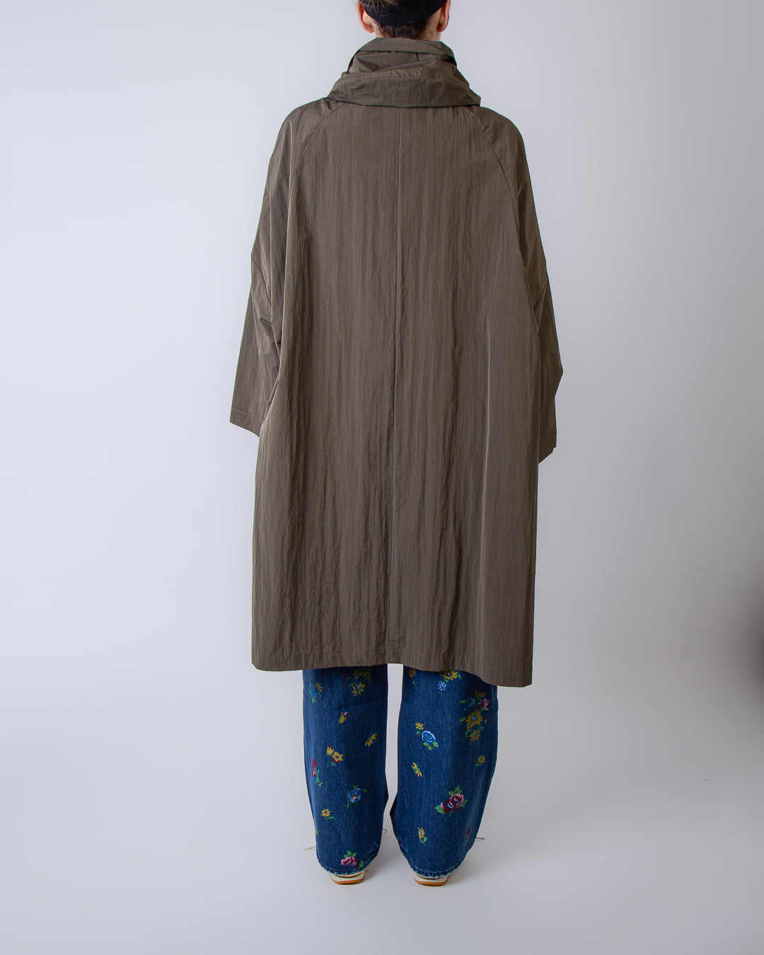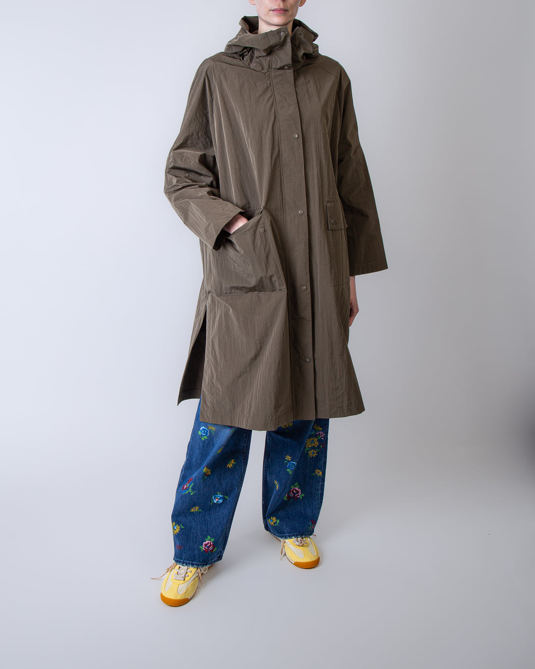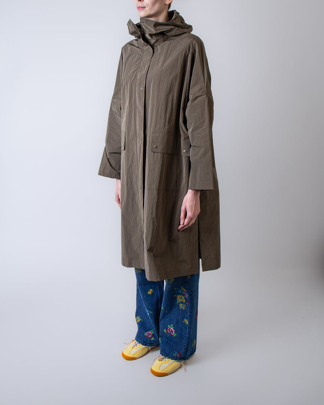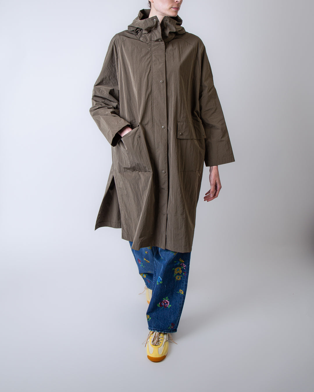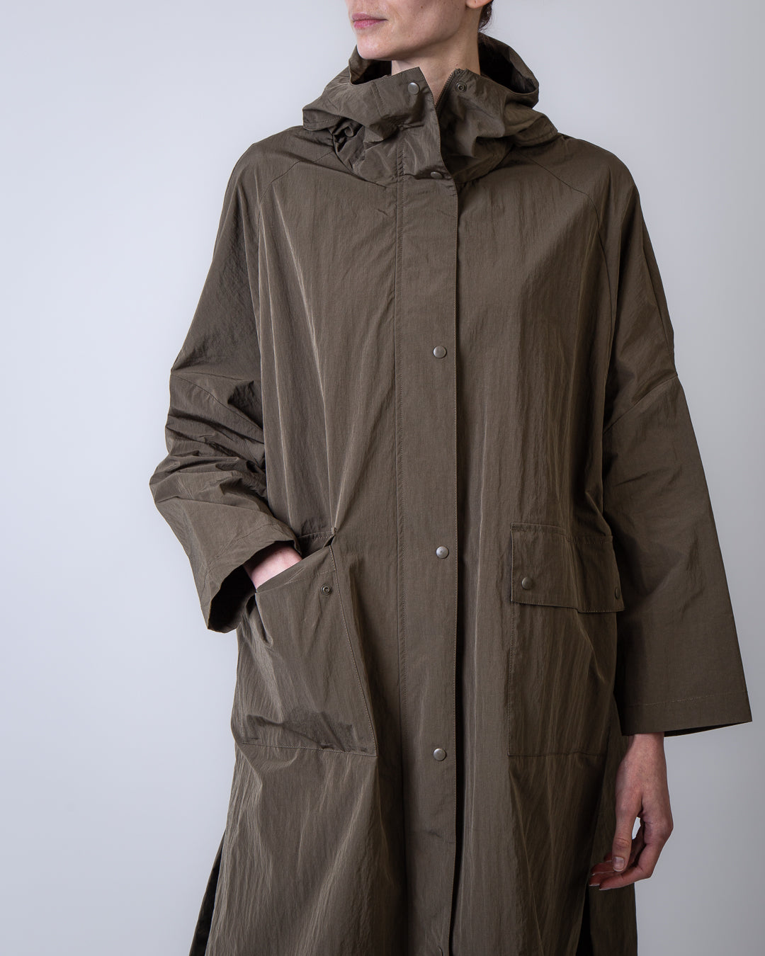 Palto', VIOLETTA 338 women's raincoat, green, long crinkle peach. The model is 175 cm tall and wears size XS.