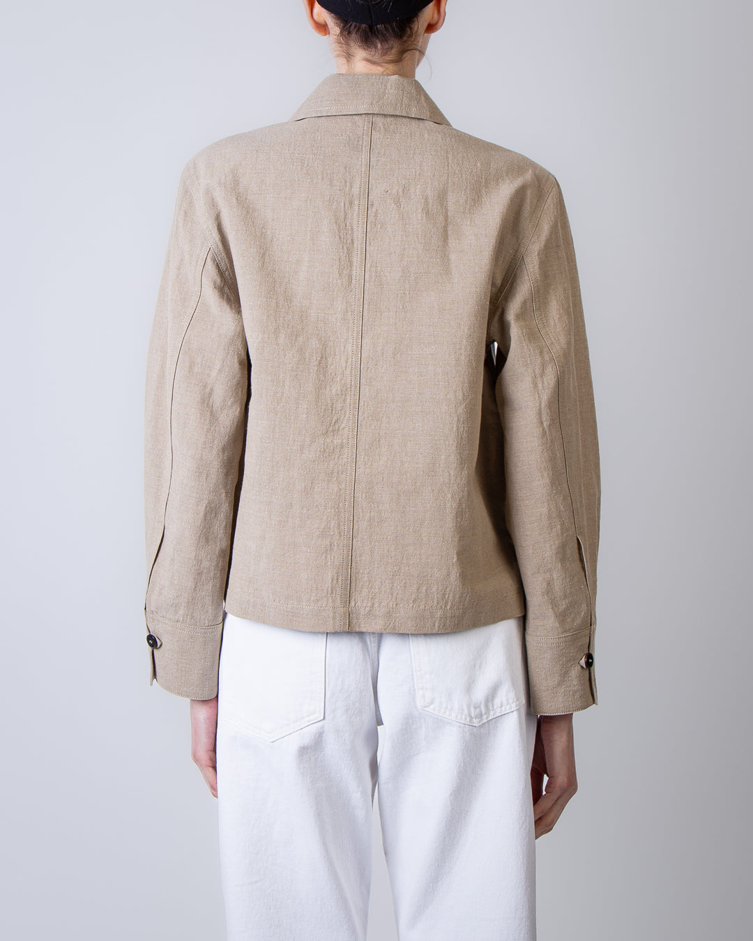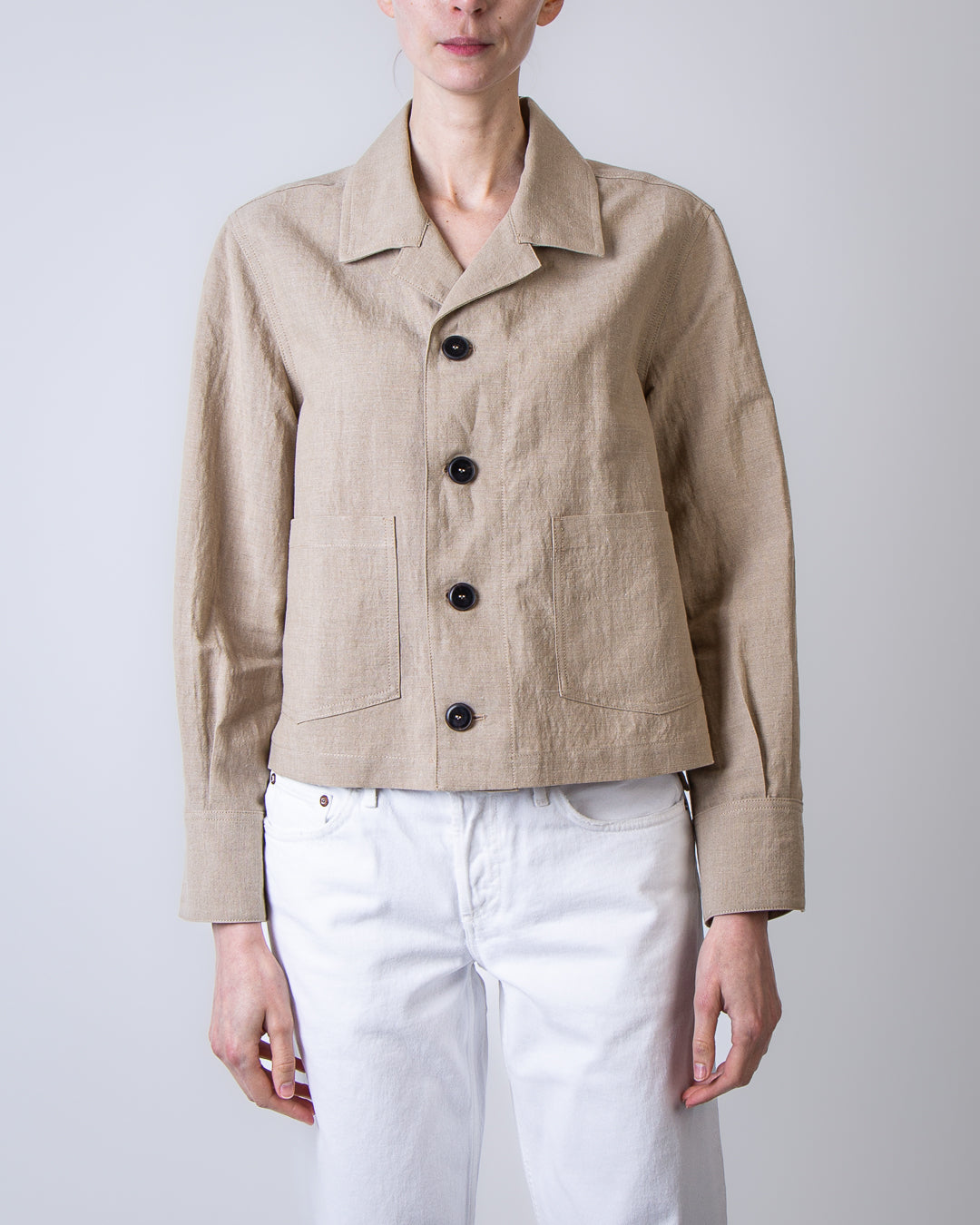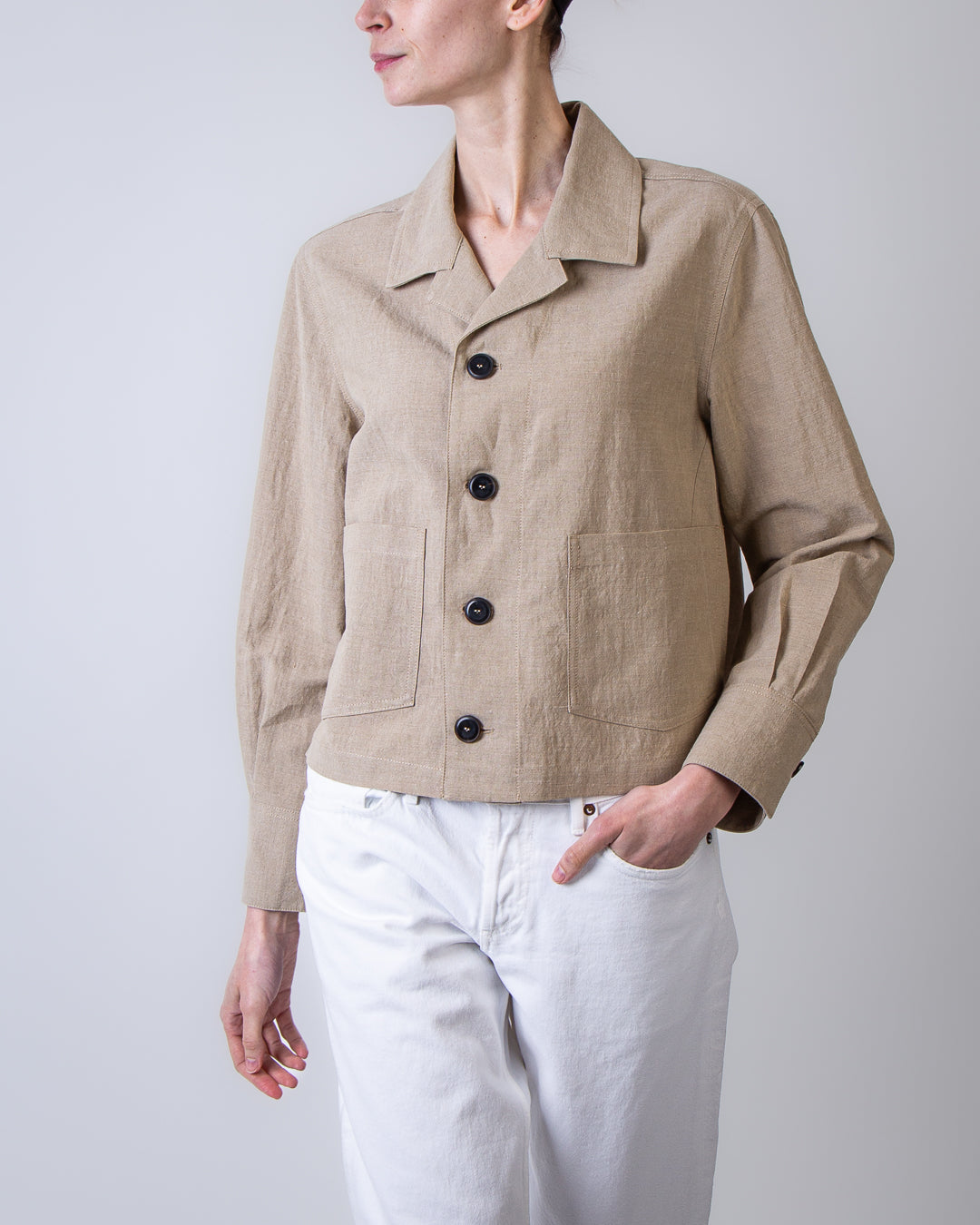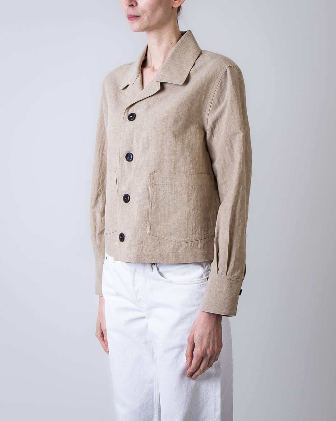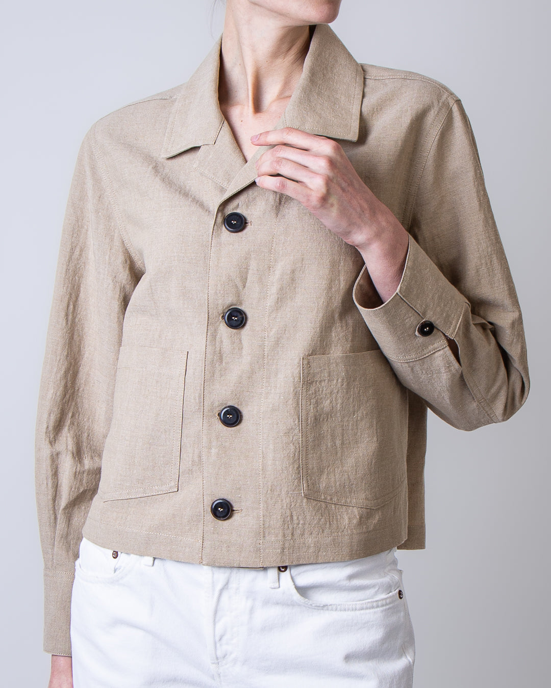 Pomandere, women's jacket 4194-25784 250 beige, four-button deconstructed boxy patch pocket, faded linen taffeta, 54% linen, 46% cotton. The model is 175 cm tall and wears a size 40.