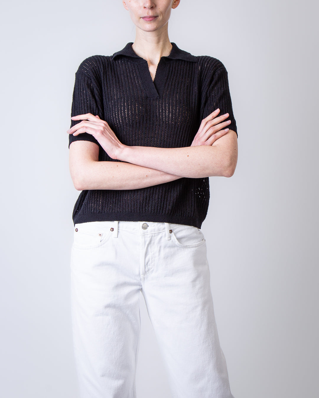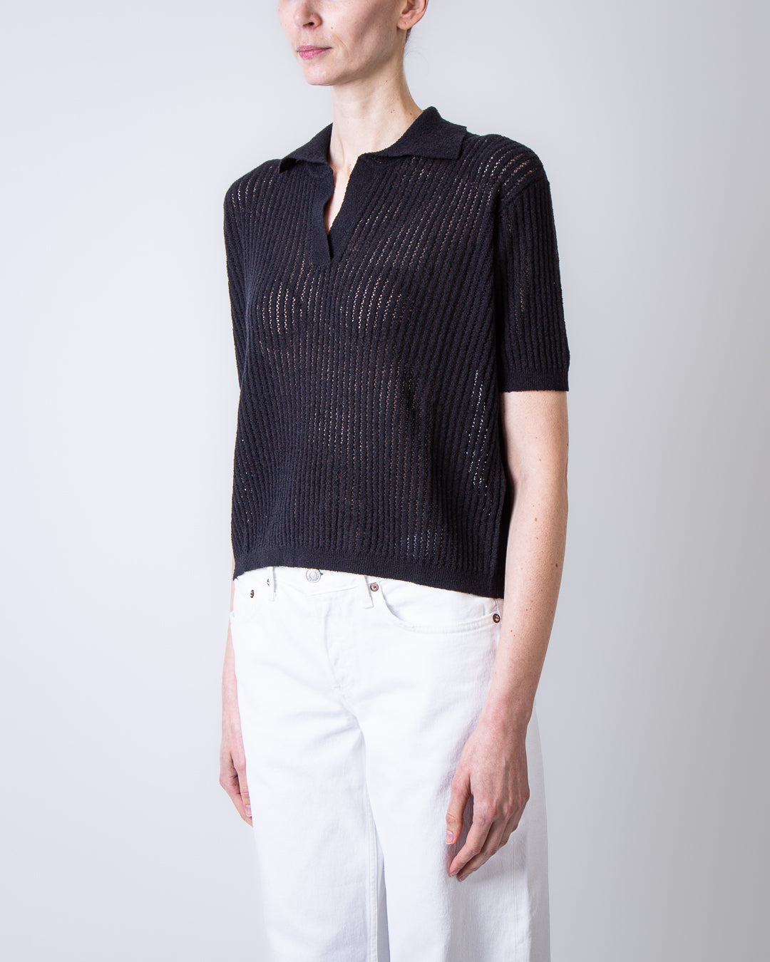 Roberto Collina, women's F20024 09 black polo shirt, perforated short sleeves, 70% cotton, 30% polyamide. The model is 175 cm tall and wears size S.