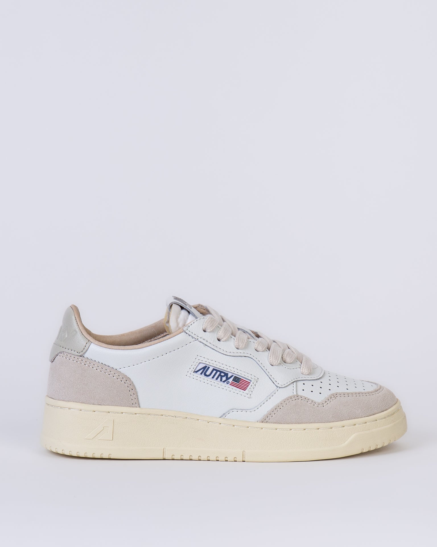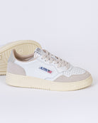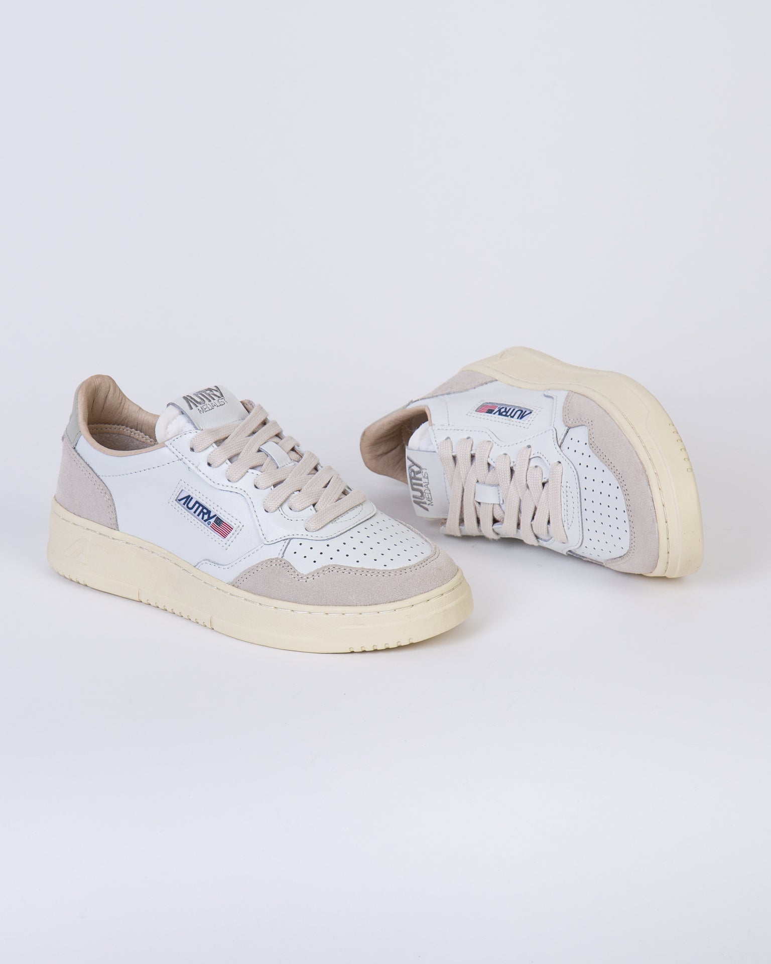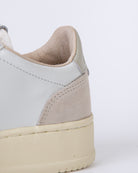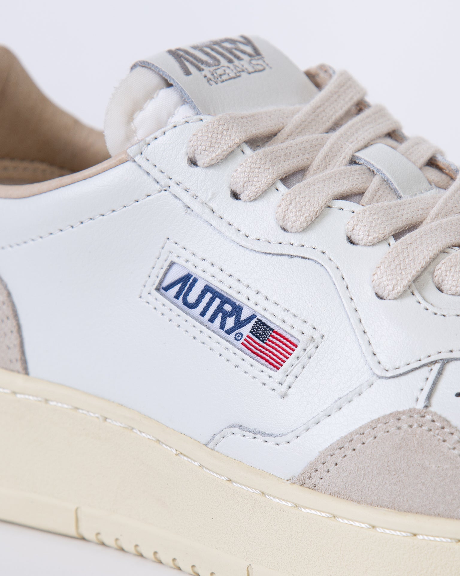 Autry, sneakers donna AULW-LS 14 bianco, medalist con tomaia in pelle e dettagli camoscio, talloncino color fango con logo. La scarpa scattata è una taglia 39