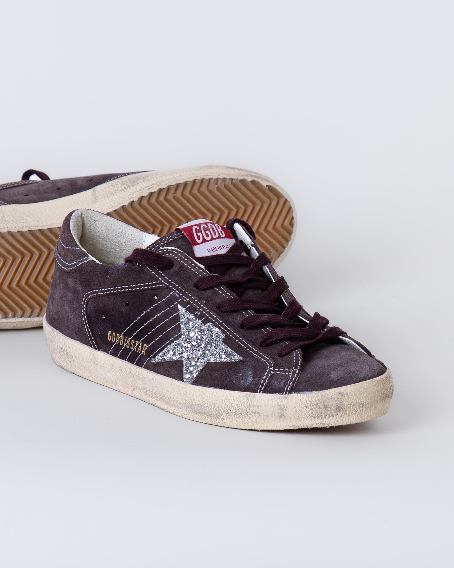 Golden Goose, women's sneakers GWF00101.F007559 60574 anthracite, suede Superstar, silver star with glitter. The shoe pictured is a size 38.