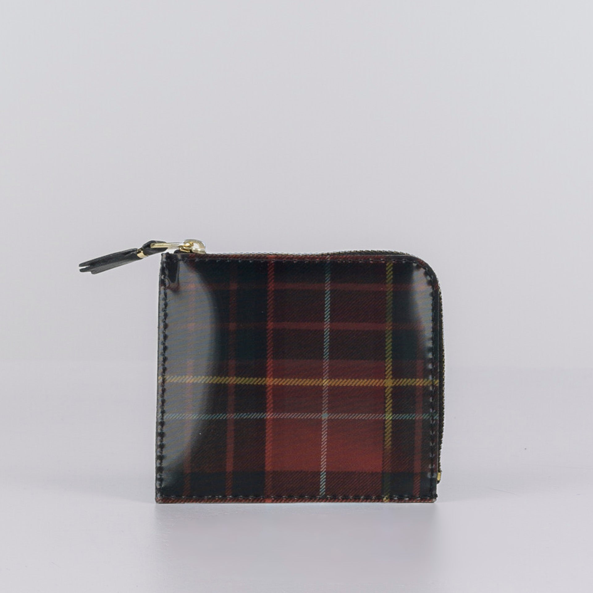 Red and green leather wallet. Gold zip closure.