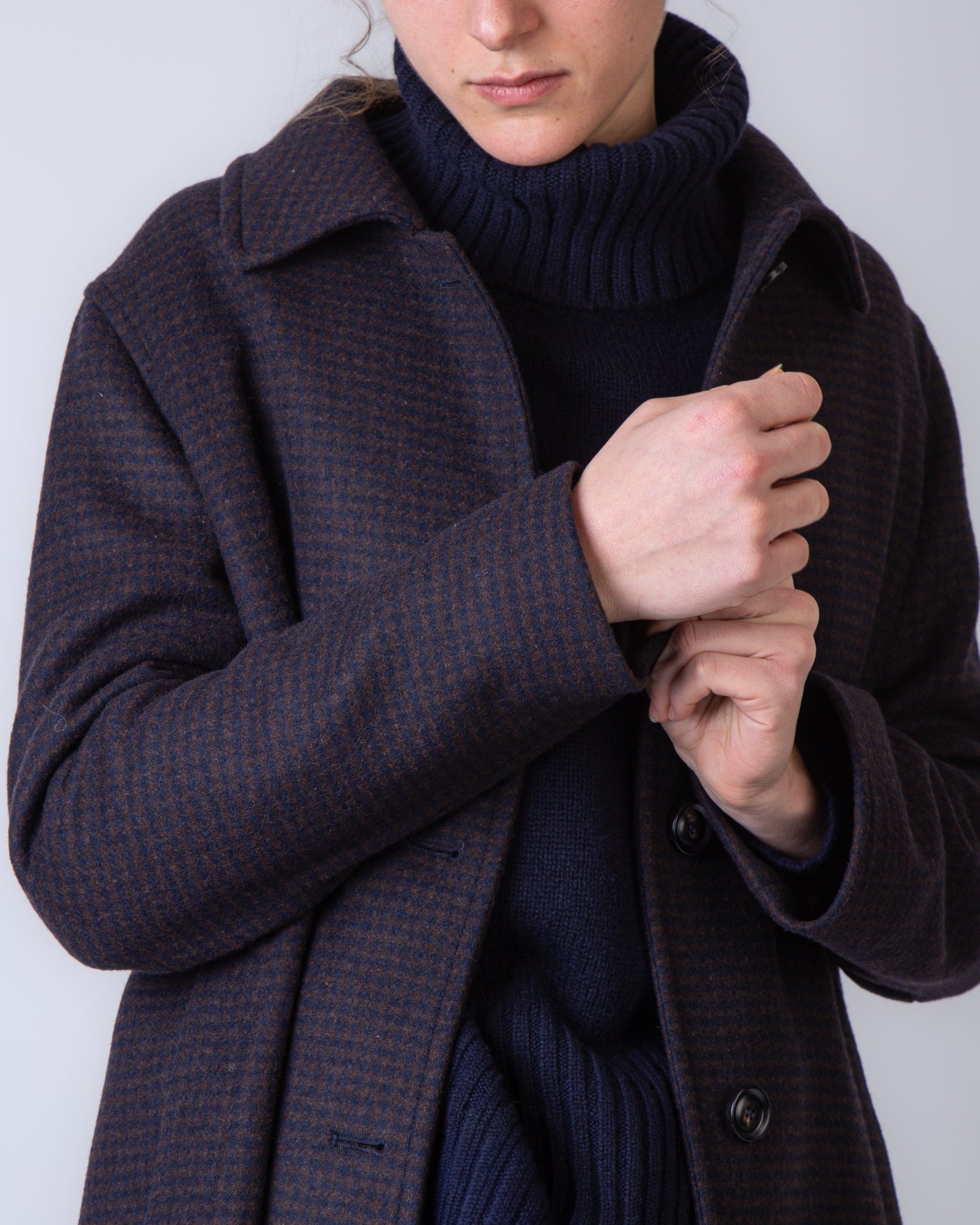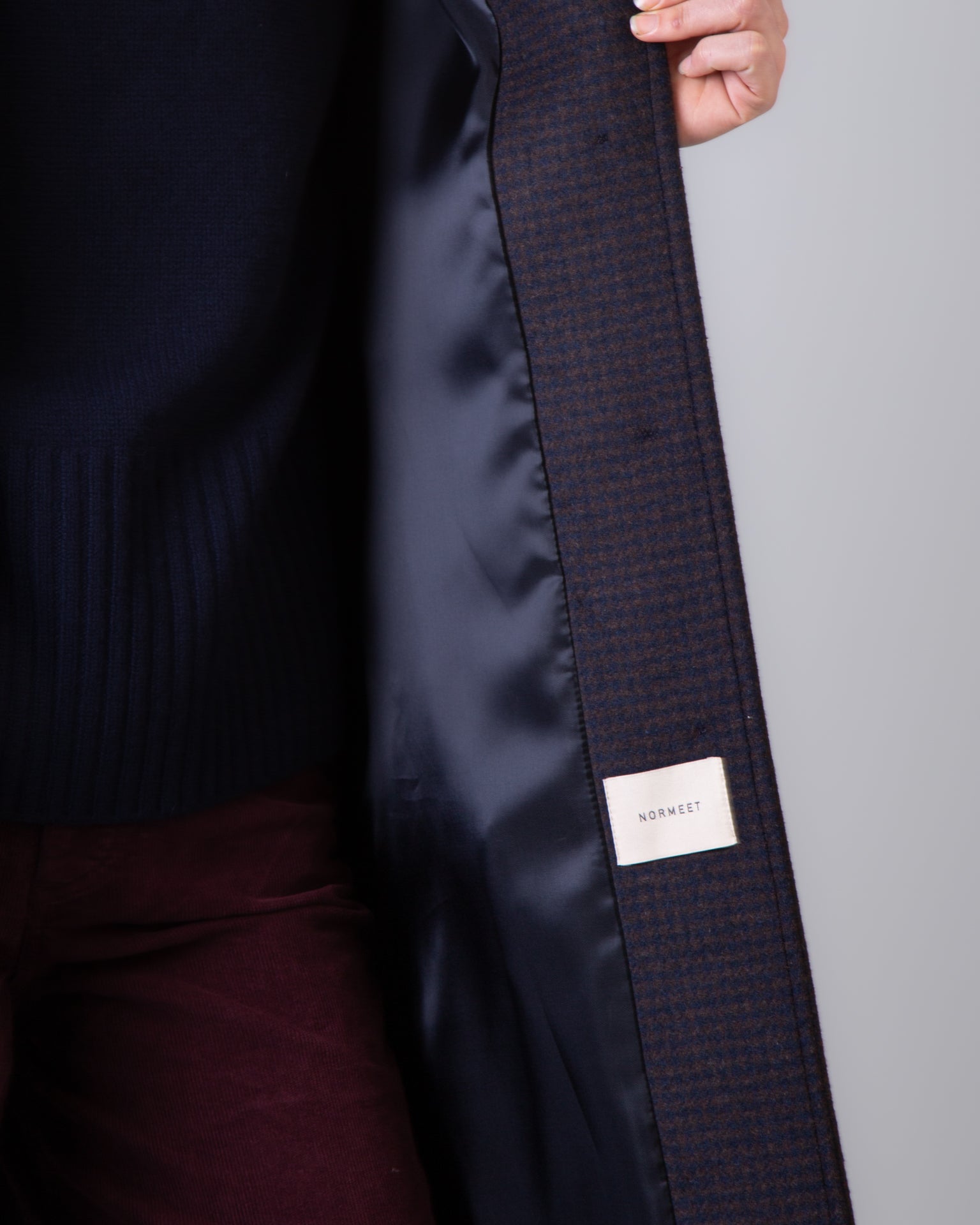 Normeet, women's coat 767 SAURO 55 brown, three-quarter length, college collar, diagonal pockets, 60% wool, 30% pl, 5% pa, 5% af pullover. The model is 175 cm tall and wears a size 42.