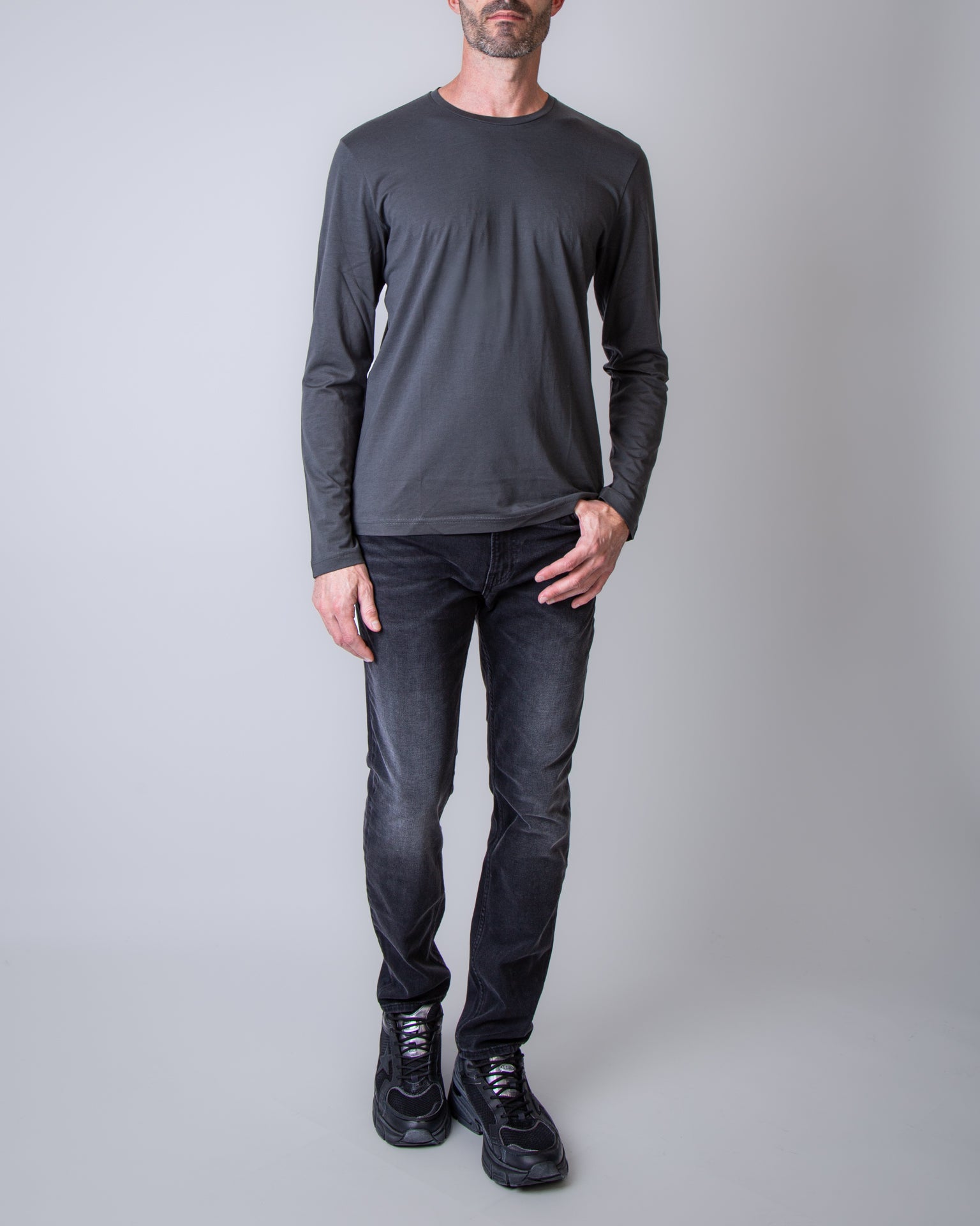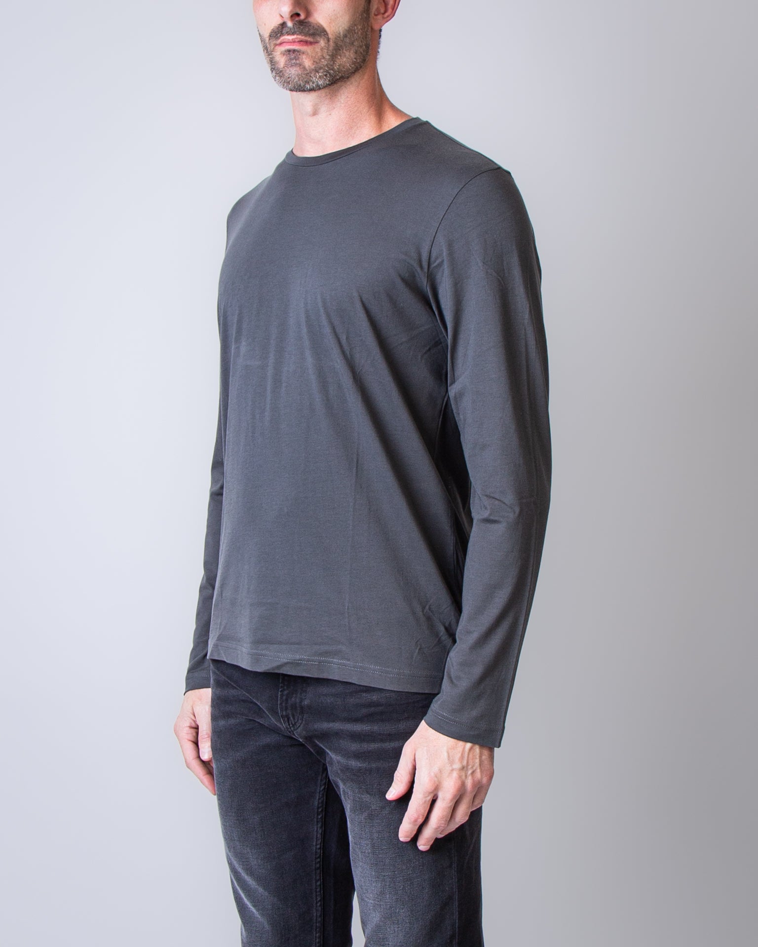 Stefan Brandt, men's ENNO LA 30 ALUMINIO T-shirt, gray, crew neck, long sleeves. The model is 186 cm tall and wears size L.
