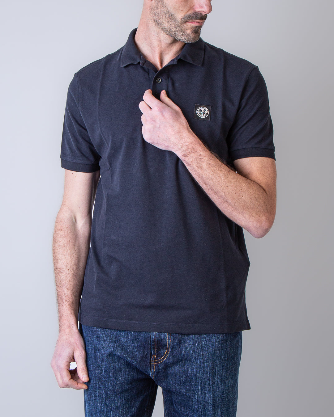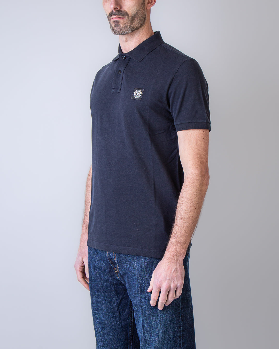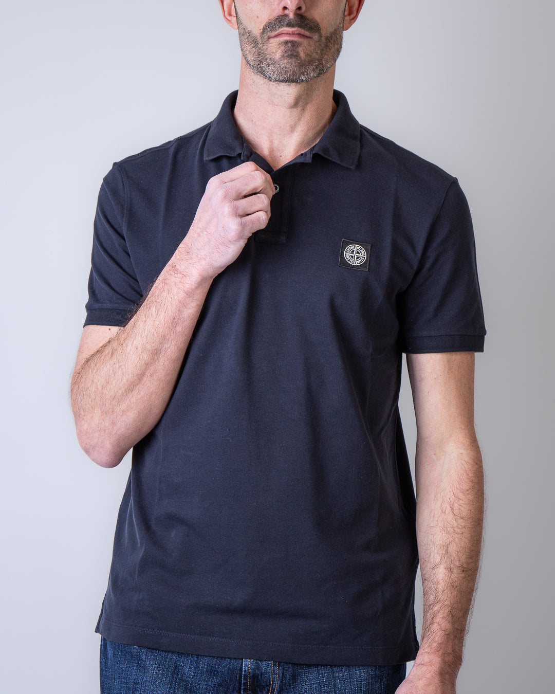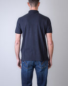 Stone Island, polo uomo 2200008 S0017 V0020 blu, jersey senza bordi, patch iconica con il logo del brand sul petto. Il modello è alto 186 cm e indossa la taglia L