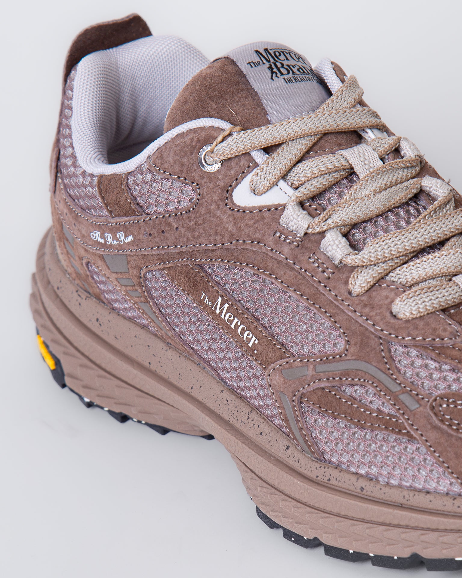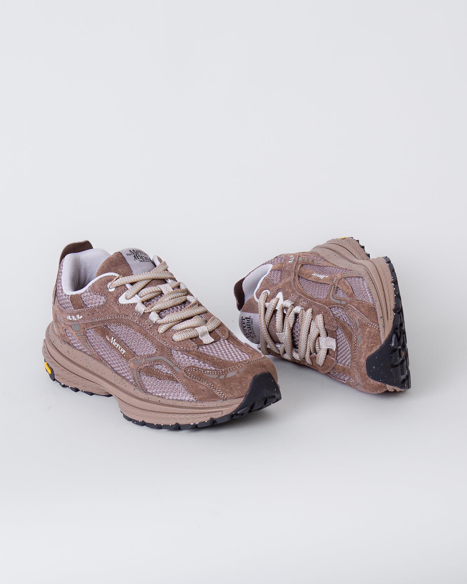 The Mercer Brand men's ME253016 800 brown sneakers, Re-Run model, Vibram sole, upper with mesh inserts. The shoe pictured is a size 42.
