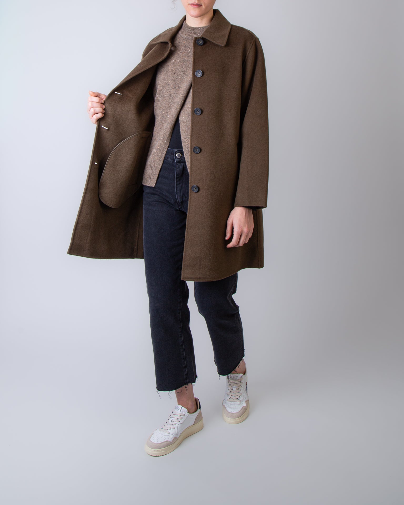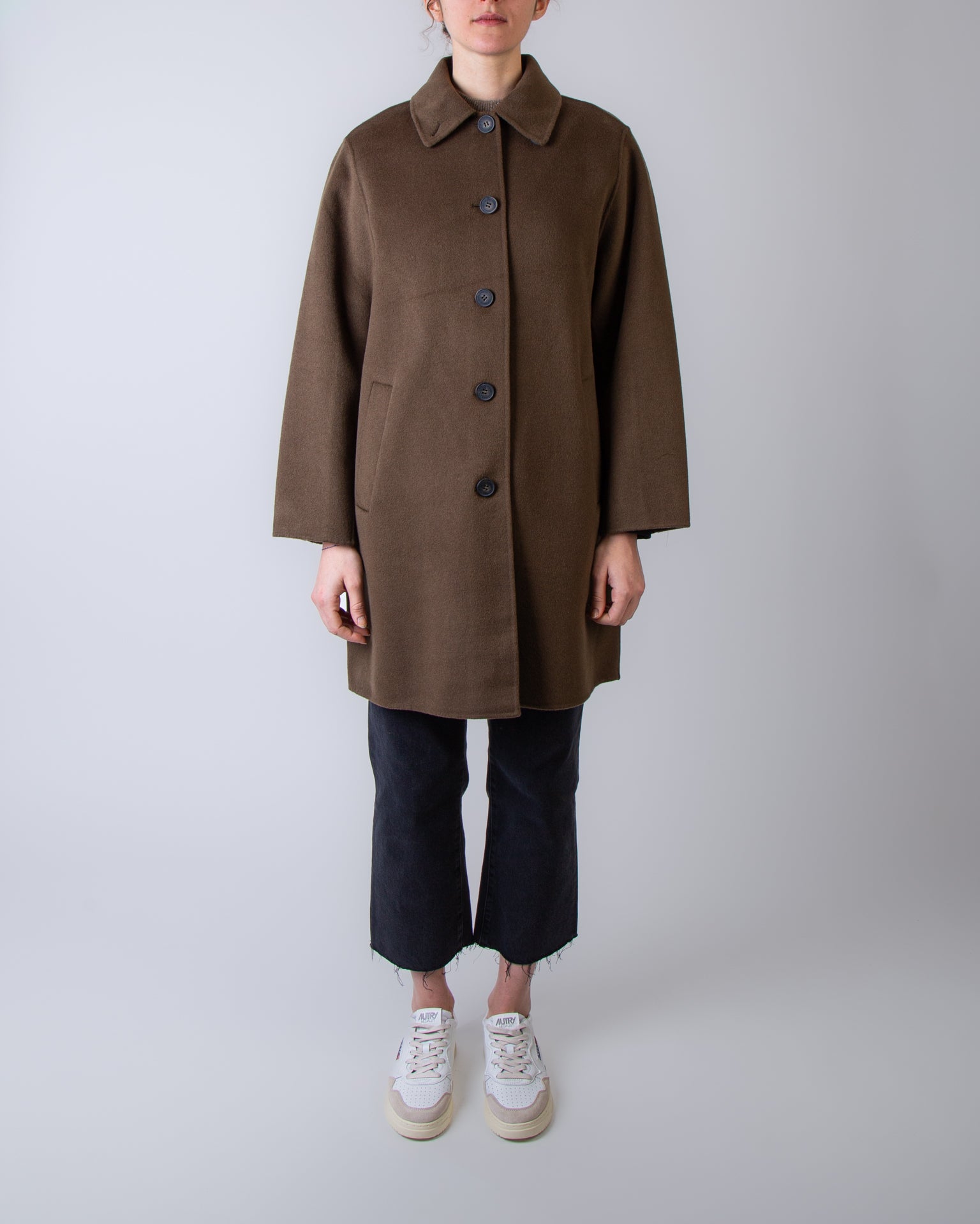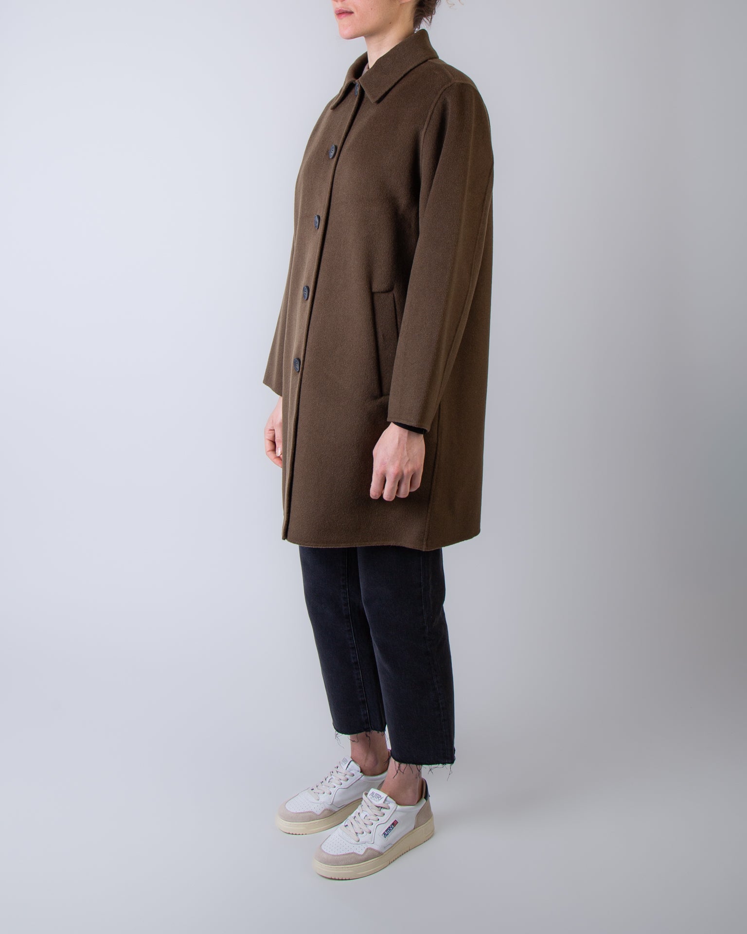 Vanessabruno, women's coat 1HVA25 V01809 613 green, three-quarter fabian cloth. The model is 175 cm tall and wears a size S.