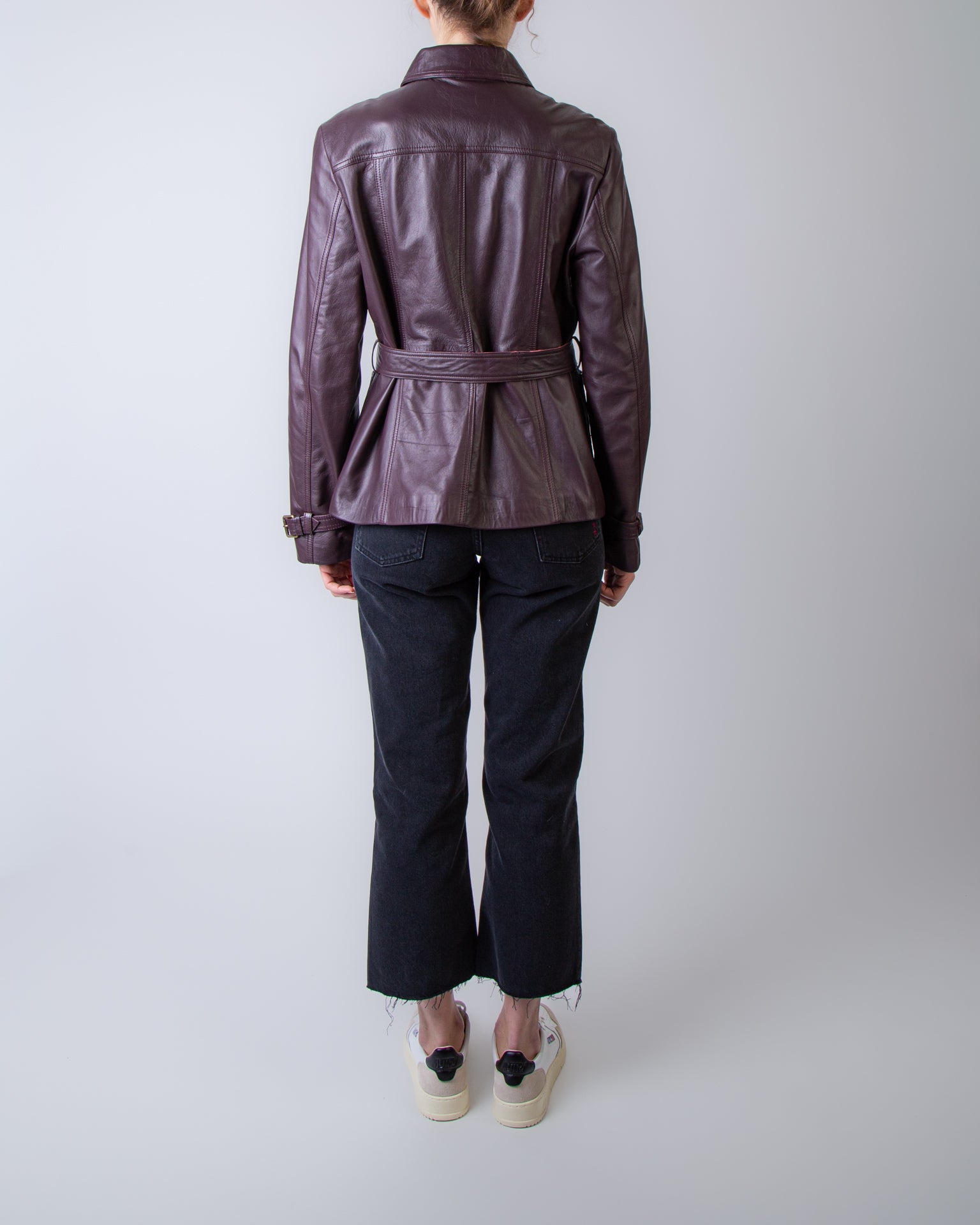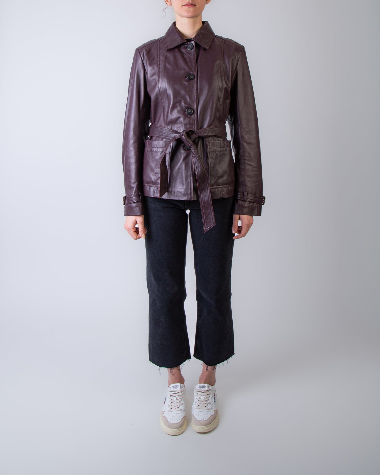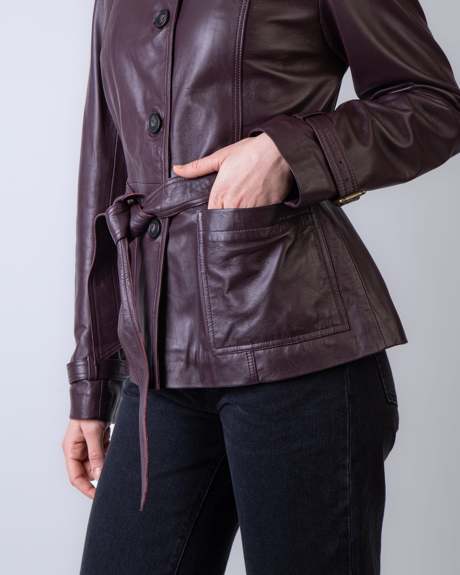 Vanessabruno, women's jacket 4HVH02 V03732 566 burgundy, Francisco faux leather with belt. The model is 175 cm tall and wears a size L.