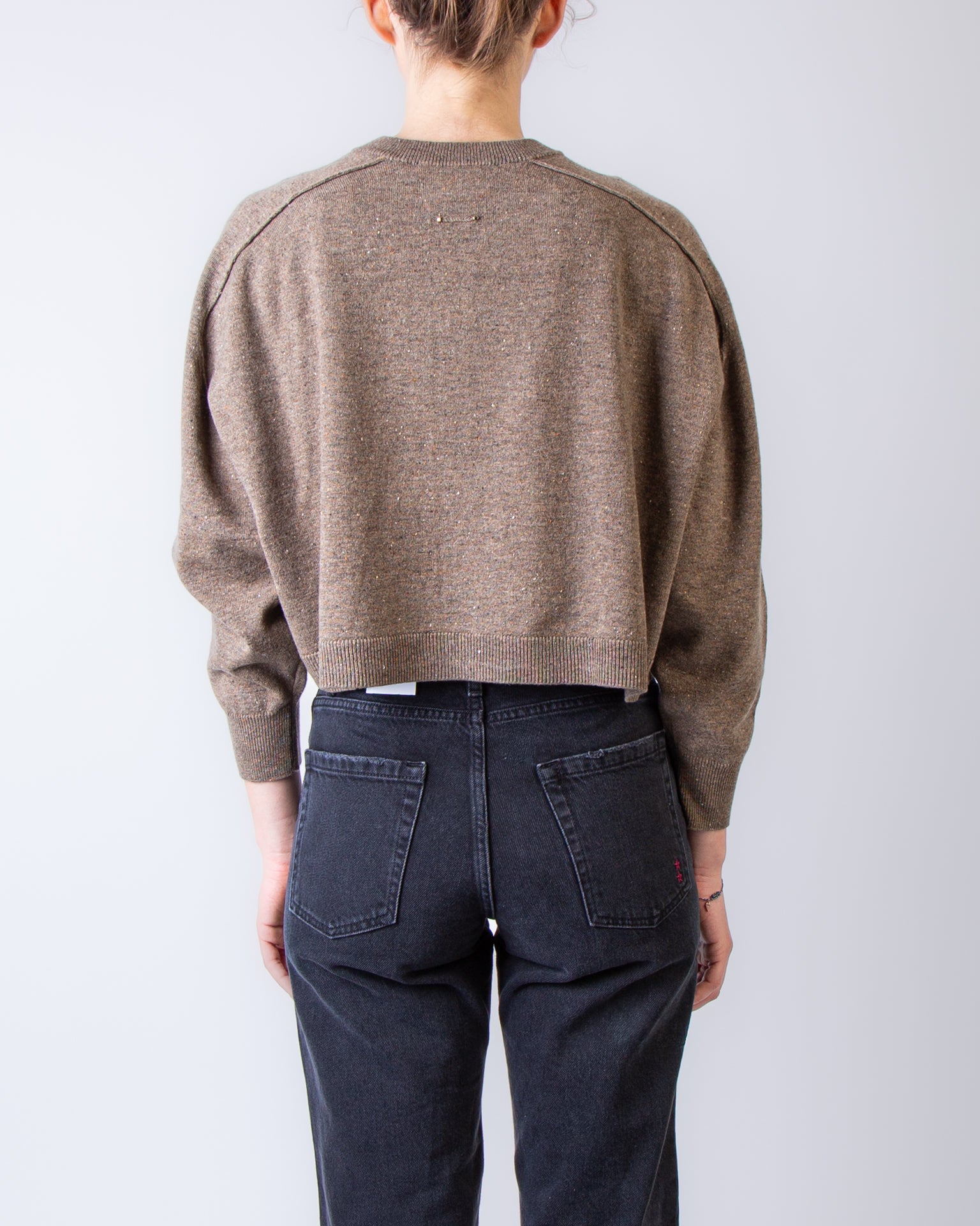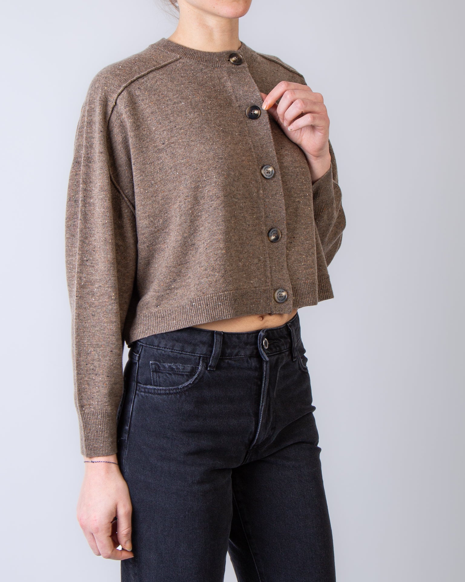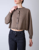 Vanessabruno, brown sweater 3EVC04 V03345 122, Rebecca douve boxy cardigan. The model is 175 cm tall and wears a size S.