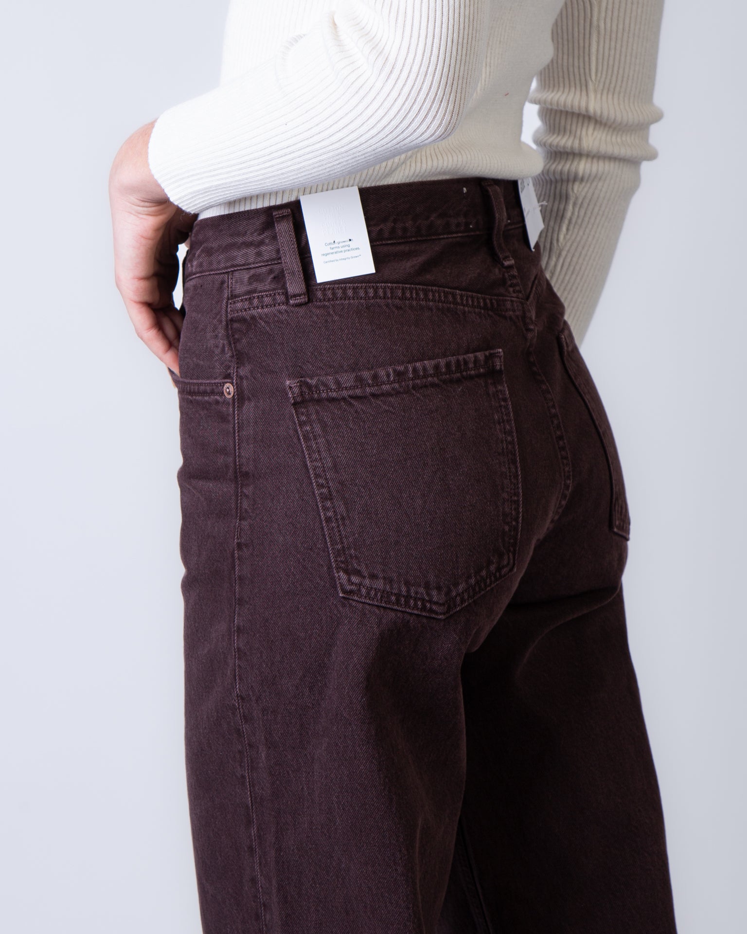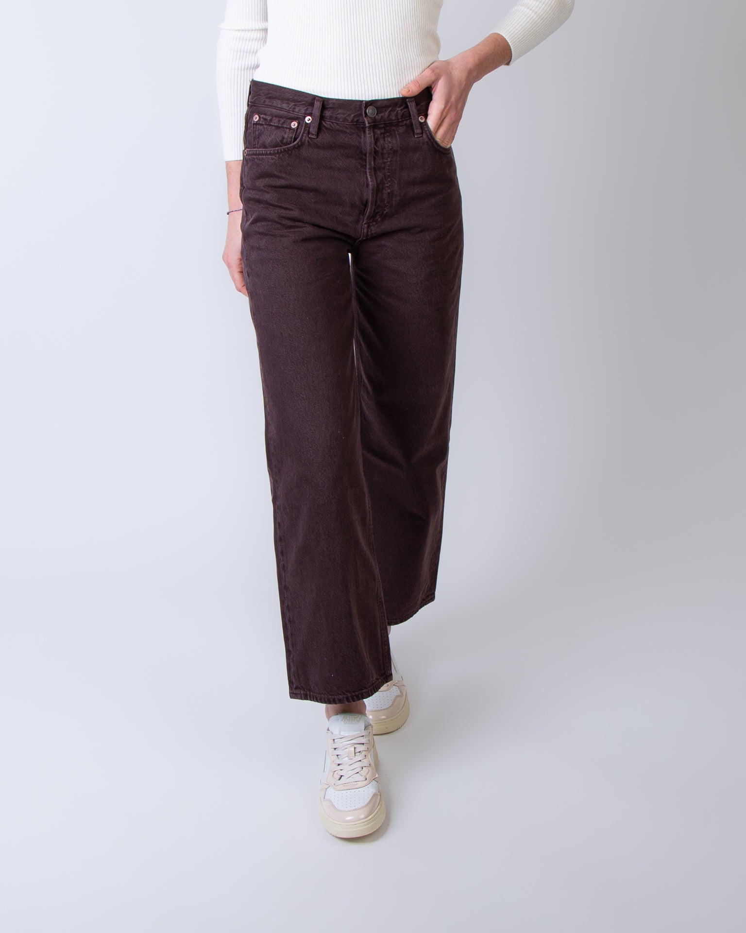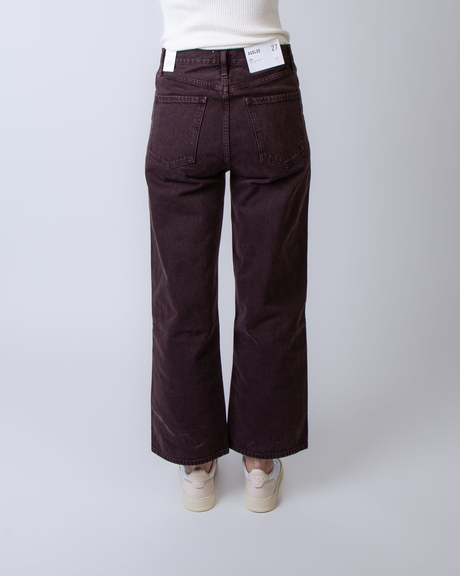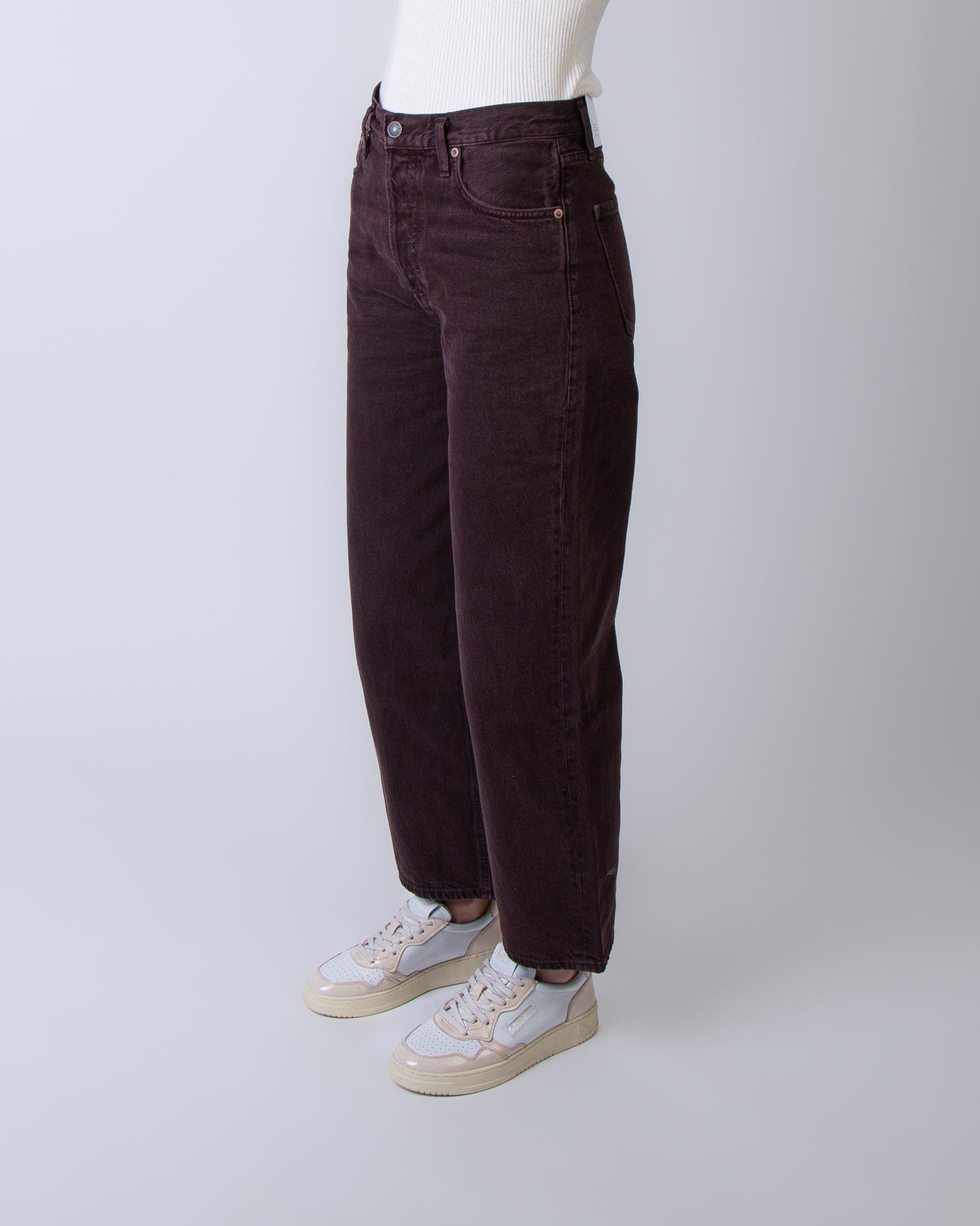 Agolde, jeans donna A9191E-1183 SLBRR bordaux, ren in sloe berry. La modella è alta 175cm e indossa una taglia 27