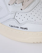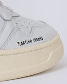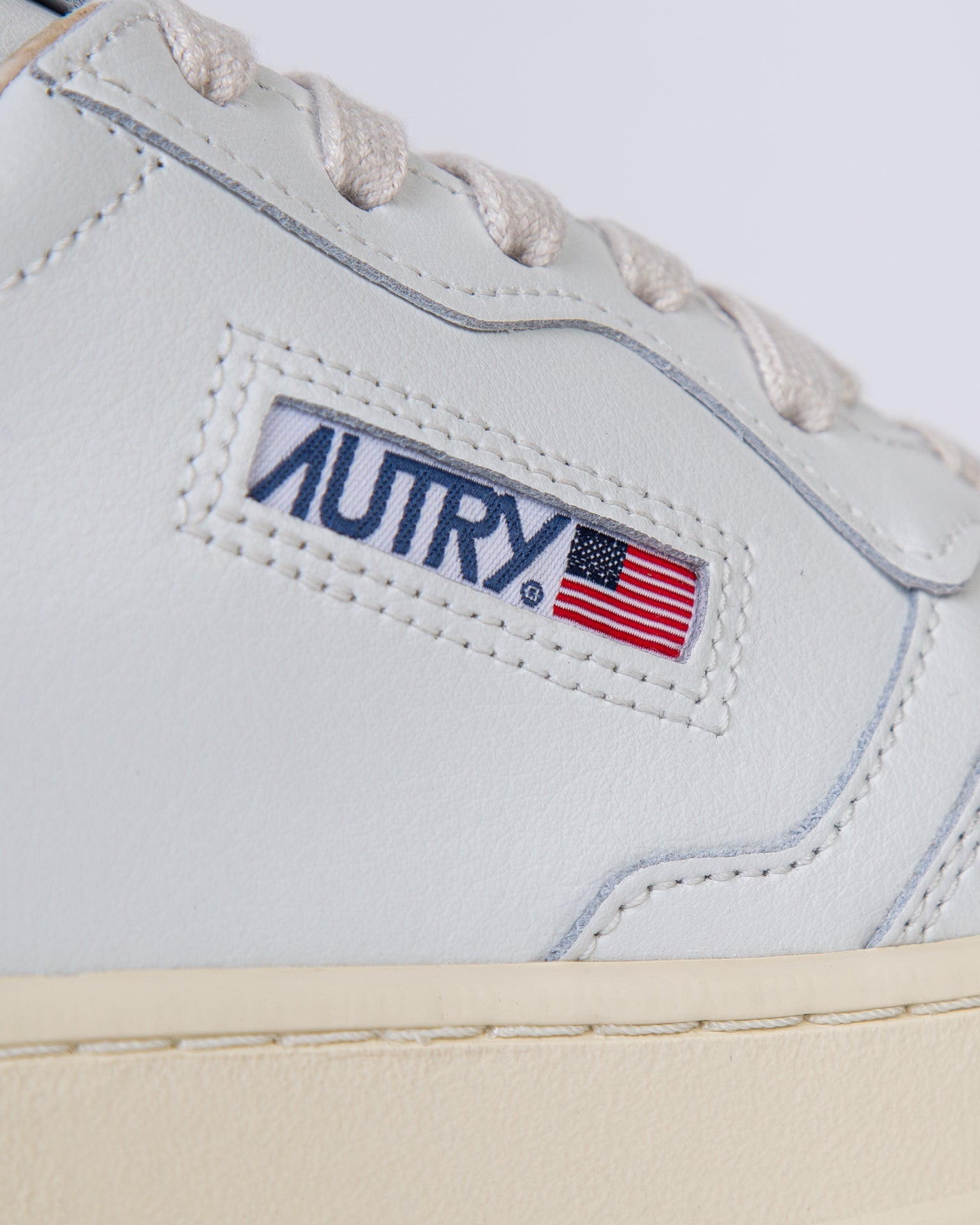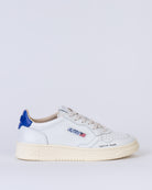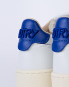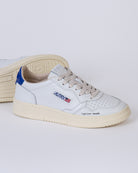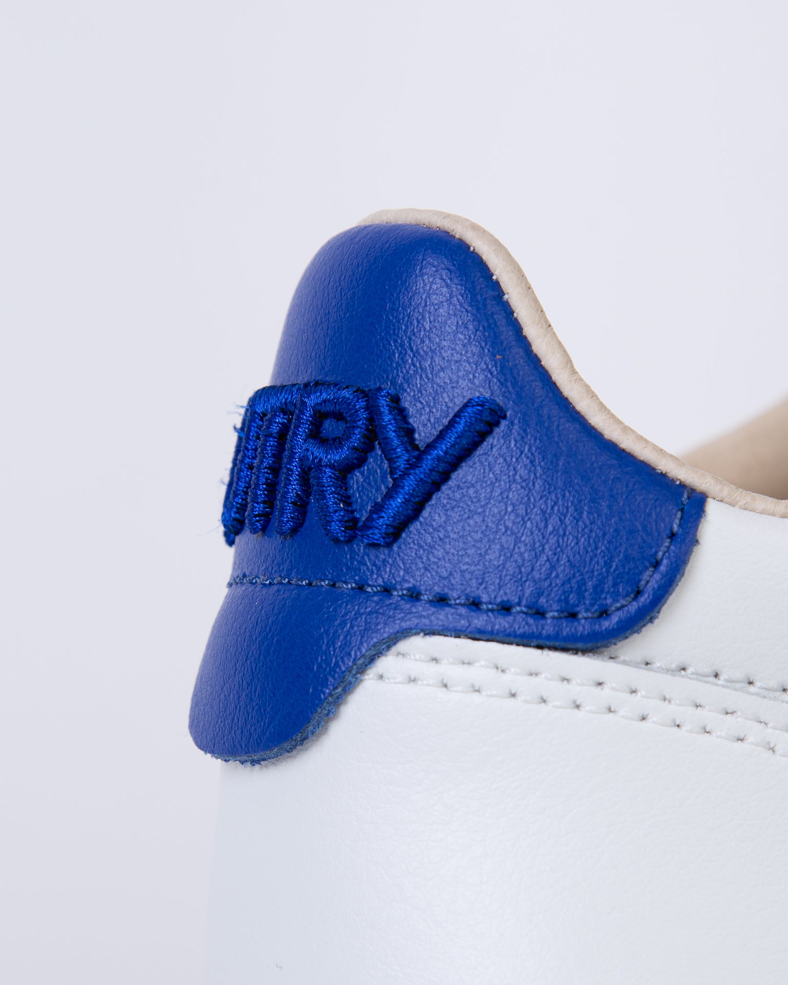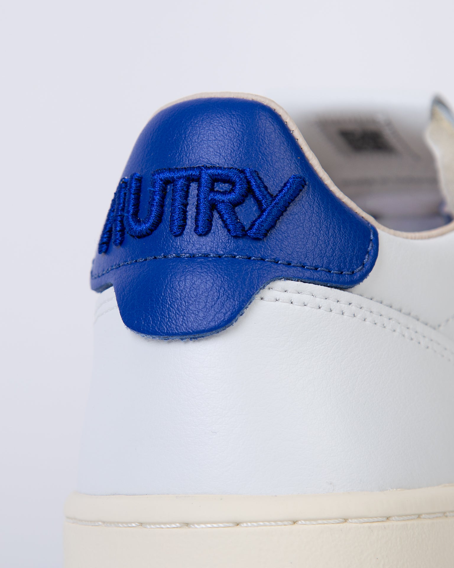 Autry, sneakers uomo AULM-DL 01 bianca e blu, tomaia in pelle e talloncino blu con logo in rilievo, scritta sulla punta. La scarpa scattata è una taglia 43
