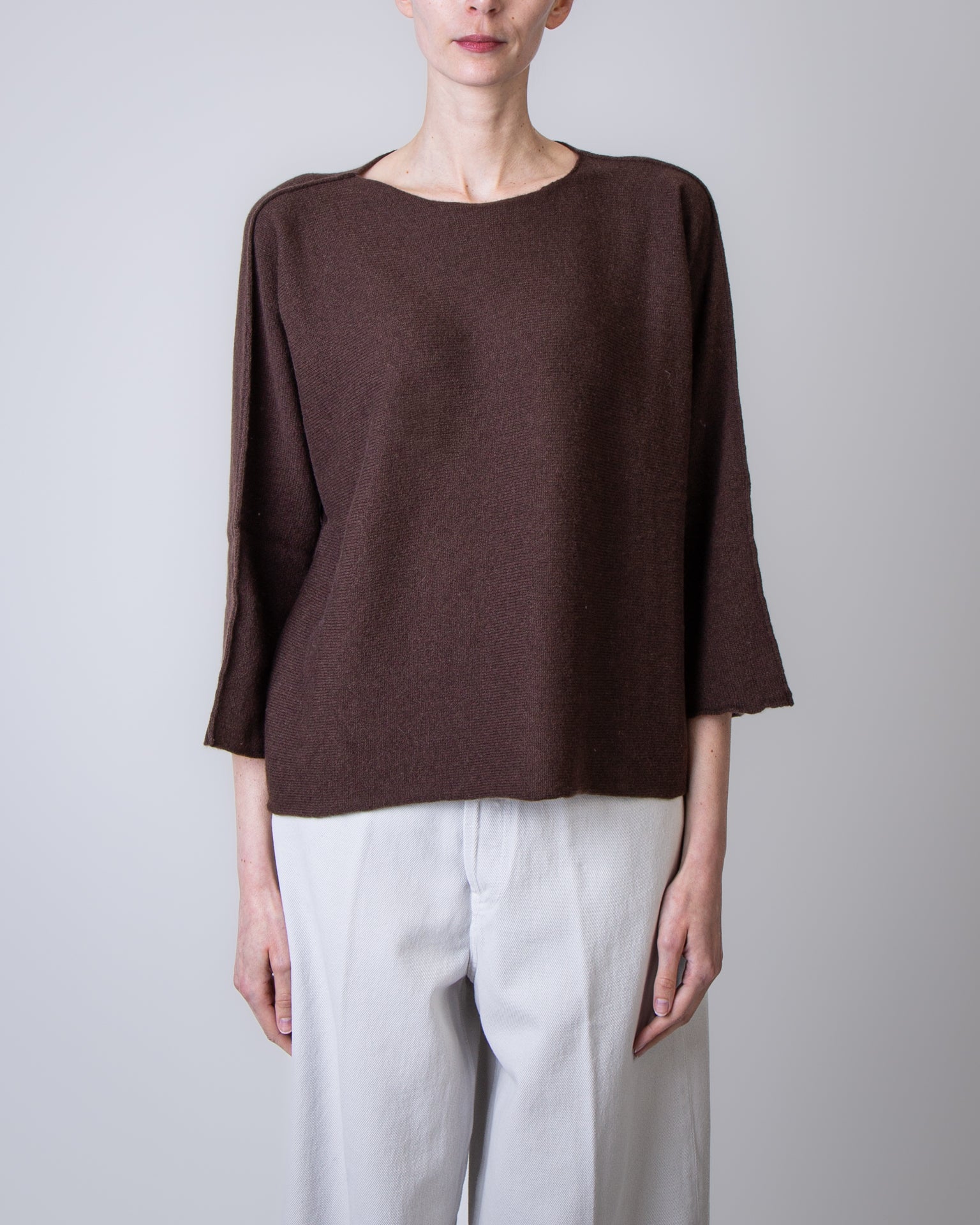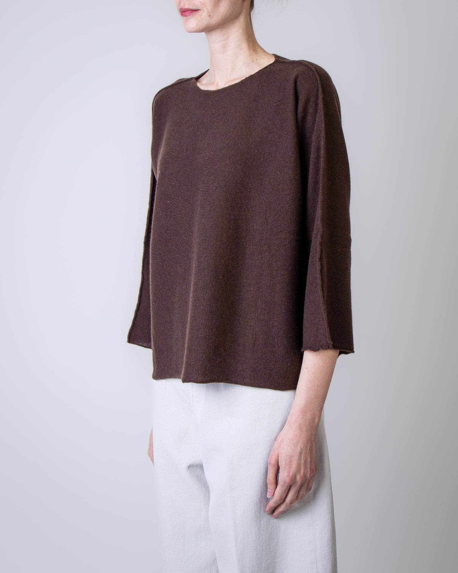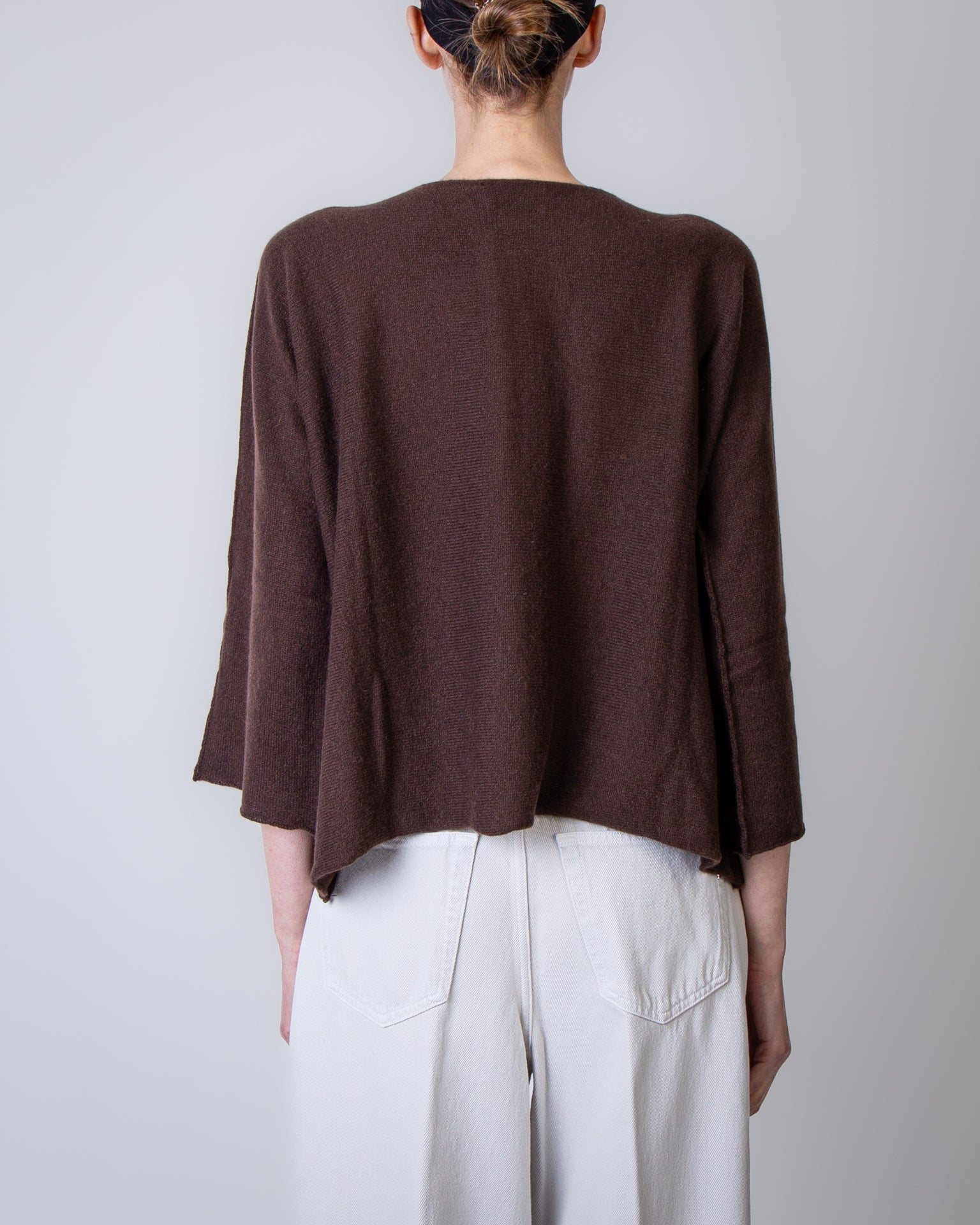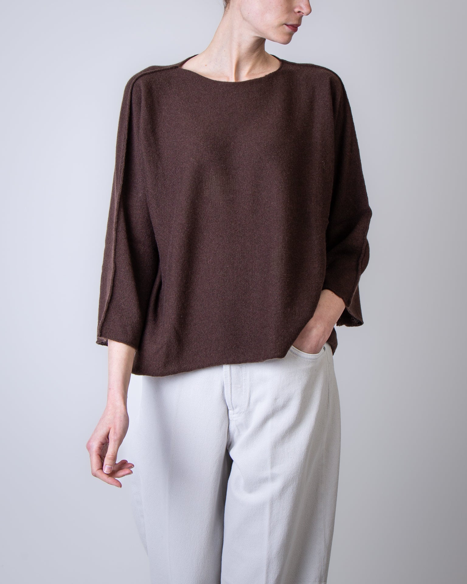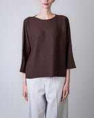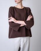 Be You, maglia donna MVD45B6 243 marrone, round neck modello benedicta. La modella è alta 175cm e indossa la taglia S/M