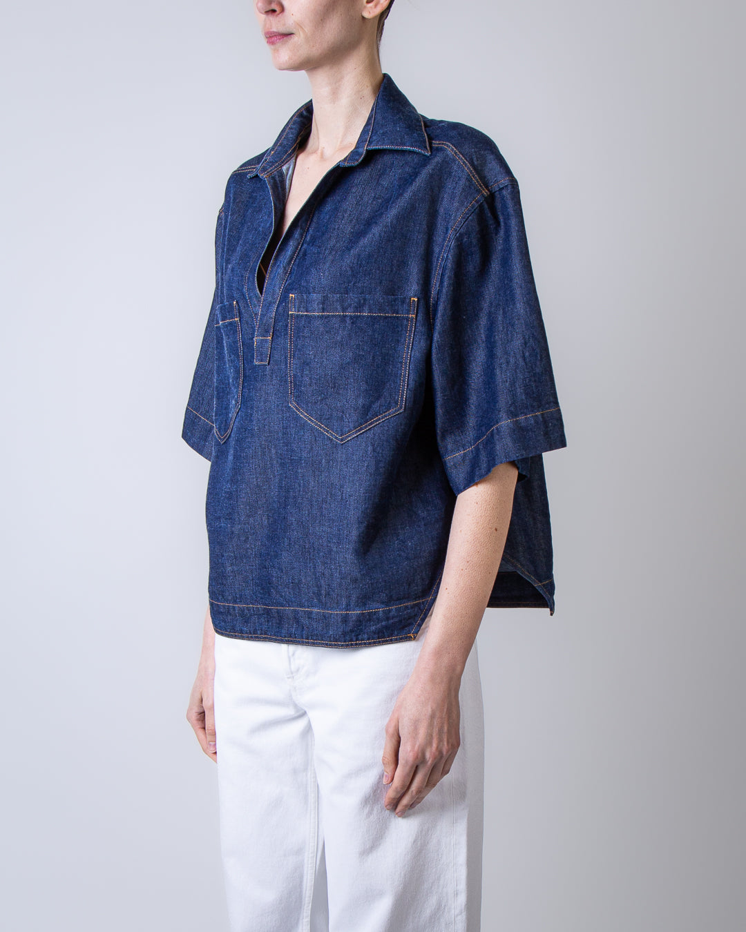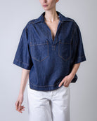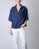 Dondup, camicia donna DC458 DF0266D MC4 800 blu, camicia in denim con scollo a V e due tasche sul petto. La modella è alta 175cm e indossa la taglia 40