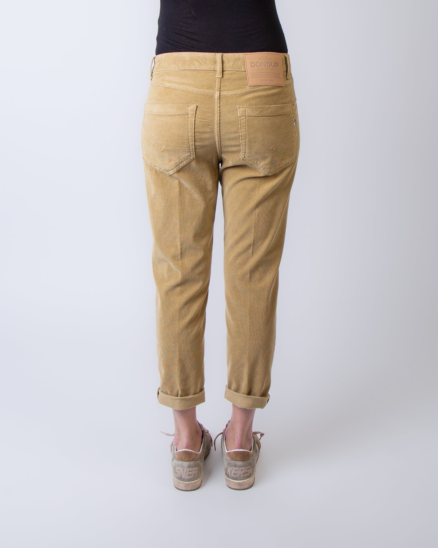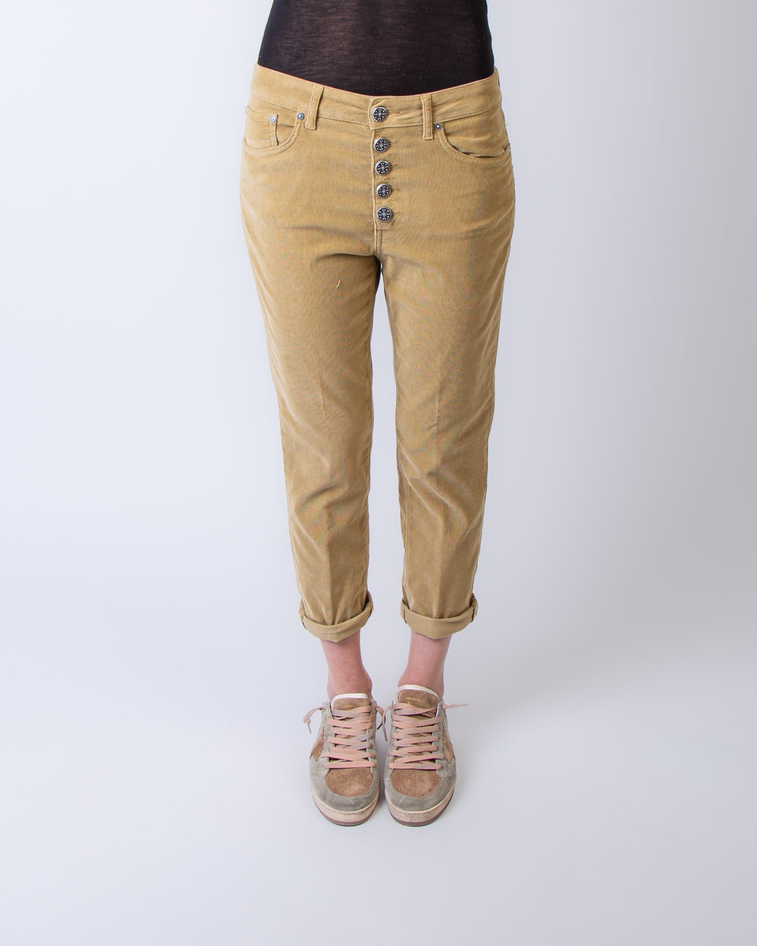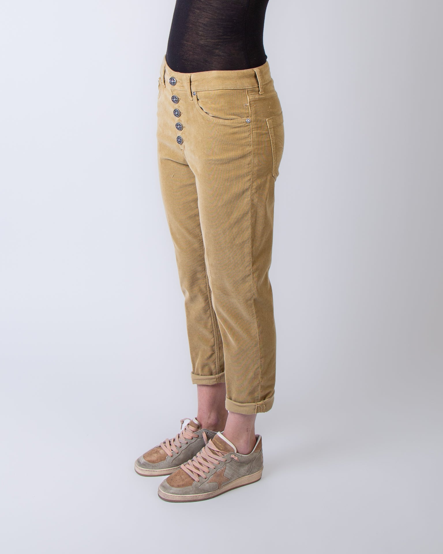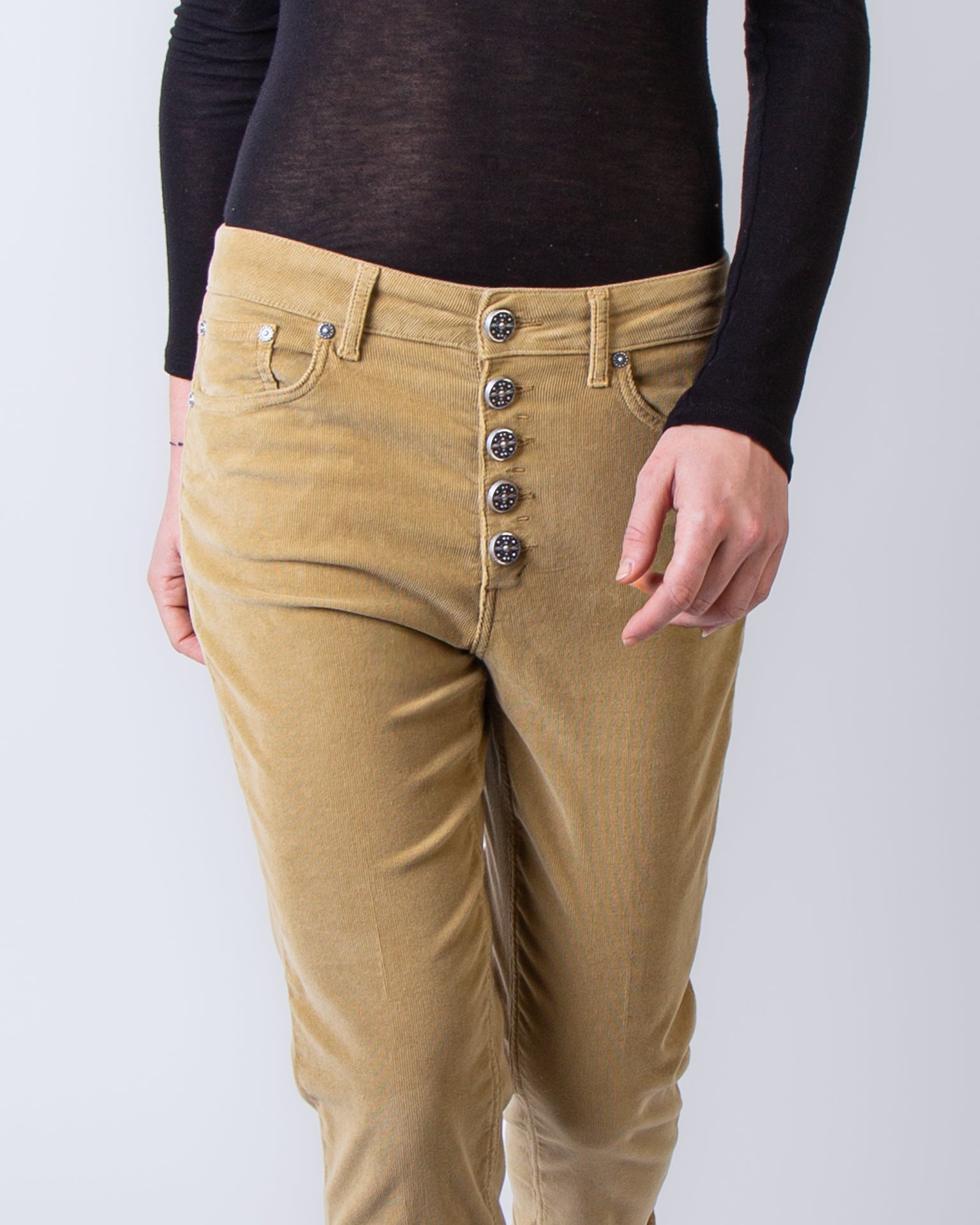 Dondup, jeans donna DP268B VS0030D BM5 026 senape, koon bottone gioiello. La modella è alta 175 cm e indossa una taglia 26