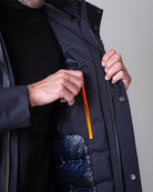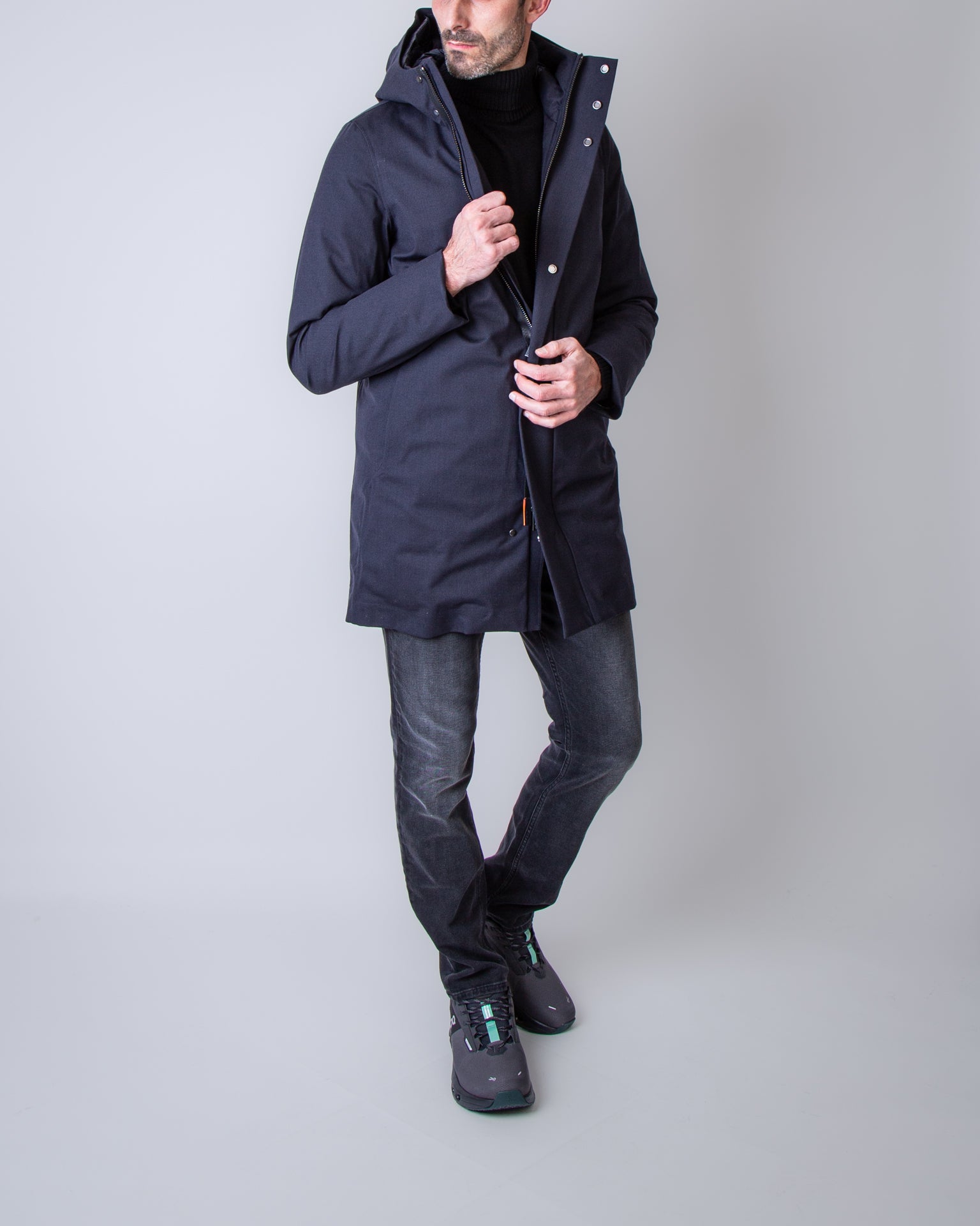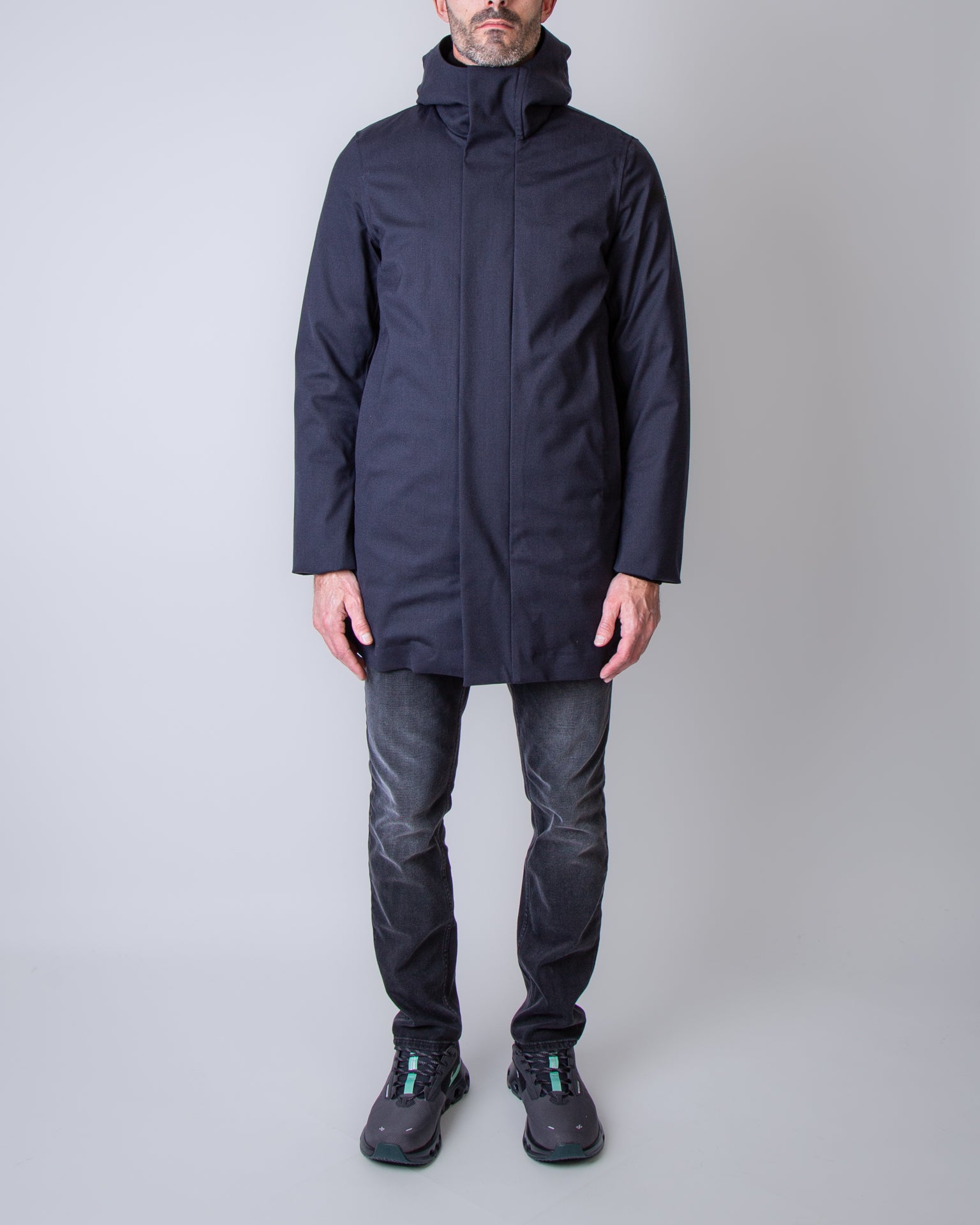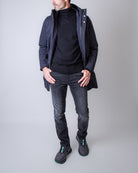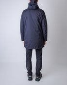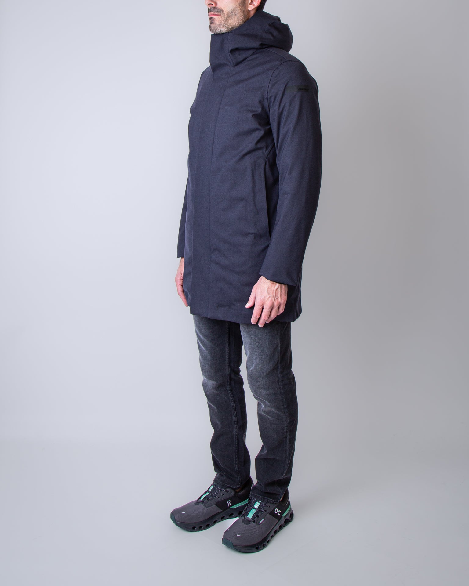 RRD, piumino uomo W25019 60 blu, terziglio eskimo, cappuccio, floating jkt, lana accoppiata e nastrata. Il modello è alto 186 cm e indossa la taglia 50