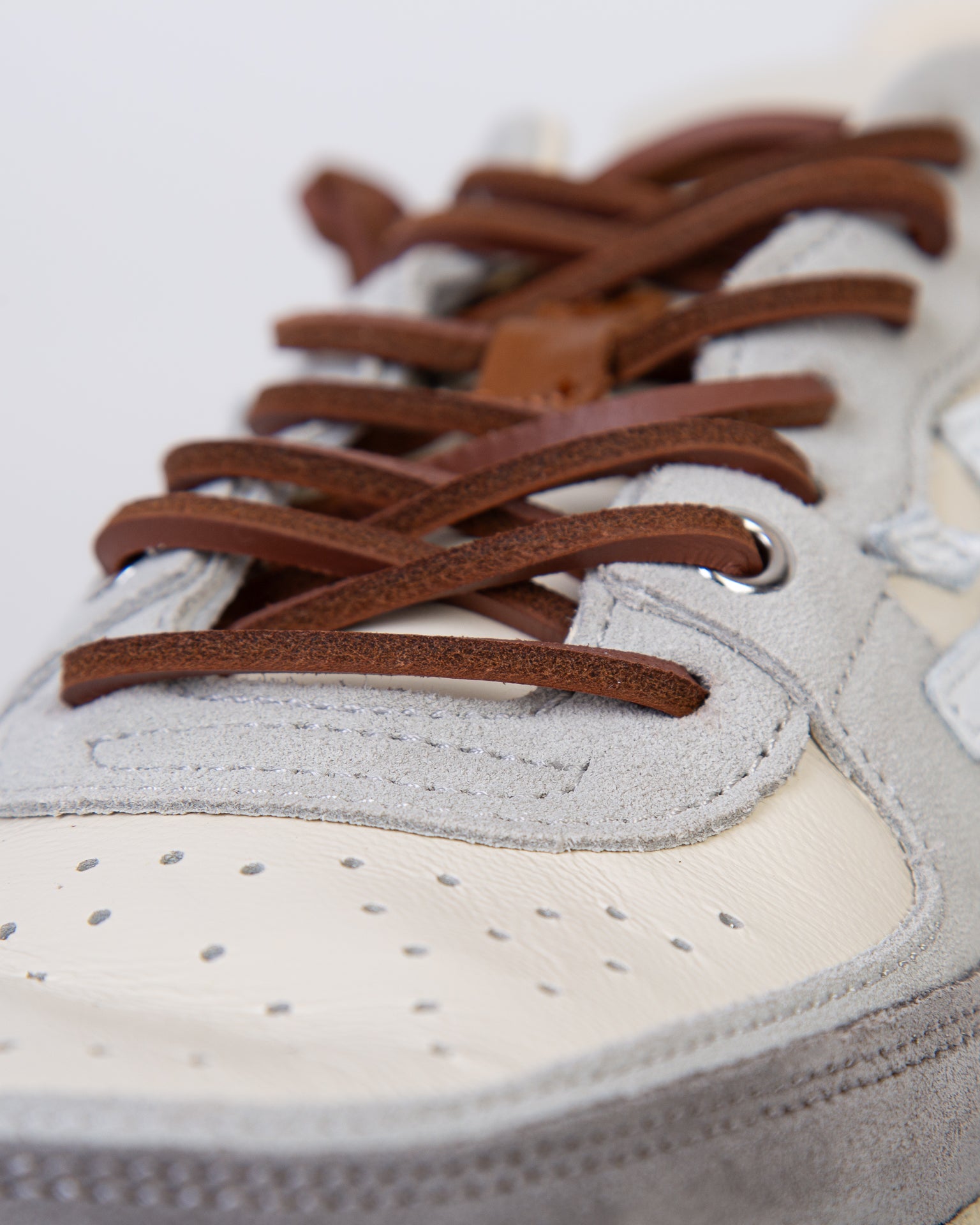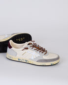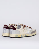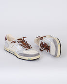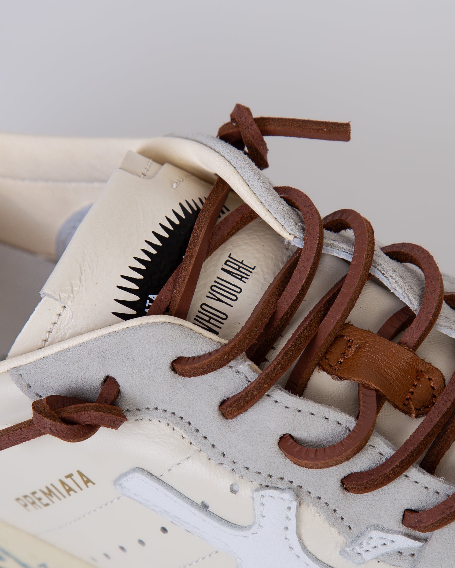 White Premiata, sneakers uomo BSKT CLAY 7616 bianco, iconico talloncino sul retro con logo impresso, lacci a contrasto marroni. La scarpa scattata è una taglia 43